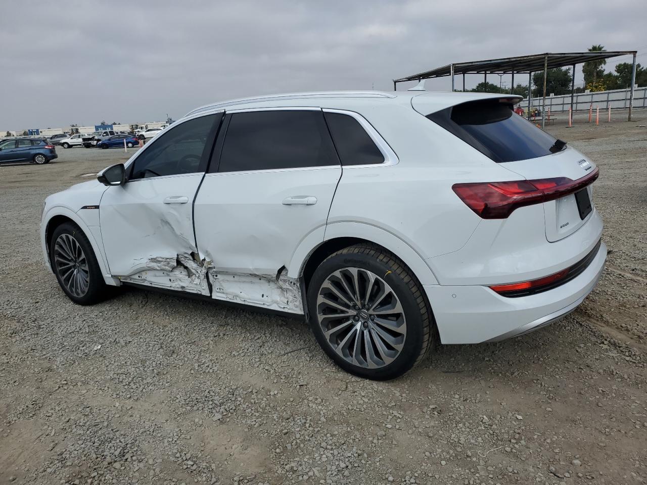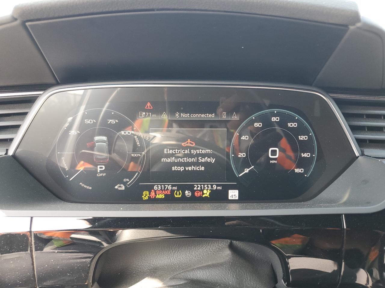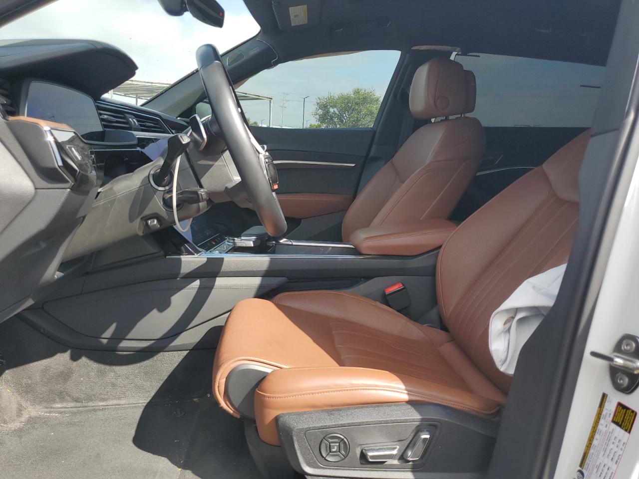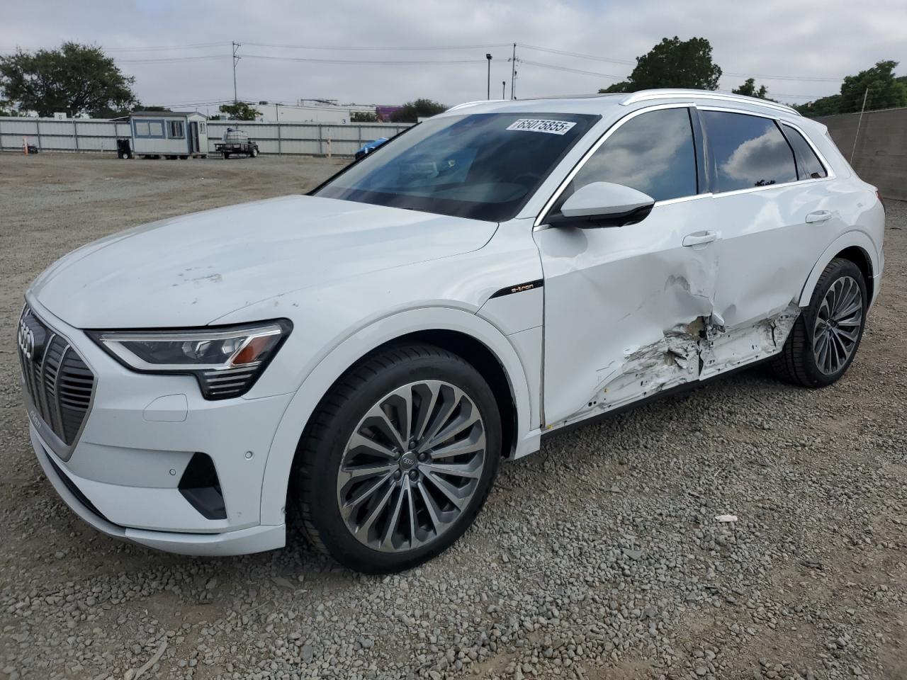 FairThe white AUDI E-TRON PRE 2019 exhibits significant side body damage. The exterior shows noticeable dents and scrapes on the driver's side. The interior appears to be in relatively good condition with some wear and tear, but no significant damage is immediately apparent, The vehicle's lights and glasses appear intact, but there are no visible damages .The car's wheels are fine. The interior features brown leather seats.