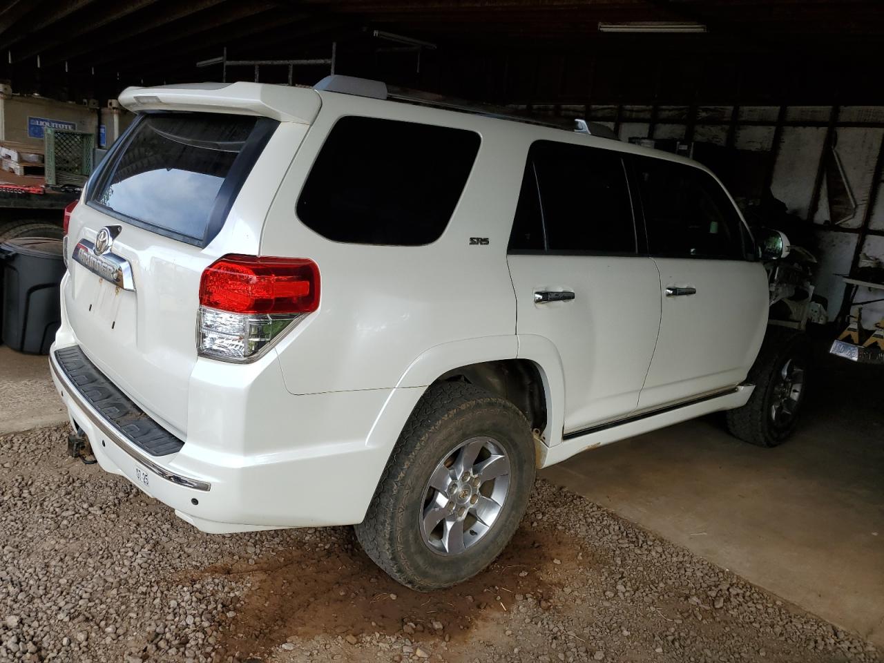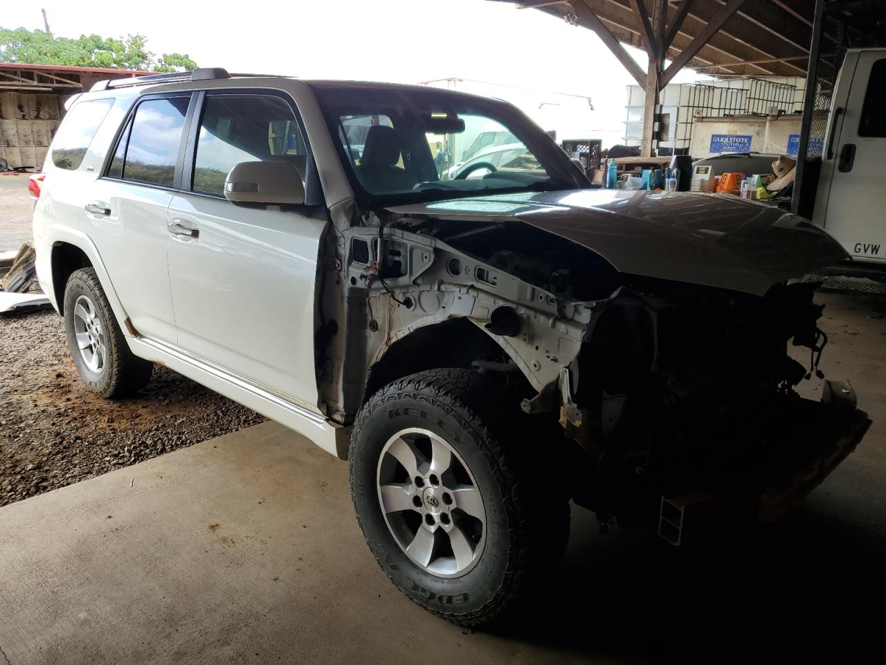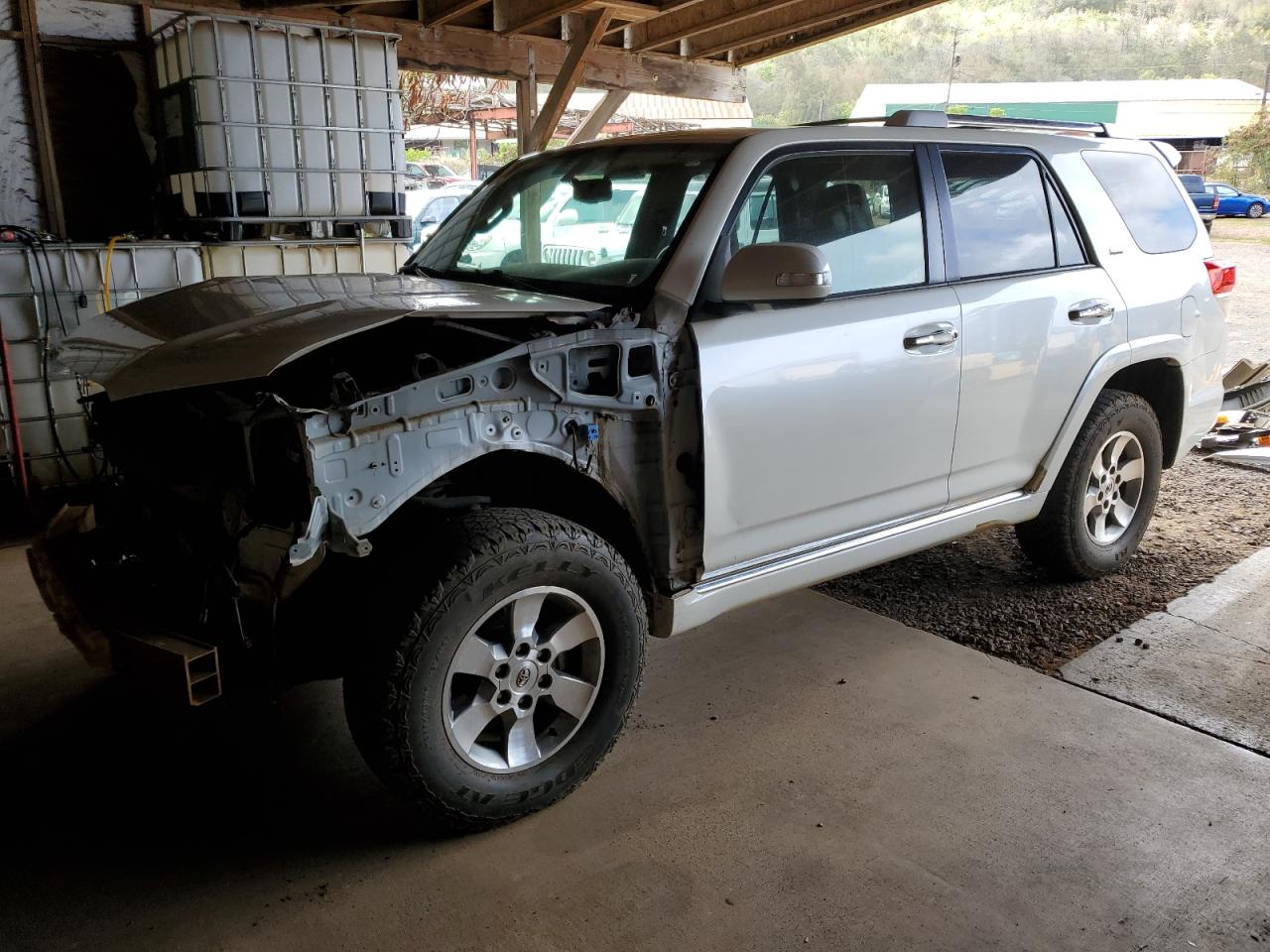 FairThe 2012 Toyota 4Runner SR is white. It has suffered significant front-end and rear-end damage. The front end is heavily damaged, with the bumper, hood, and fenders missing, exposing the engine compartment. The rear end shows damage to the bumper and tailgate. The wheels appear to be in good condition. The interior shows minimal wear and tear. The car starts and runs, verified by the "Run & Drive Verified" status.