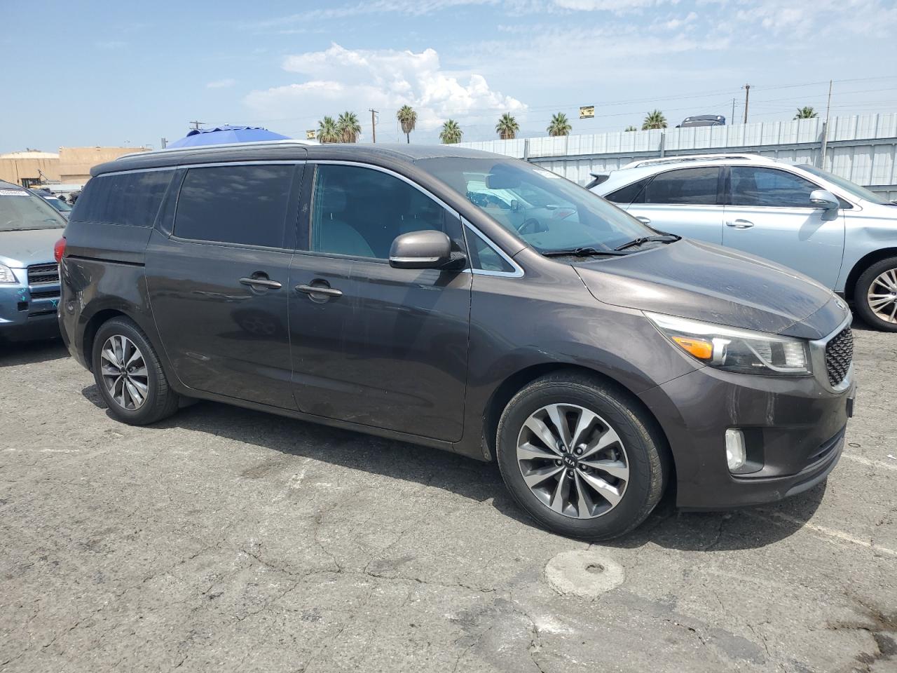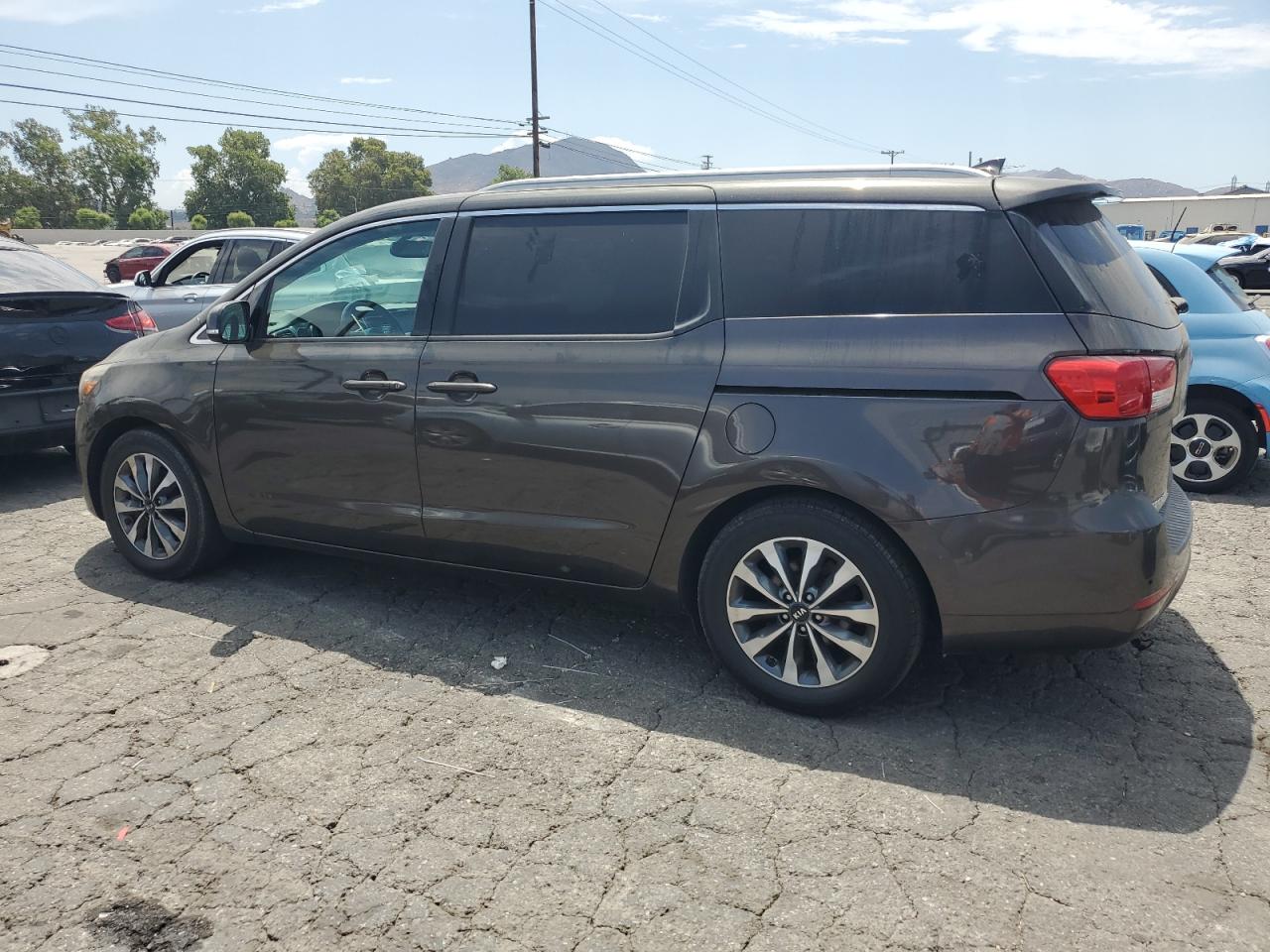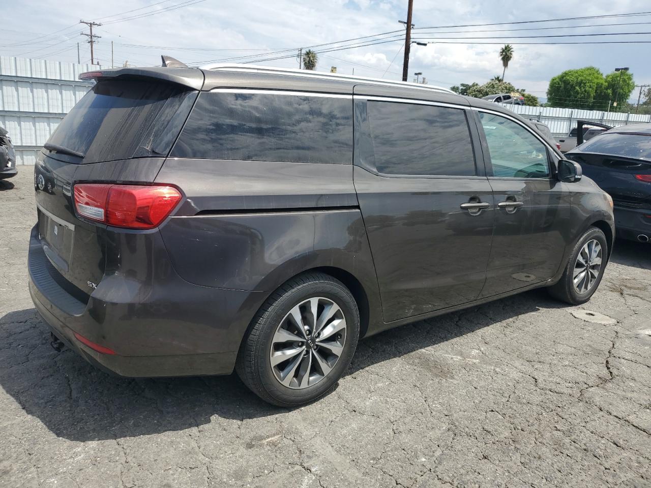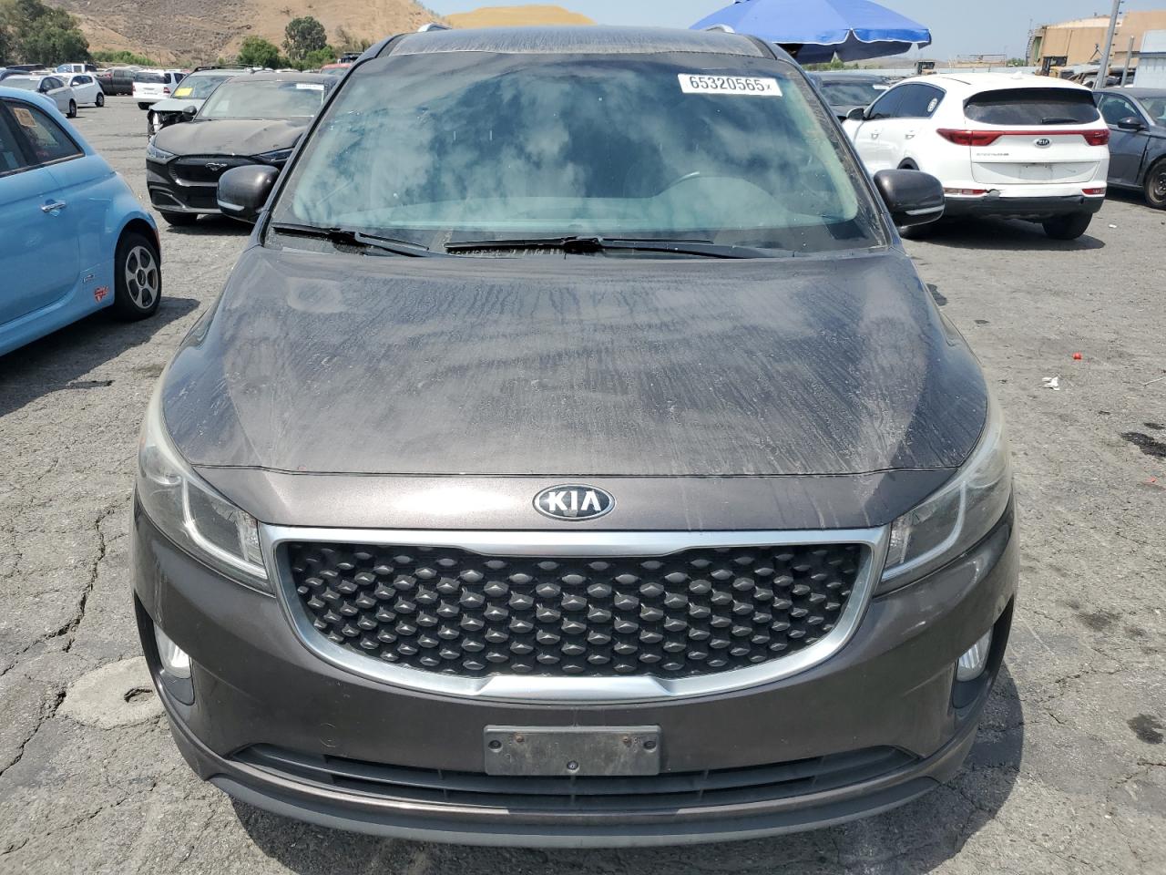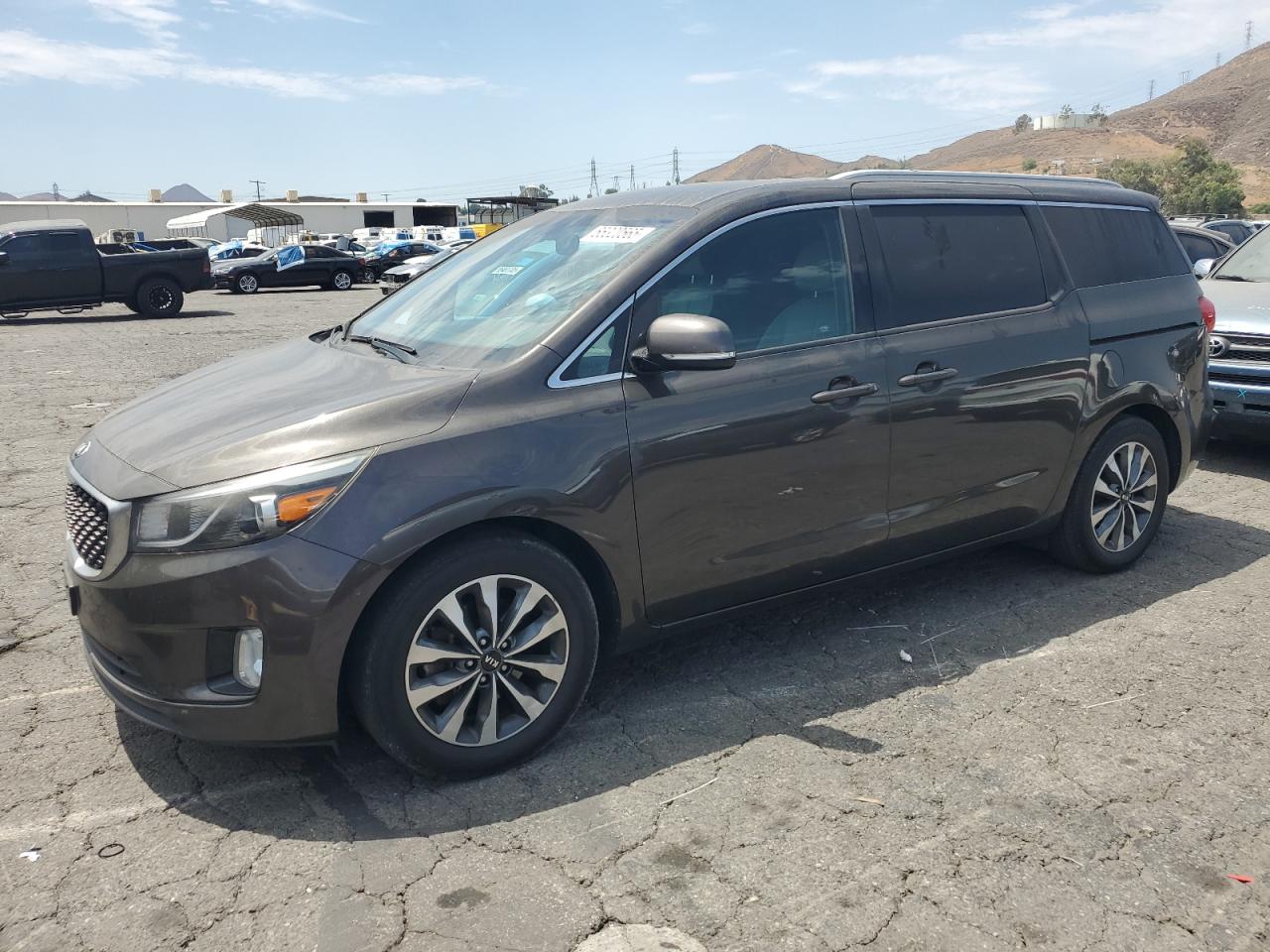 GoodThe 2015 KIA Sedona EX, a charcoal-colored minivan, exhibits minor cosmetic damage, primarily dents and scratches. The car is drivable, as indicated by the 'Run & Drive Verified' status, with no apparent secondary damage. The vehicle's wheels, lights, and glasses appear to be intact. Interior damage is present. The airbags are in good condition.