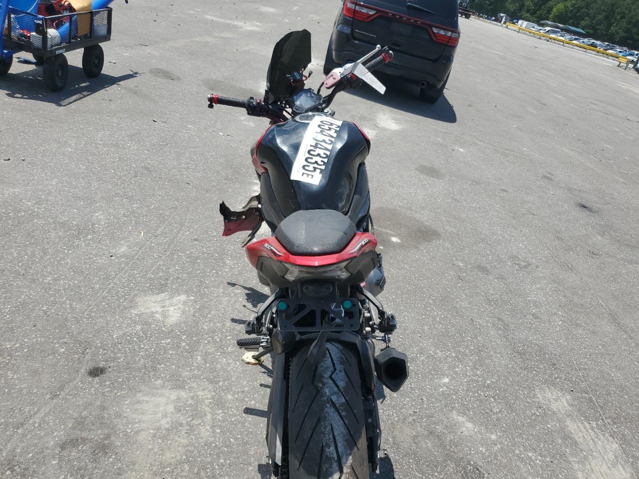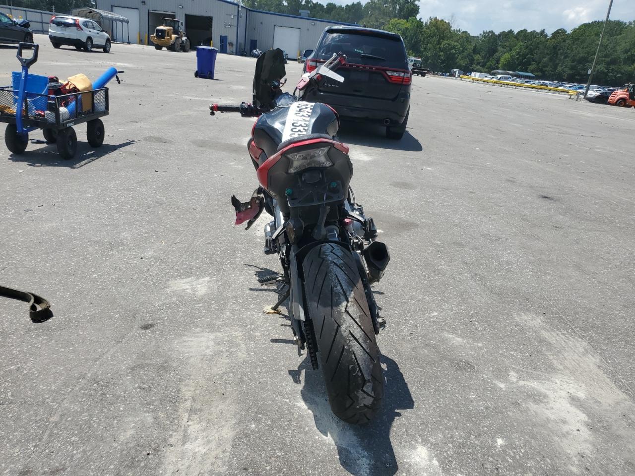 The motorcycle has damage to the body panels, with significant damage to the front end. No apparent damage is seen on the wheels and tire.