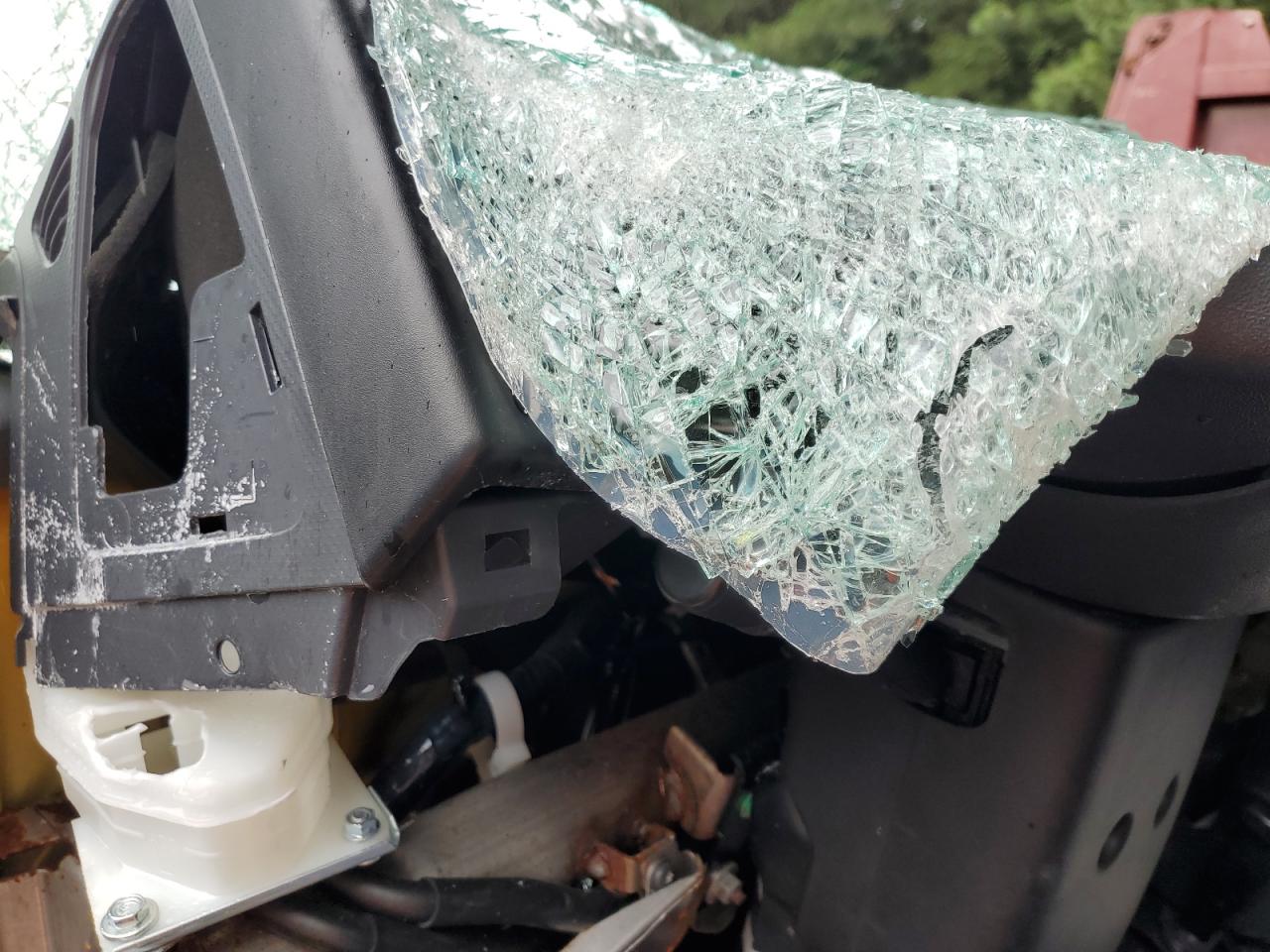 The primary damage is a major front-end collision. Secondary damage is related to the primary damage. The vehicle's front end is heavily compromised. Significant structural damage to the cab and body panels. The windshield is shattered, there is damage to the interior, with dashboard and seats damaged. Wheels are likely intact. There is no damage to mechanical parts.