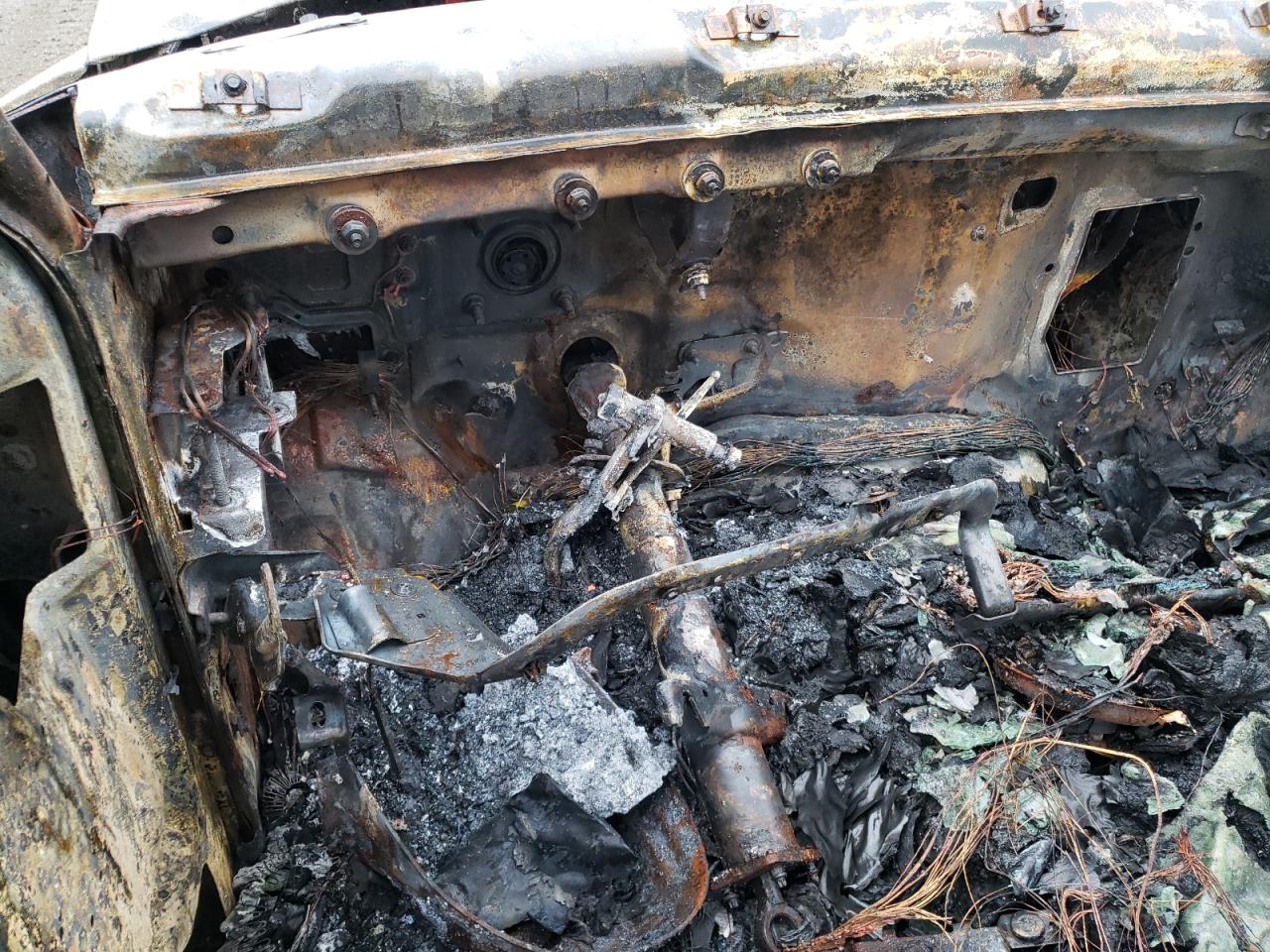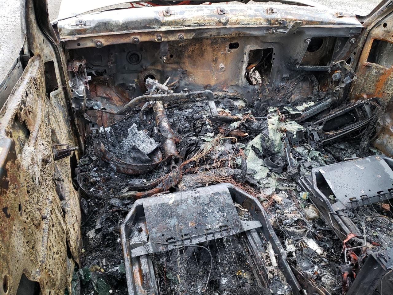 Extensive fire damage to the body, interior, and components. Charring, melting, and structural damage are widespread.