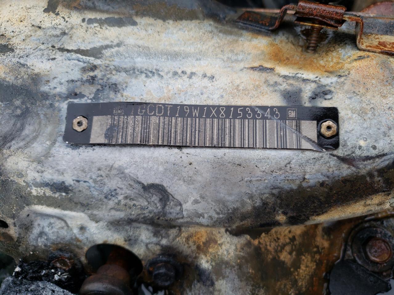 PoorThe 1999 CHEVROLET S TRUCK S1, a red pickup, has sustained significant damage from a fire. The entire body of the truck is extensively charred, with the paint severely burned and the metal structure warped. The wheels show signs of fire damage, but their exact condition is unclear. The lights and glasses are completely destroyed. The interior is also heavily damaged, with the seats, dashboard, and all internal components burned and melted. The airbags are likely deployed or destroyed due to the intensity of the fire. The overall condition of the truck is poor, rendering it undrivable and in need of extensive repairs or total replacement.