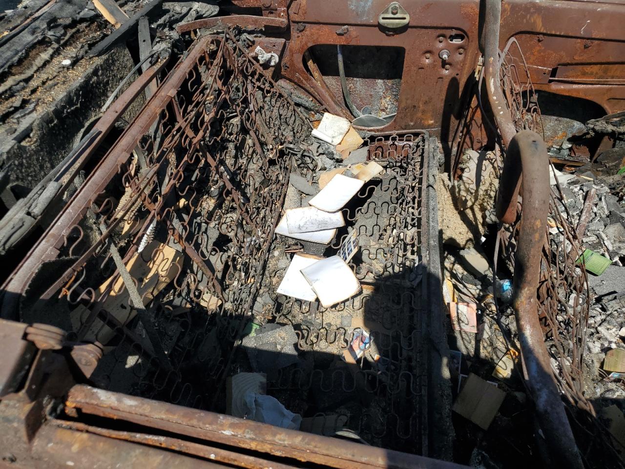 Burn damage across the entire vehicle, with significant body panel distortion and interior destruction. The lights, glasses, and wheels are destroyed.