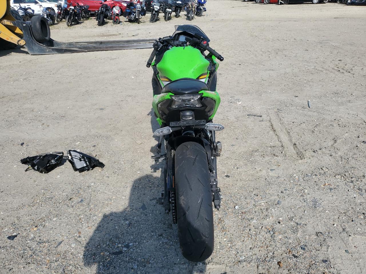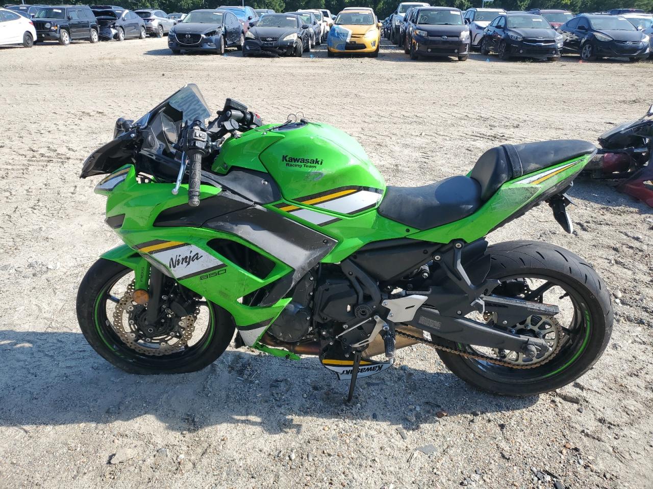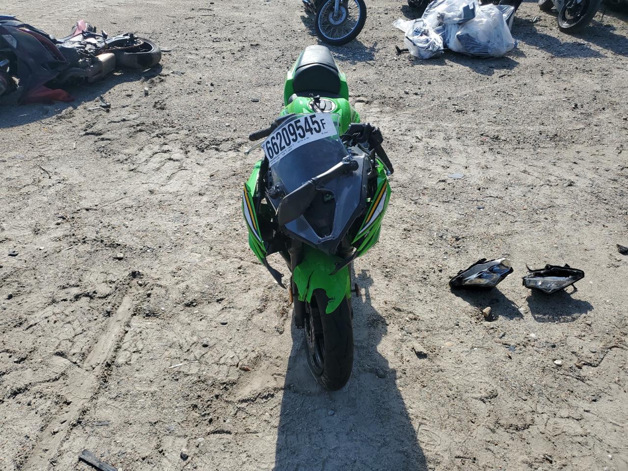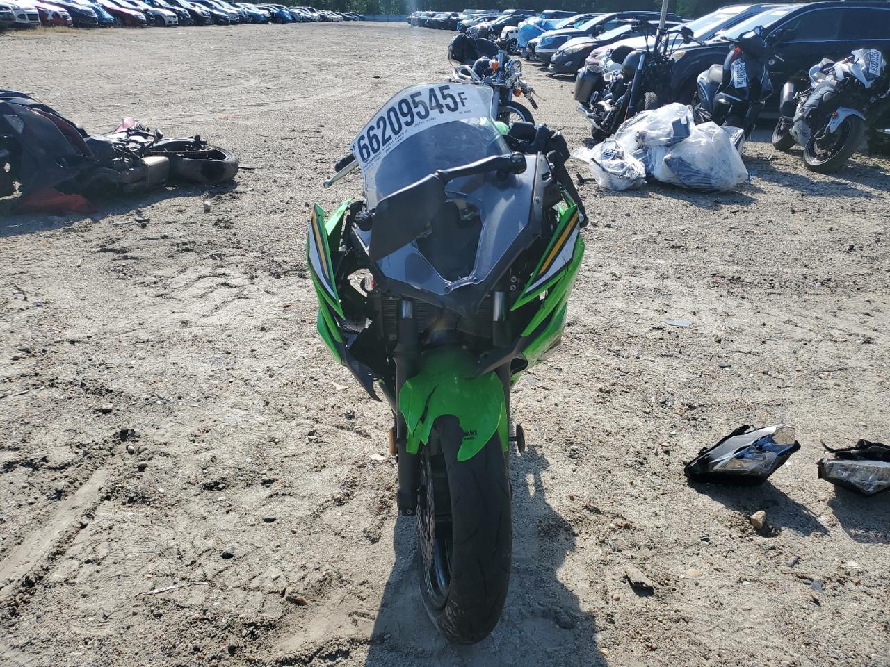 FairThe KAWASAKI EX650 P 2025, colored green, presents with significant damage. The primary damage is all over, with no secondary damage noted. The front fairing and lights are heavily damaged. The wheels appear intact. Interior condition is Excellent. The vehicle is likely drivable, despite the body damage. This motorcycle has sustained substantial cosmetic and body damage, affecting its overall exterior condition. The front is severely damaged.