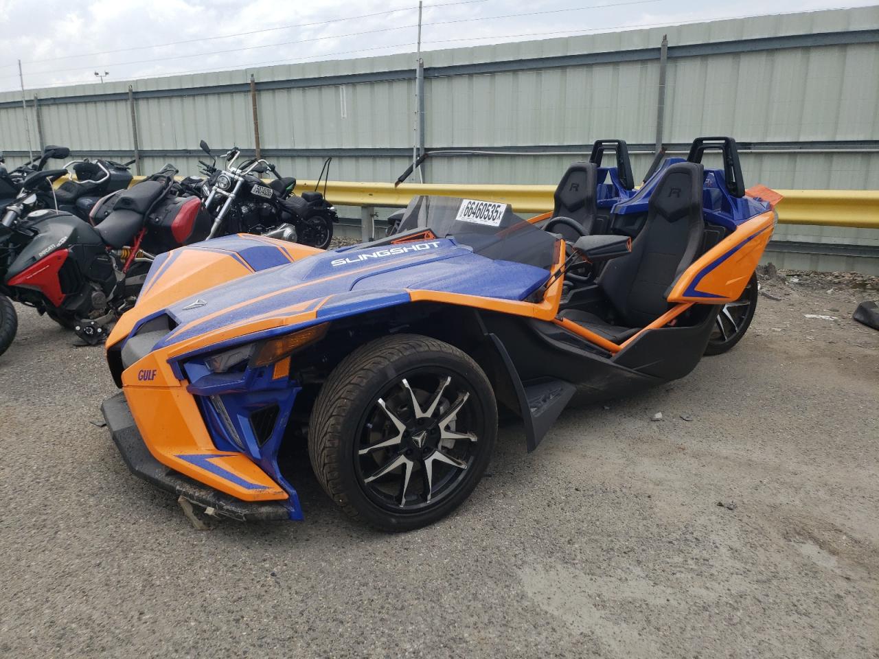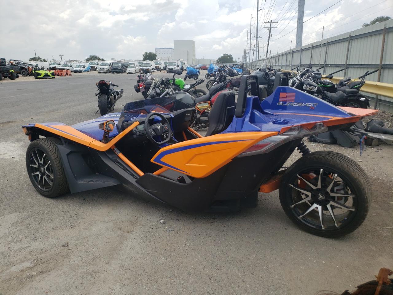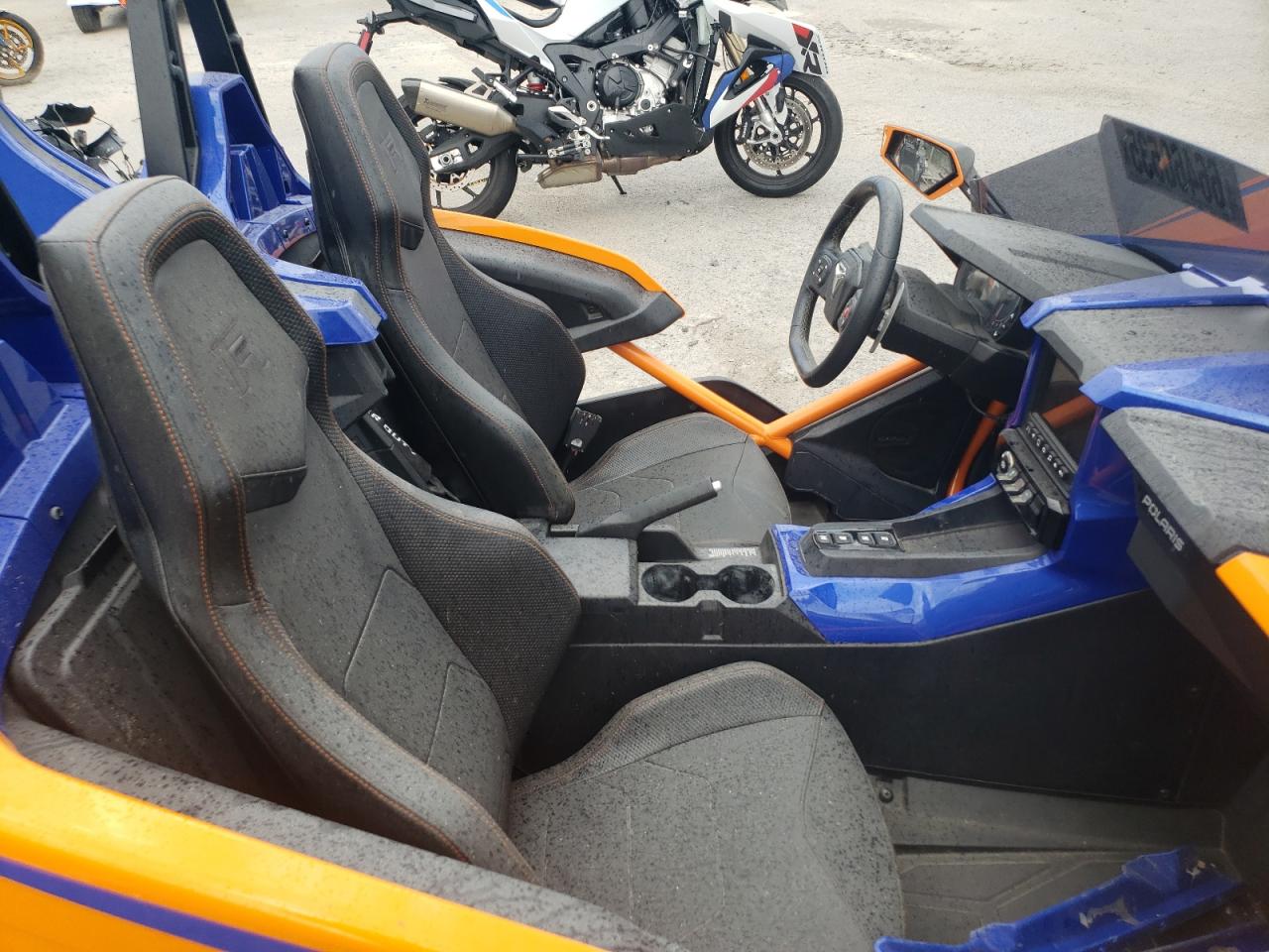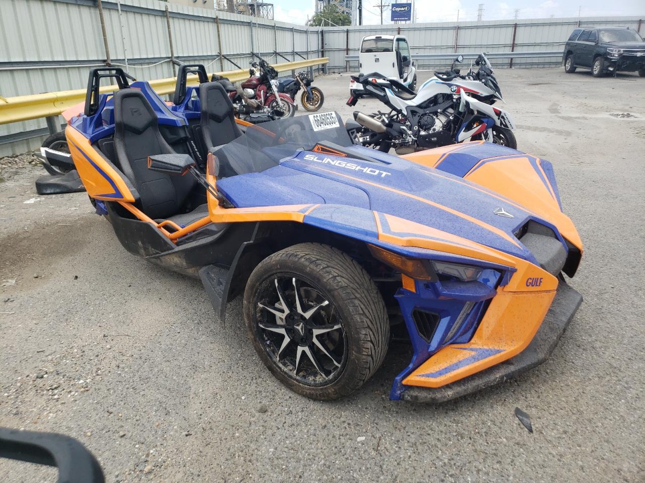 FairThis is a 2021 Polaris Slingshot, showcasing a vibrant blue and orange color scheme. The vehicle appears to have suffered mechanical damage, evident from the images. The overall condition is categorized as poor, indicating significant issues requiring considerable repair before the vehicle can be considered roadworthy. The interior also shows moderate damage consistent with the exterior state.