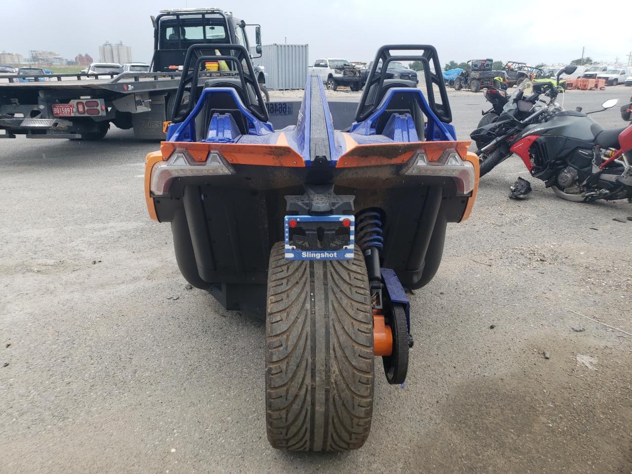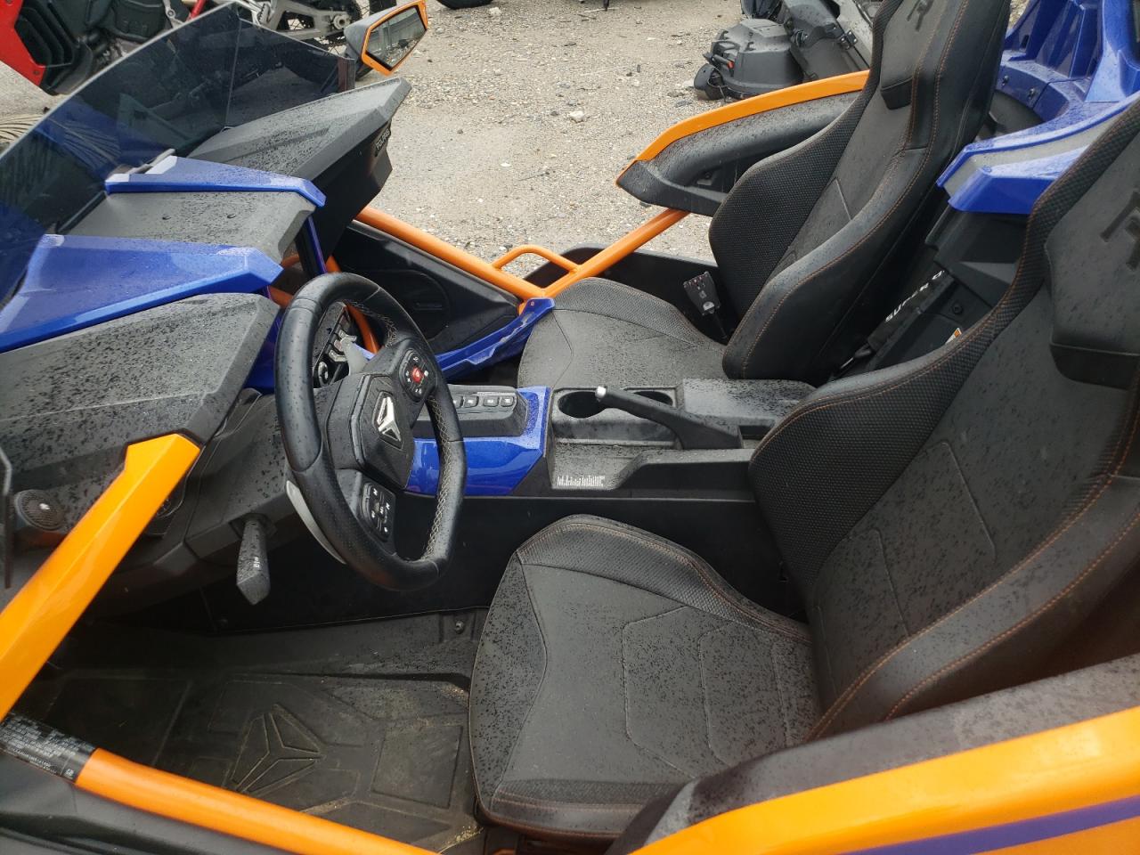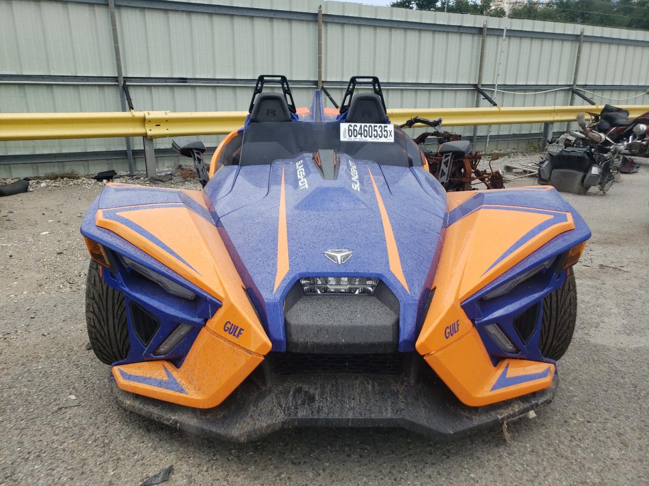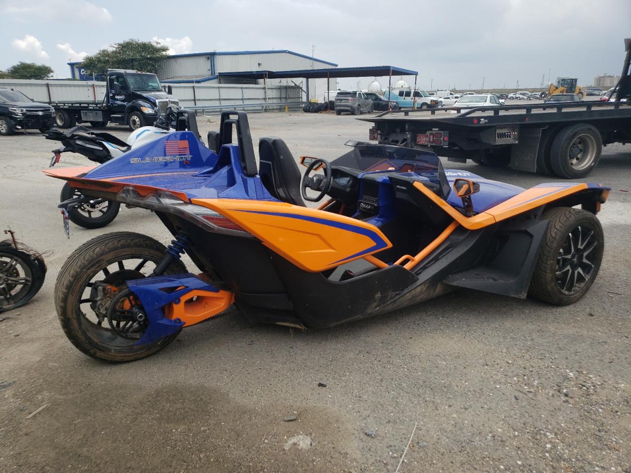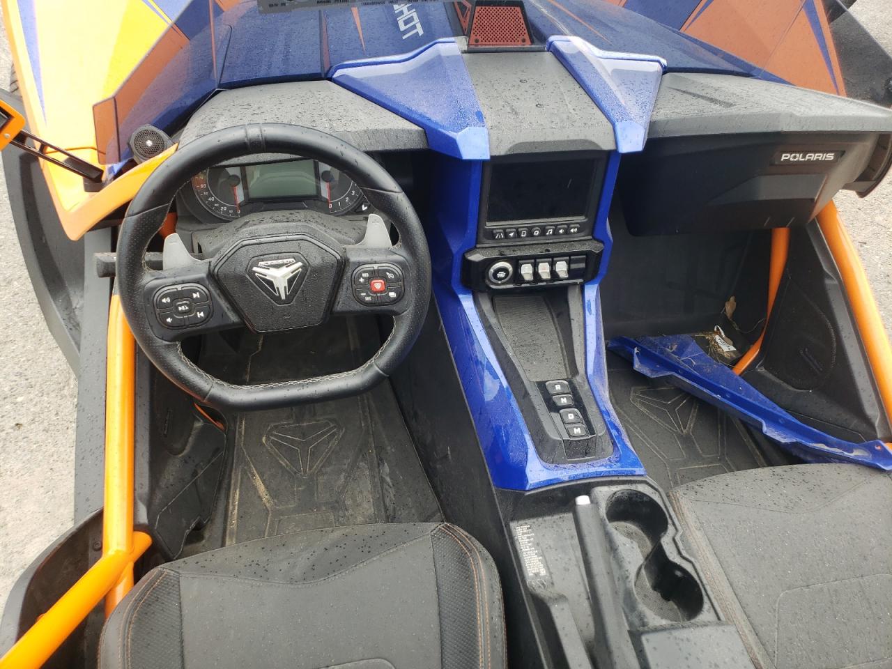 FairThis is a 2021 Polaris Slingshot, showcasing a vibrant blue and orange color scheme. The vehicle appears to have suffered mechanical damage, evident from the images. The overall condition is categorized as poor, indicating significant issues requiring considerable repair before the vehicle can be considered roadworthy. The interior also shows moderate damage consistent with the exterior state.