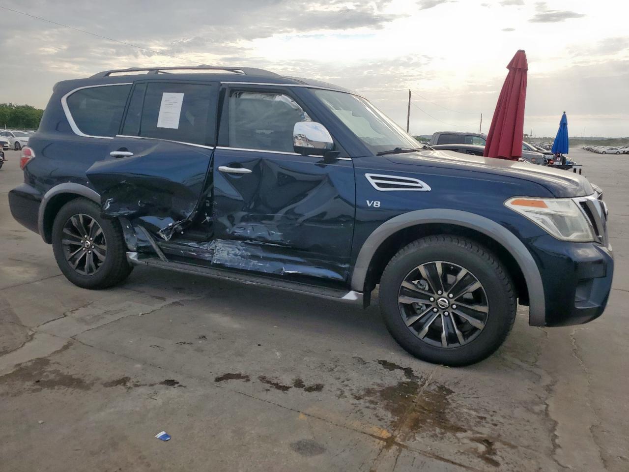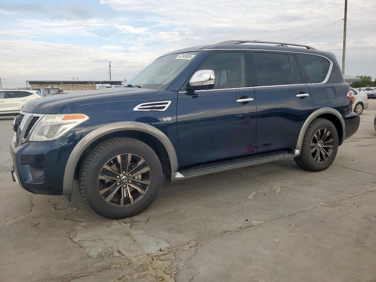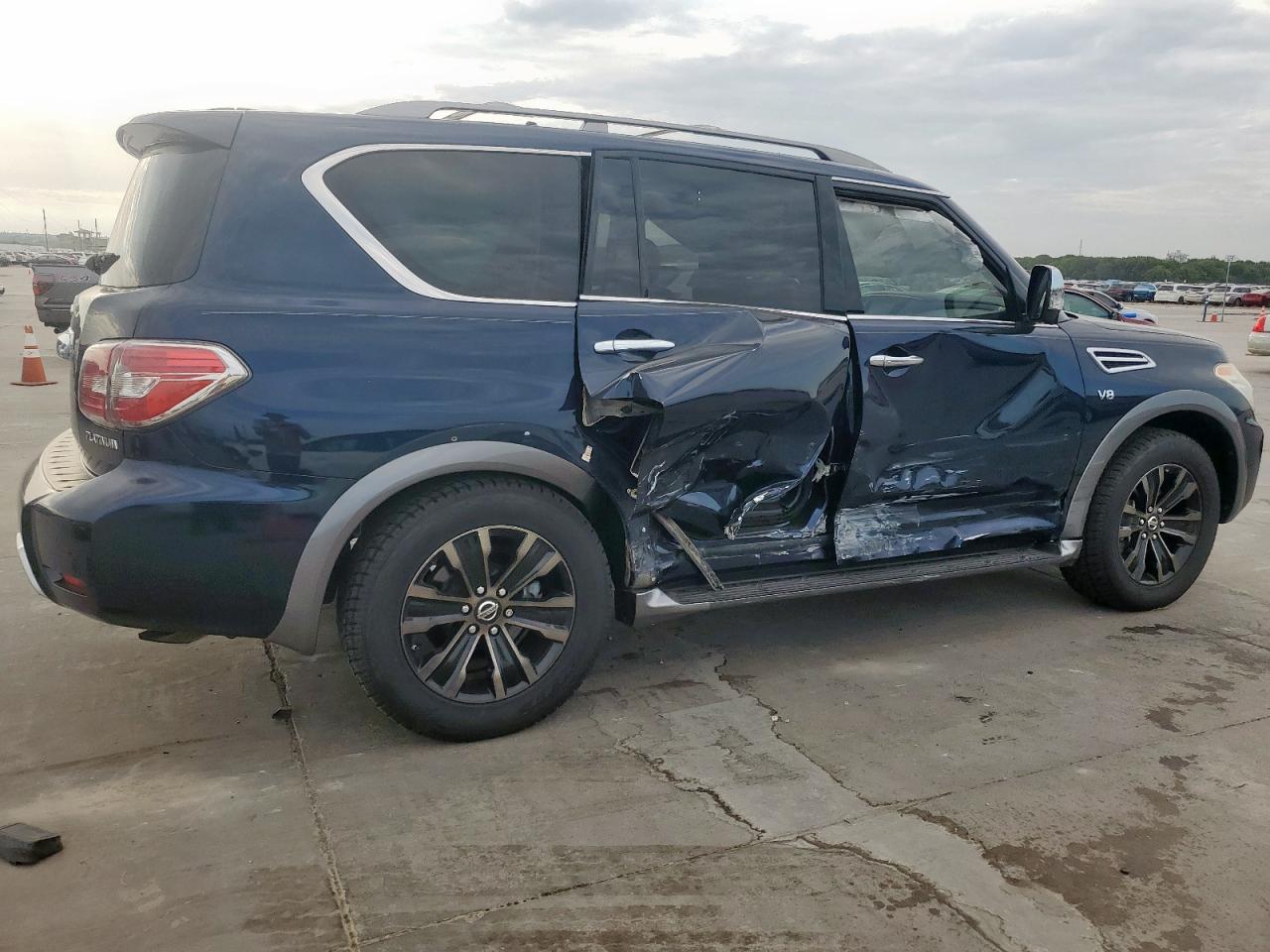 FairThis is a 2018 Nissan Armada Platinum with significant side body damage. The primary damage is on the side, with no secondary damage. The car is blue, and the starting code is DEFAULT. The wheels, lights, and glasses appear to be intact. The vehicle shows signs of moderate damage and may be drivable after repairs. Interior appears to be in good shape. Airbags status is unknown.