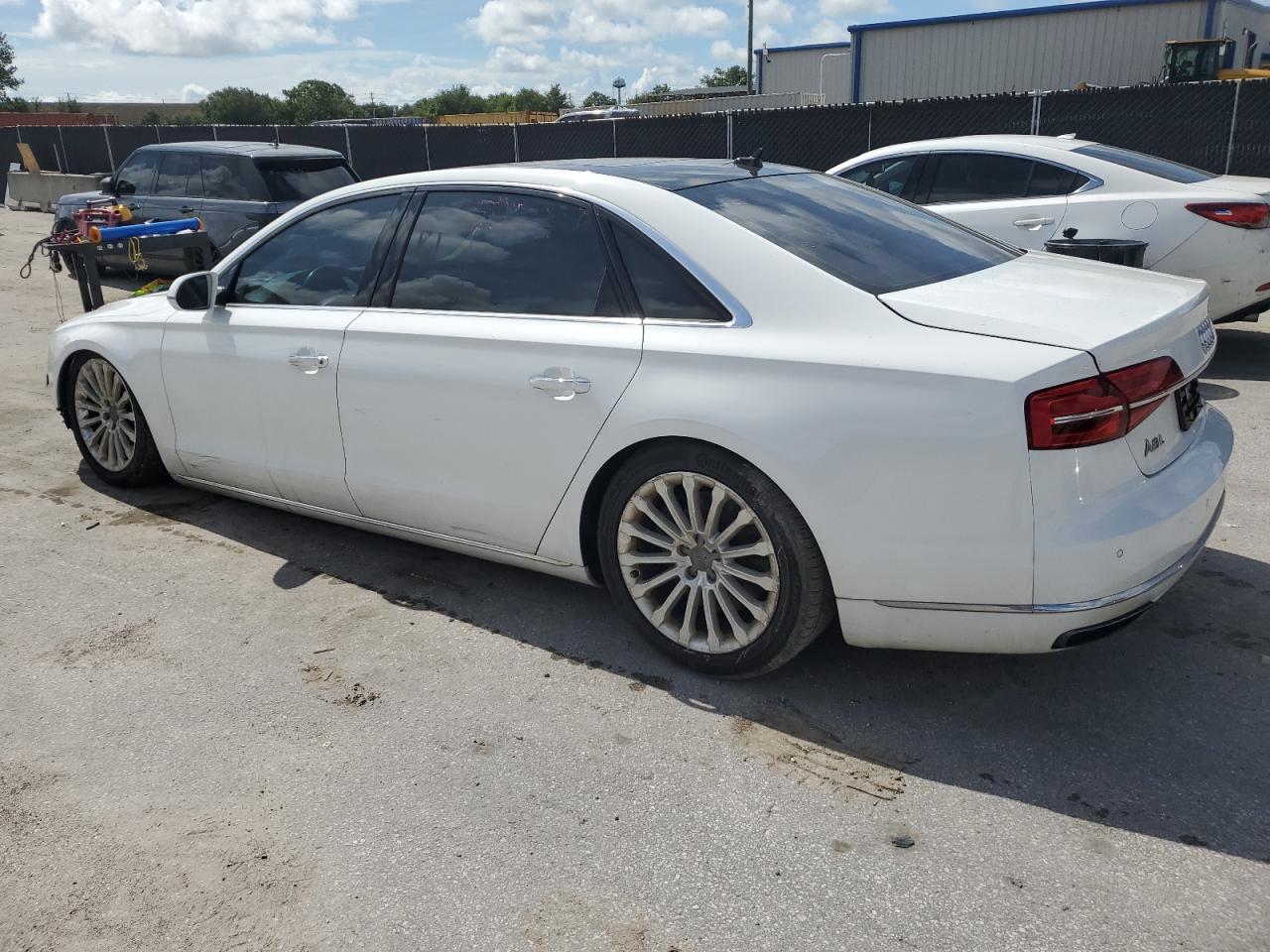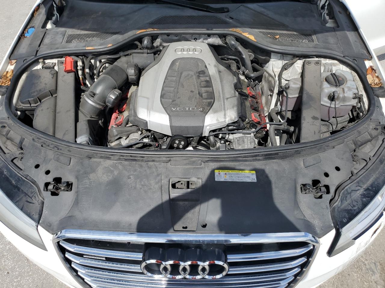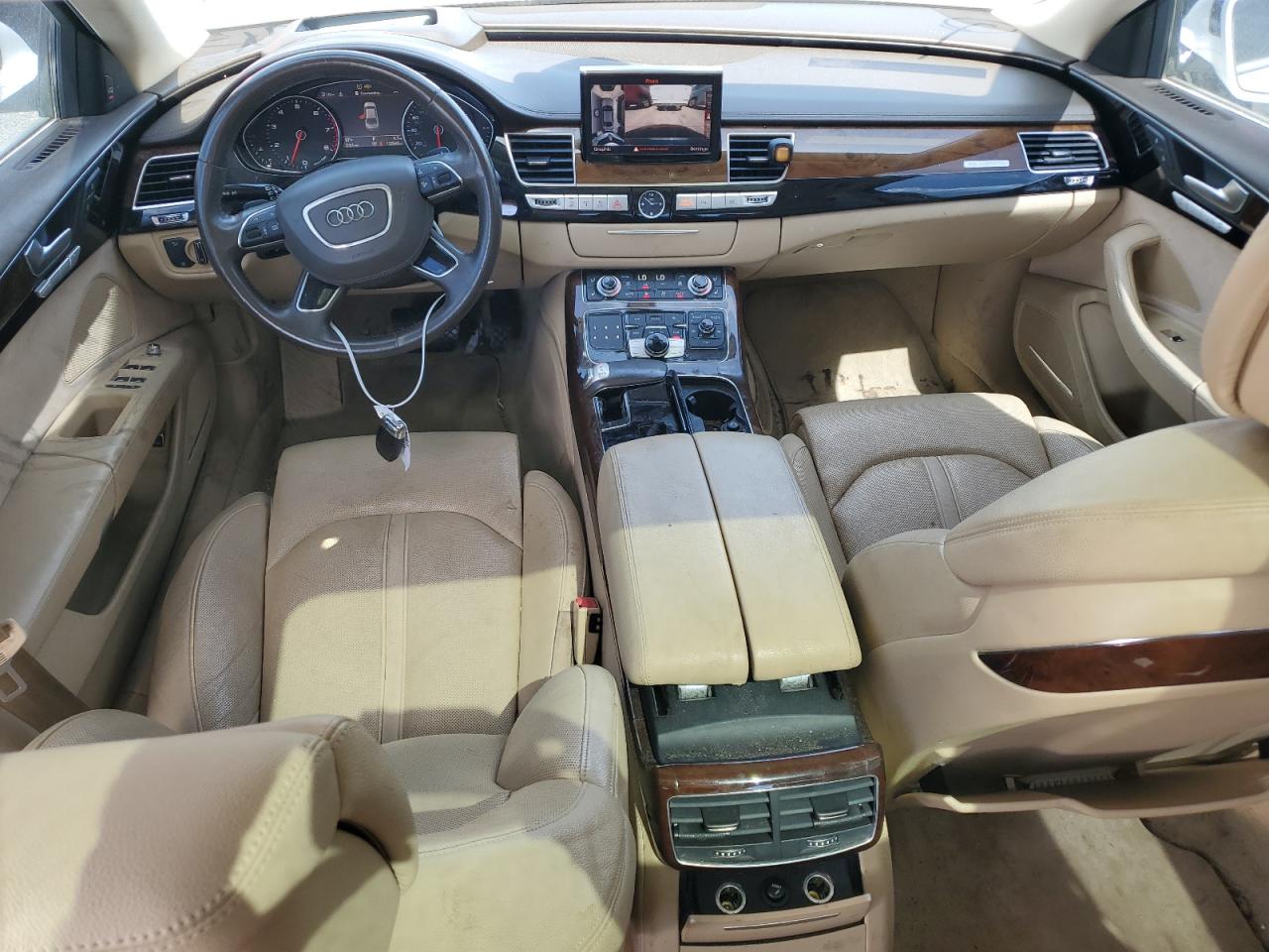 FairThe 2016 Audi A8 L Quattro is a luxury sedan with significant front-end damage. The primary damage is to the front end, affecting the body panels. The car is white with a black roof. The interior shows some wear and tear, but overall in good condition. The airbag warning light is on. The car is drivable despite the damage.