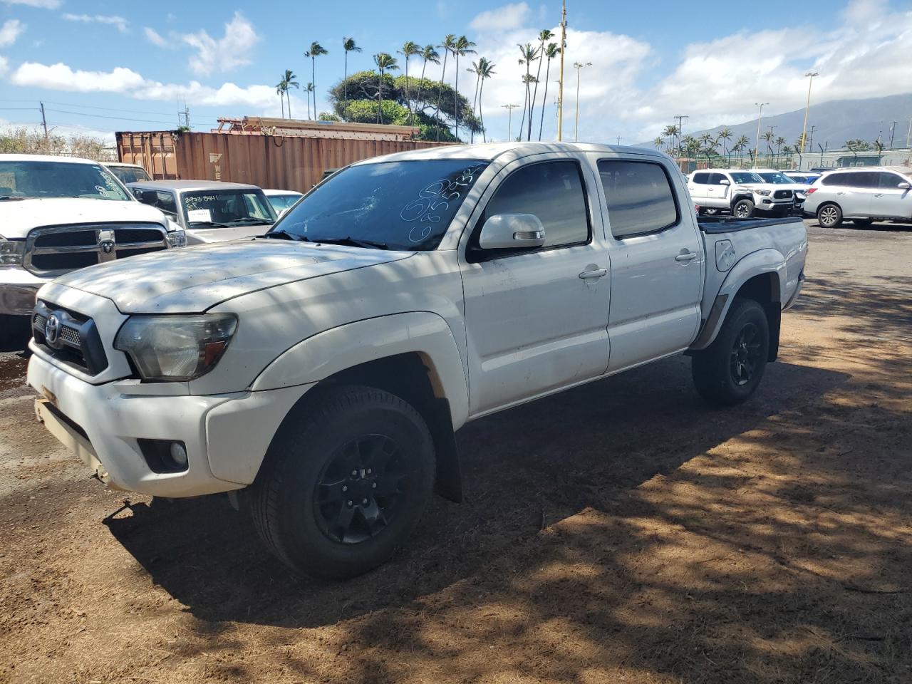 FairThe white 2015 Toyota Tacoma Double Cab exhibits front-end damage, including a damaged bumper, hood, and possible damage to the front lights and windshield, which will need replacement. The wheels appear to be in acceptable condition. The interior shows some wear and tear with seat covers. The vehicle is listed as 'Run & Drive Verified,' suggesting it's drivable despite the front-end damage.