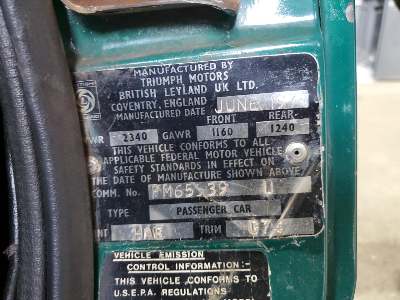 FairThe 1977 Triumph Spitfire is a classic British sports car, known for its compact size and nimble handling. This particular model shows signs of age and wear, with both mechanical and cosmetic issues. The car's exterior displays moderate damage, with a green paint job that has faded in some areas. The wheels appear to be intact, but the body panels show signs of wear and tear consistent with its age. The lights and glass appear to be in fair condition. The interior shows damage, with visible wear on the seats, and the dashboard elements. Mechanical issues are noted, indicating potential problems with running components. The car's overall condition is fair, suggesting it requires some repairs. The airbags condition is not clearly visible. The car appears to be drivable after repairs.