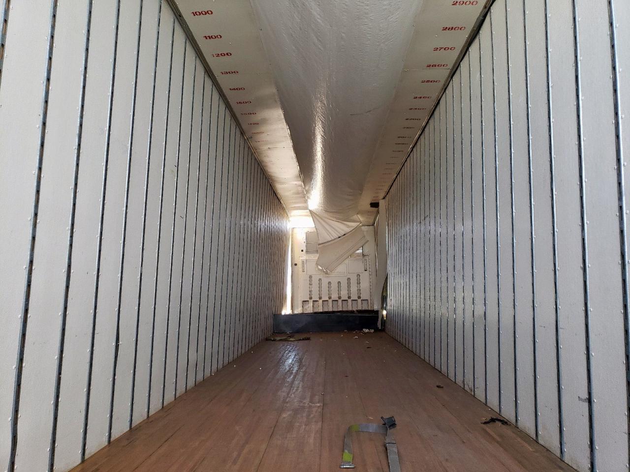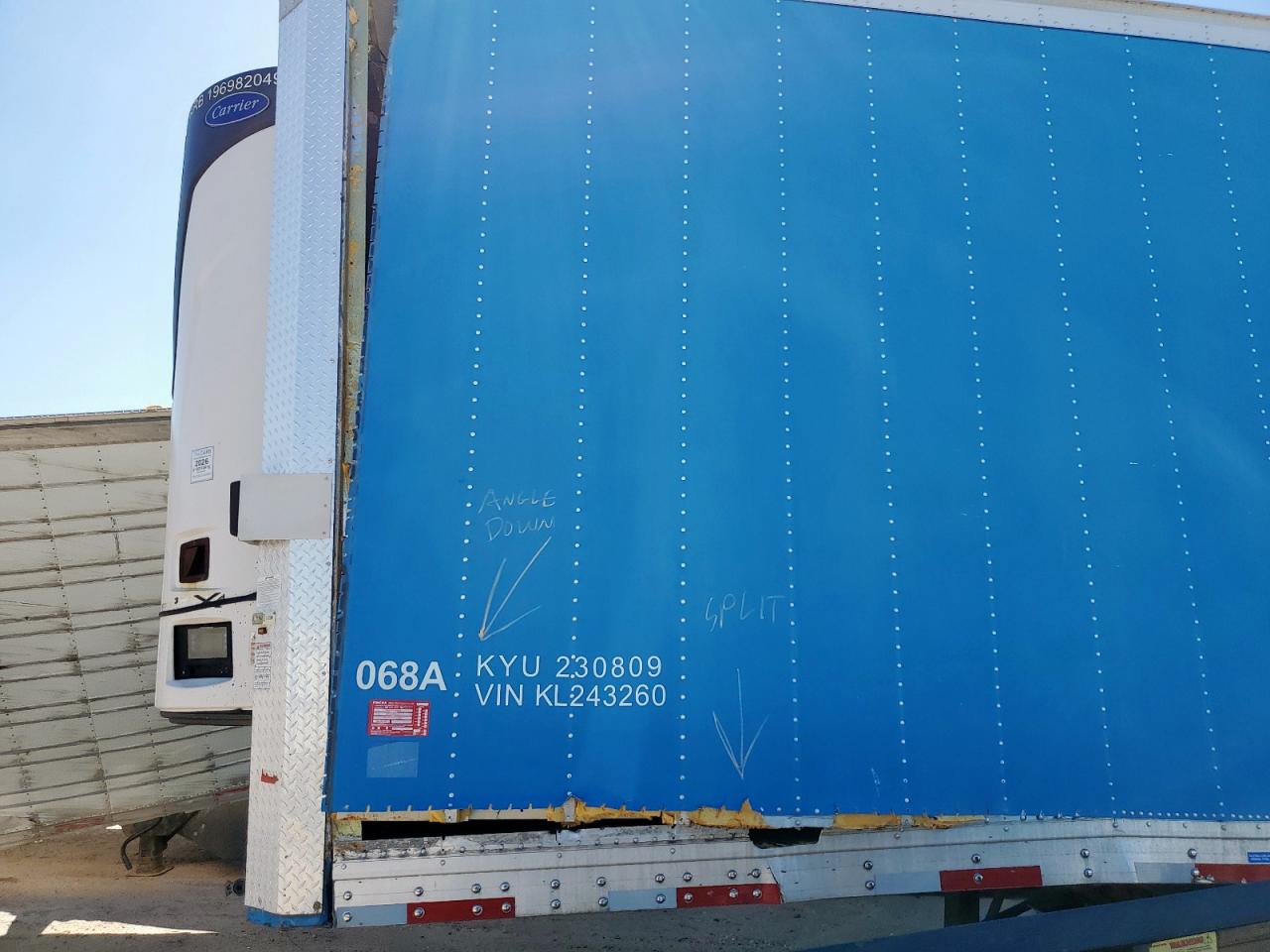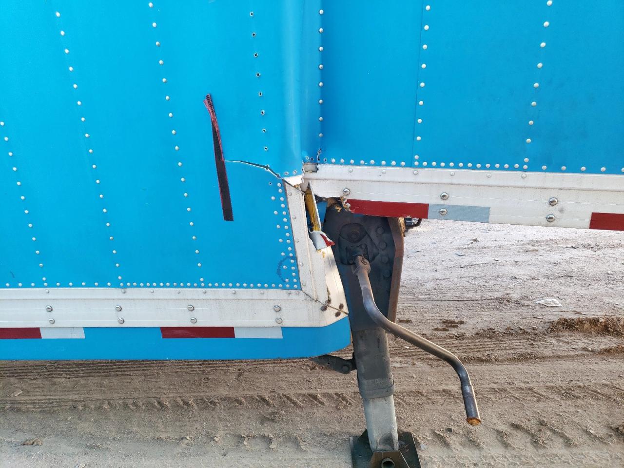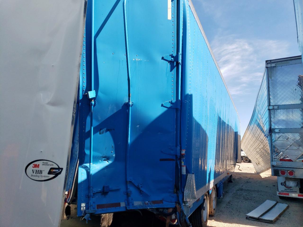 The KCBN TRAILER 2019 exhibits frame damage. The exterior is primarily blue and white. Despite the frame damage, the trailer's wheels appear to be intact, and there is no visible mechanical damage. The interior shows wear and tear consistent with its age.