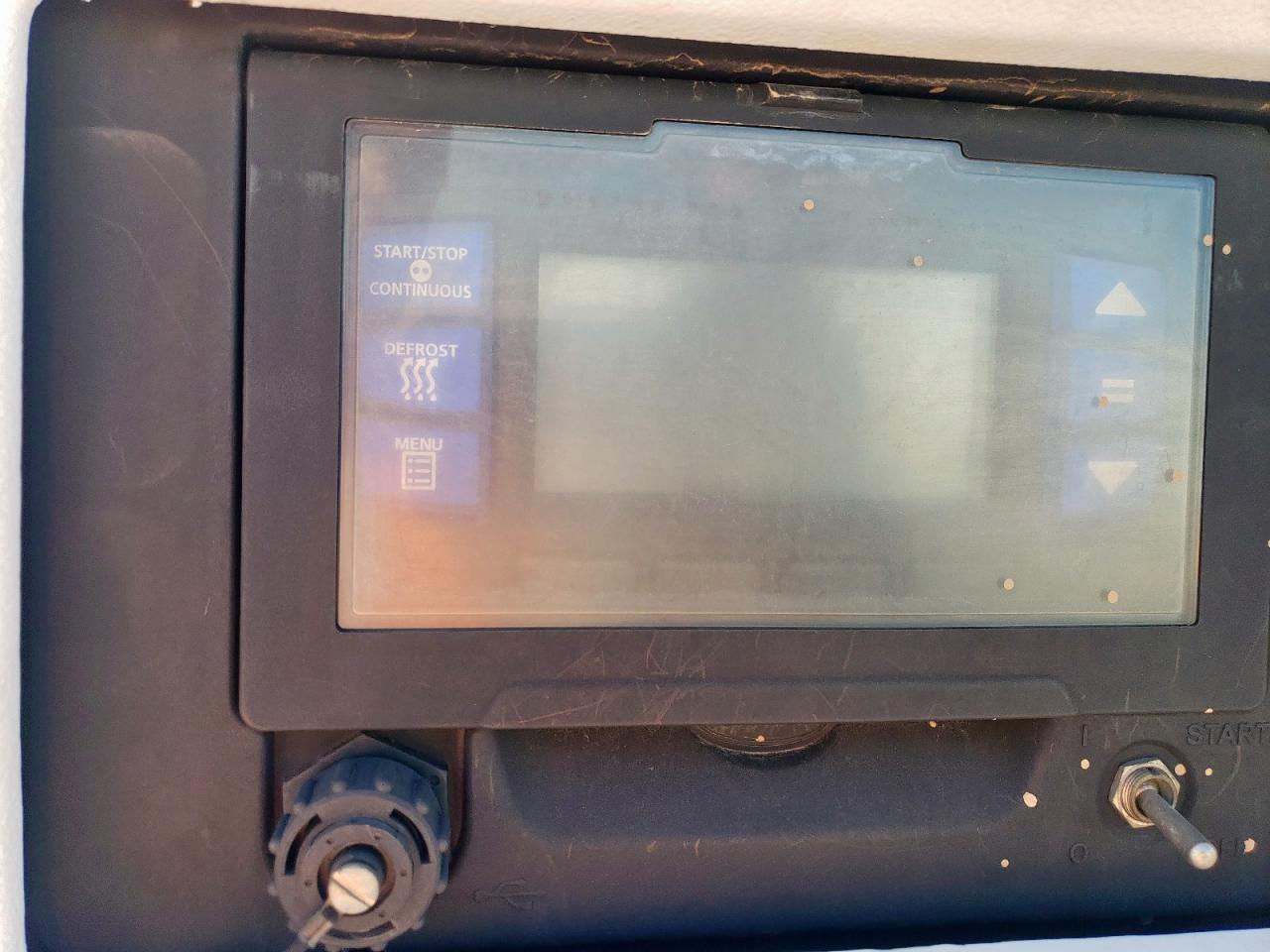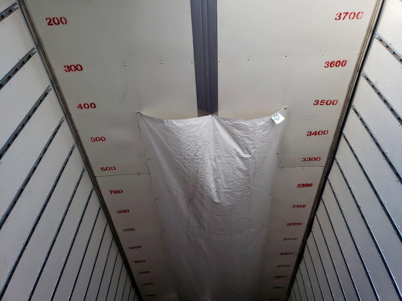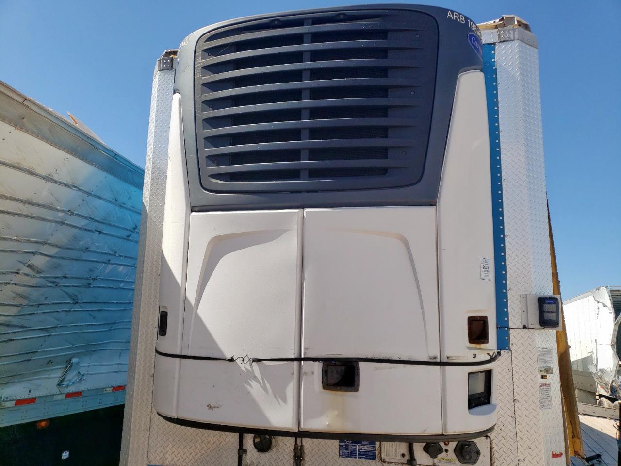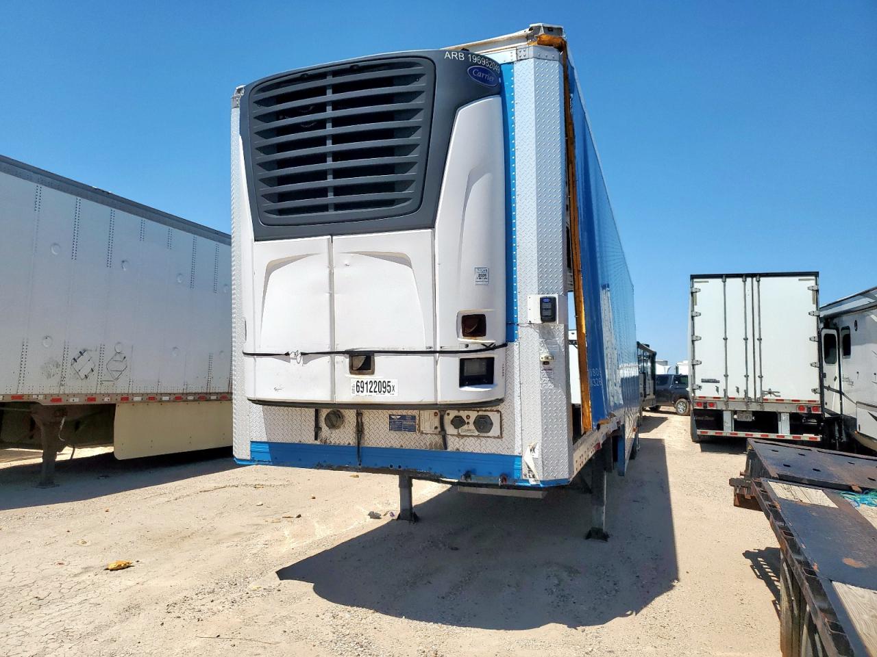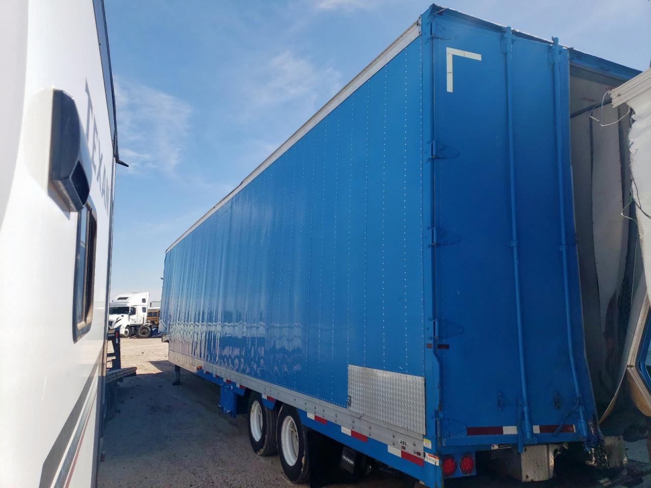 The KCBN TRAILER 2019 exhibits frame damage. The exterior is primarily blue and white. Despite the frame damage, the trailer's wheels appear to be intact, and there is no visible mechanical damage. The interior shows wear and tear consistent with its age.