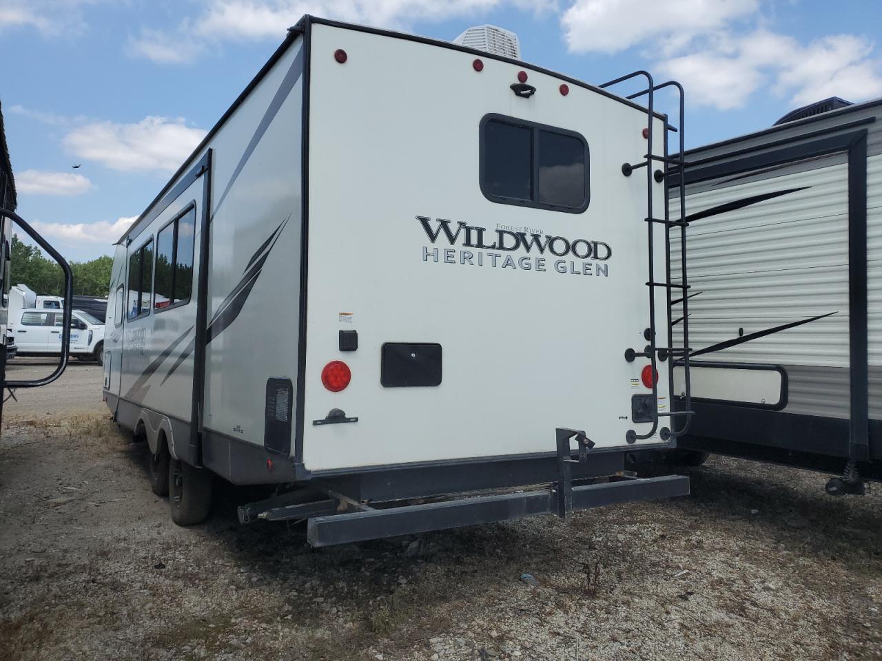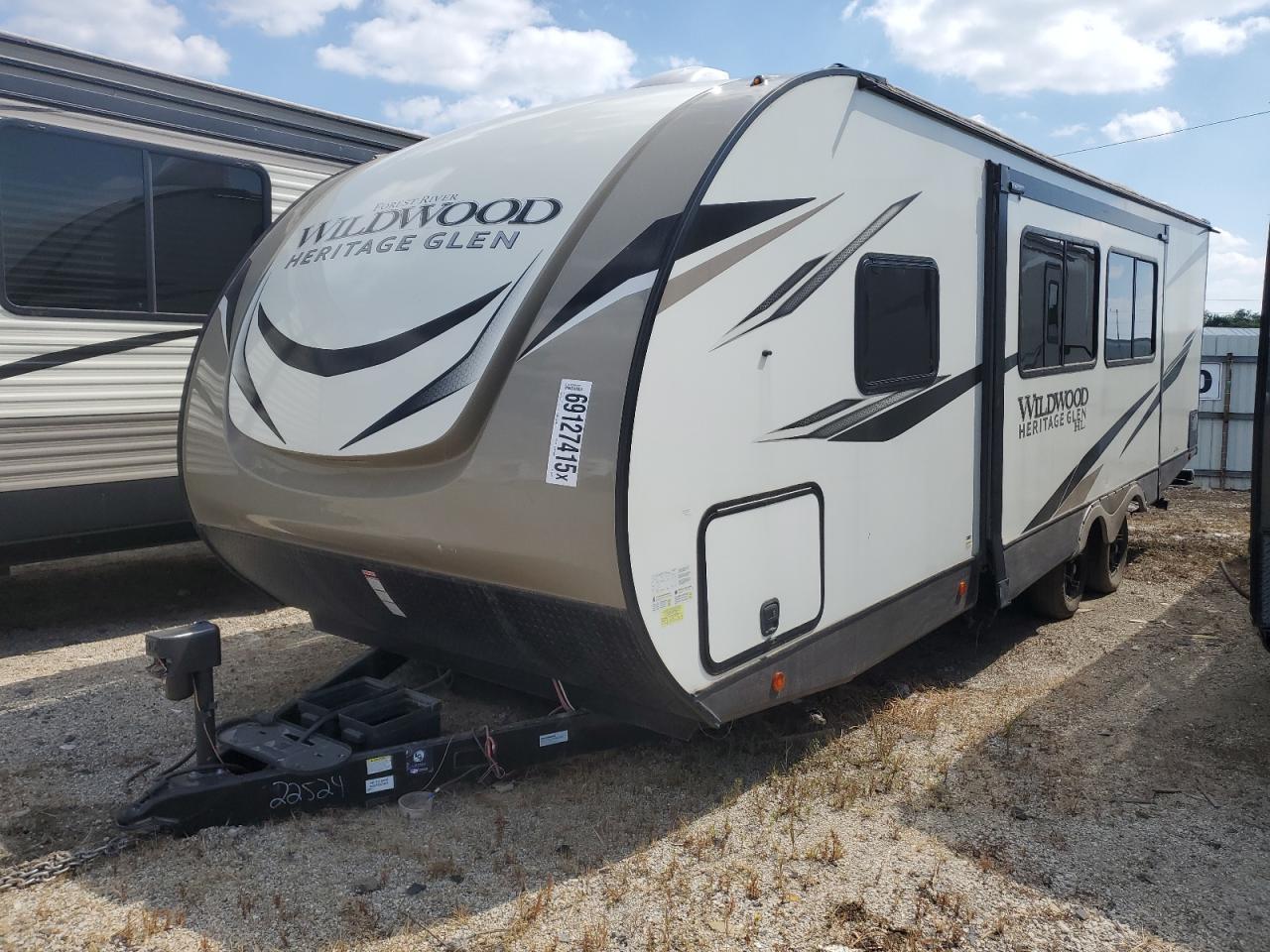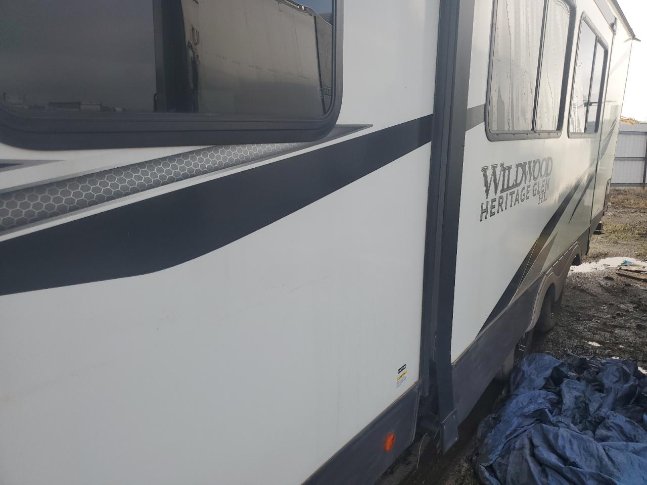 FairThis 2022 WILDWOOD HERITAGE GLEN RV has sustained significant water/flood damage. The exterior, primarily the side panels, shows moderate visible damage. The interior also exhibits damage, suggesting the impact of the water. The vehicle's condition necessitates considerable repair.