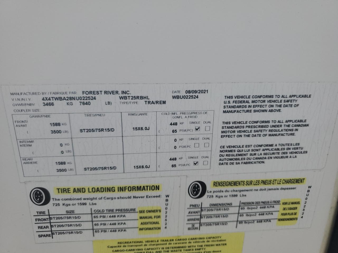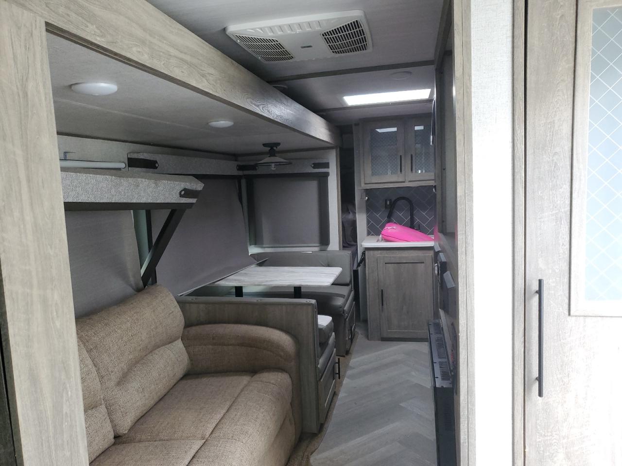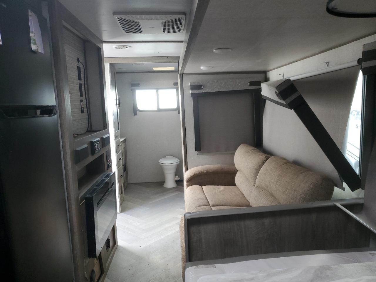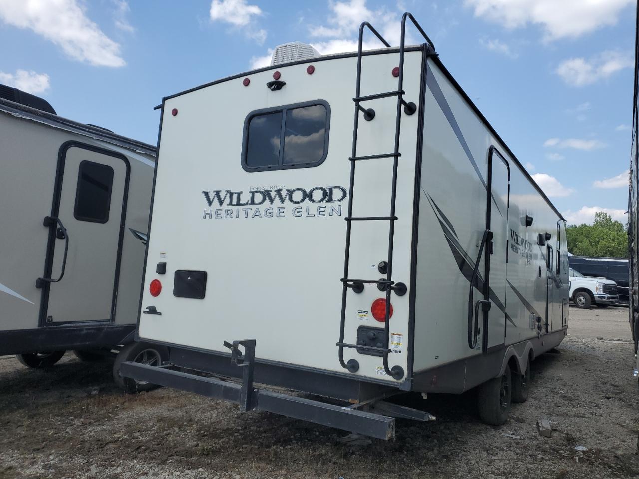 FairThis 2022 WILDWOOD HERITAGE GLEN RV has sustained significant water/flood damage. The exterior, primarily the side panels, shows moderate visible damage. The interior also exhibits damage, suggesting the impact of the water. The vehicle's condition necessitates considerable repair.