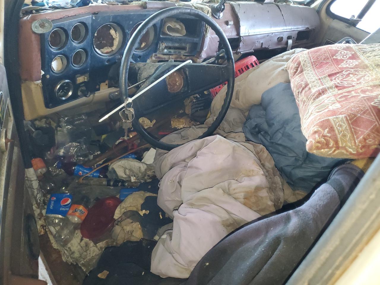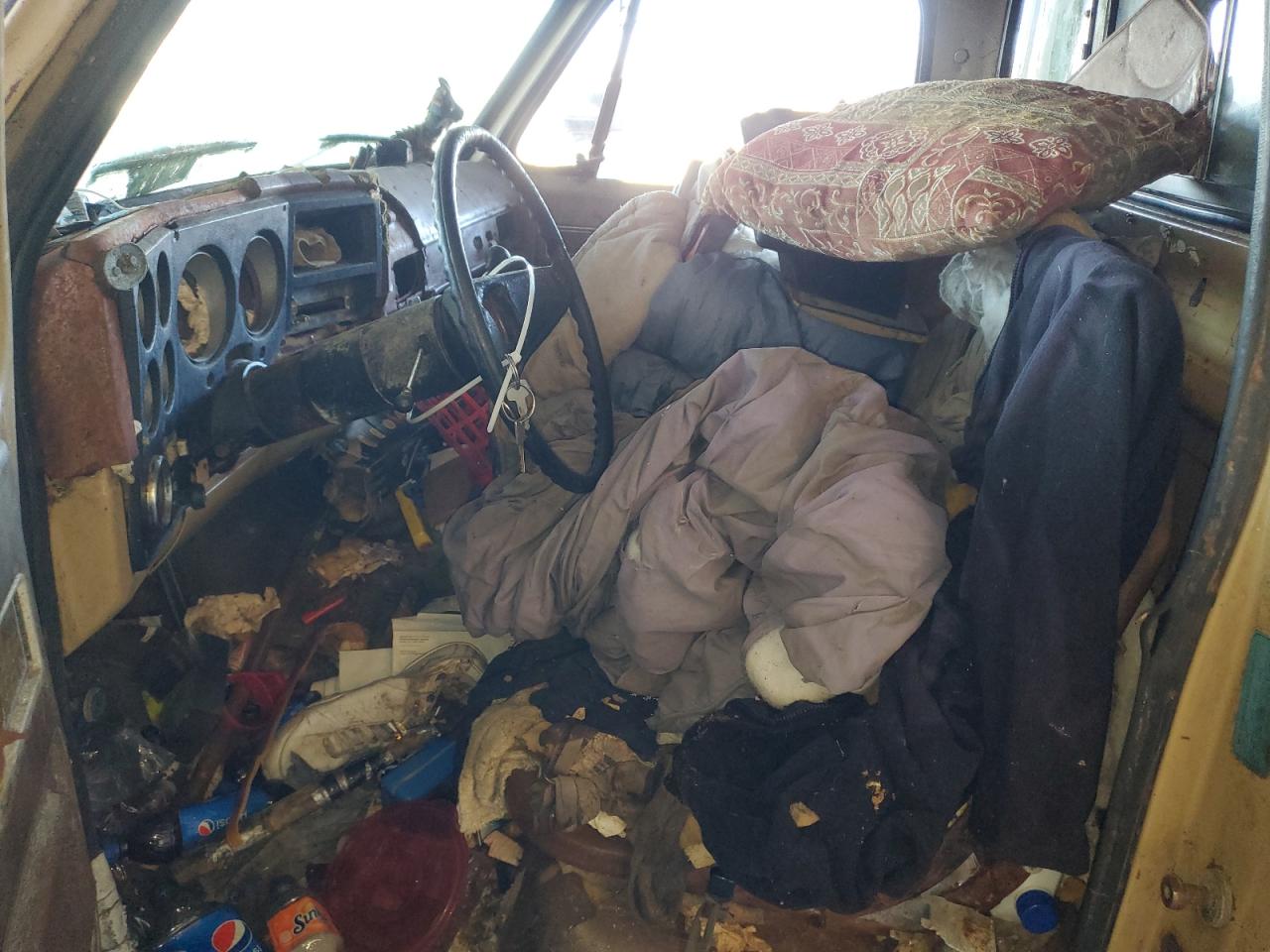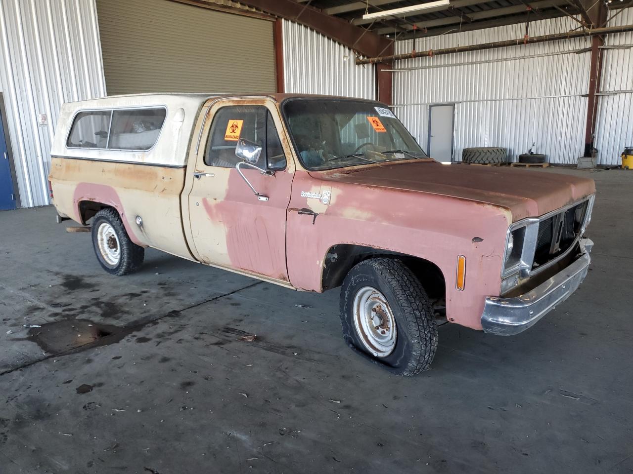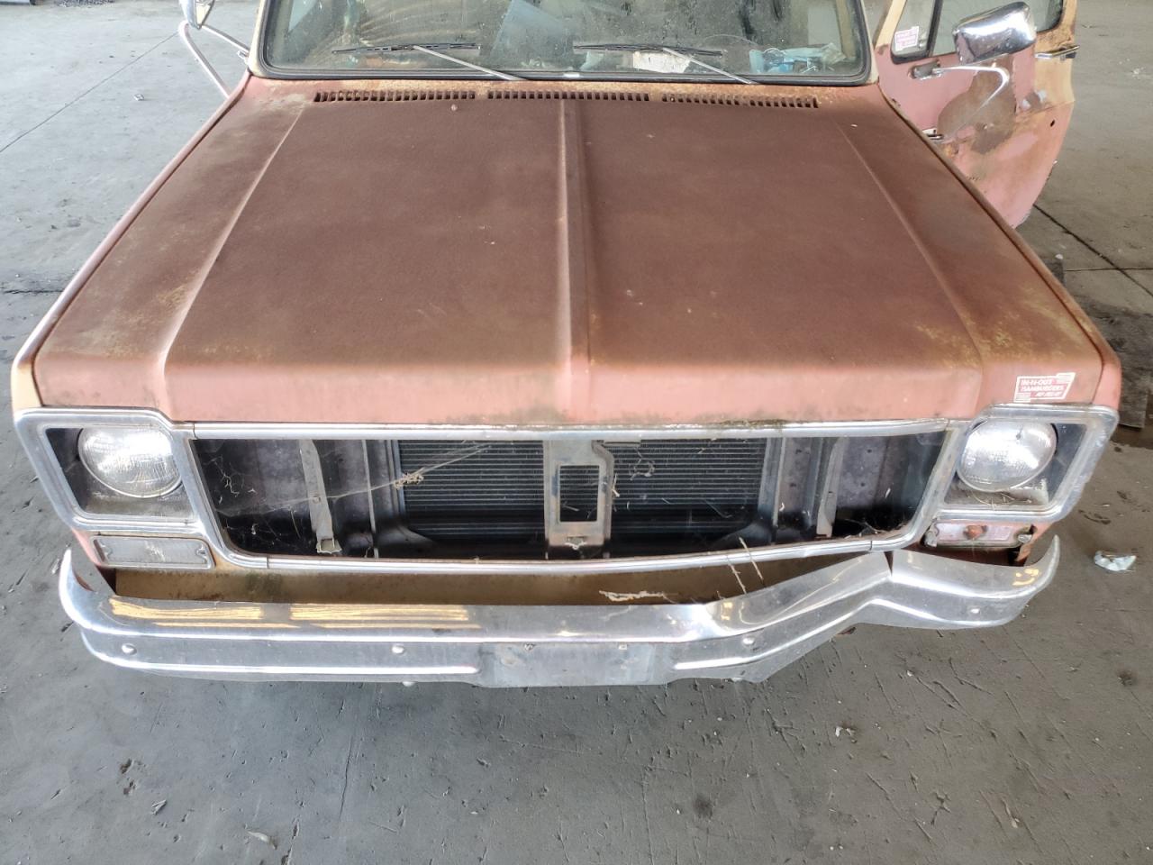 FairThis is a 1974 GMC Sierra, exhibiting significant cosmetic and body damage. The exterior shows signs of rust, dents, and scratches across the panels, and the paint has faded. The interior is in poor condition, with significant damage, and wear. The overall state reflects the need for considerable repairs and restoration.