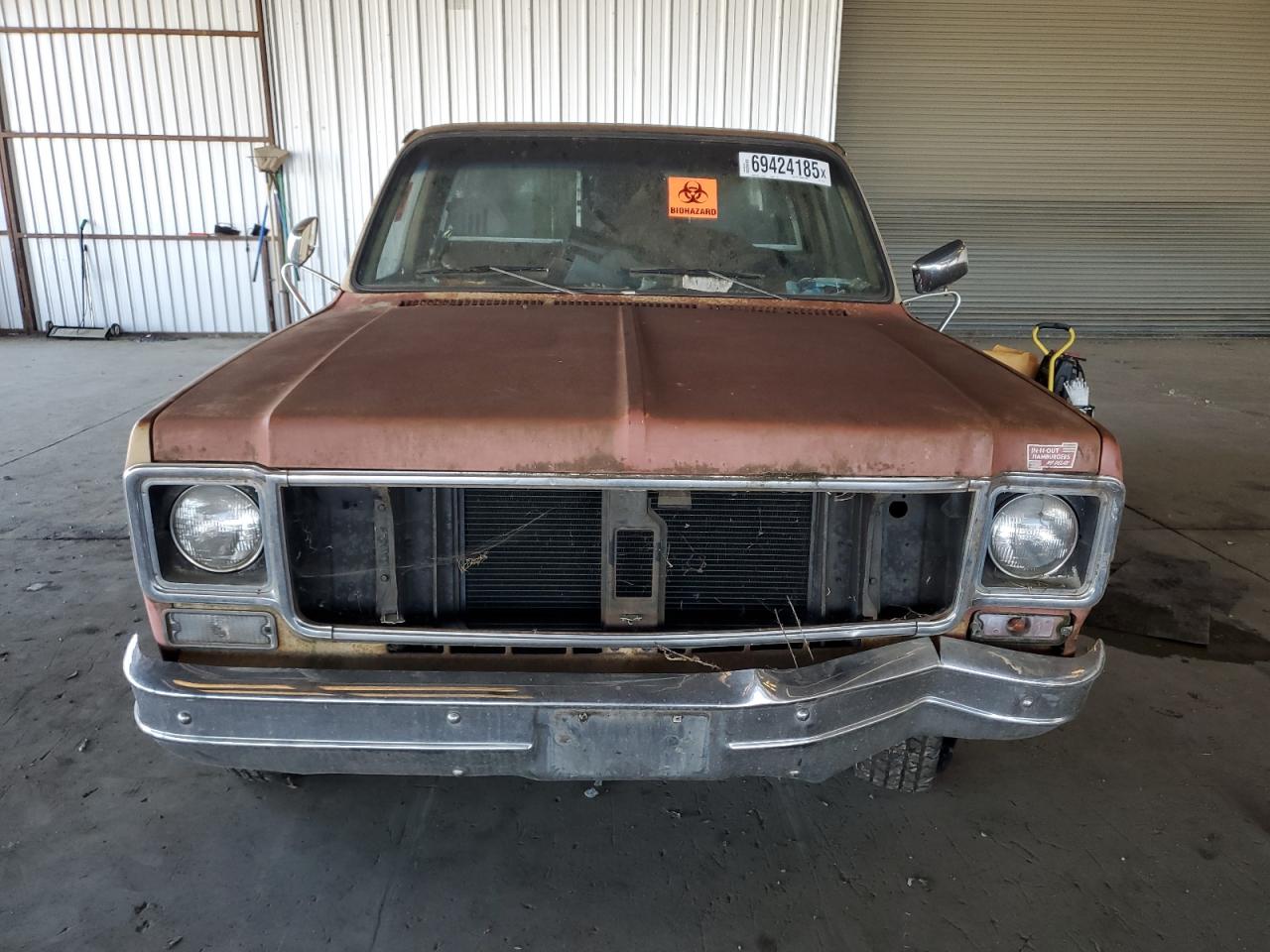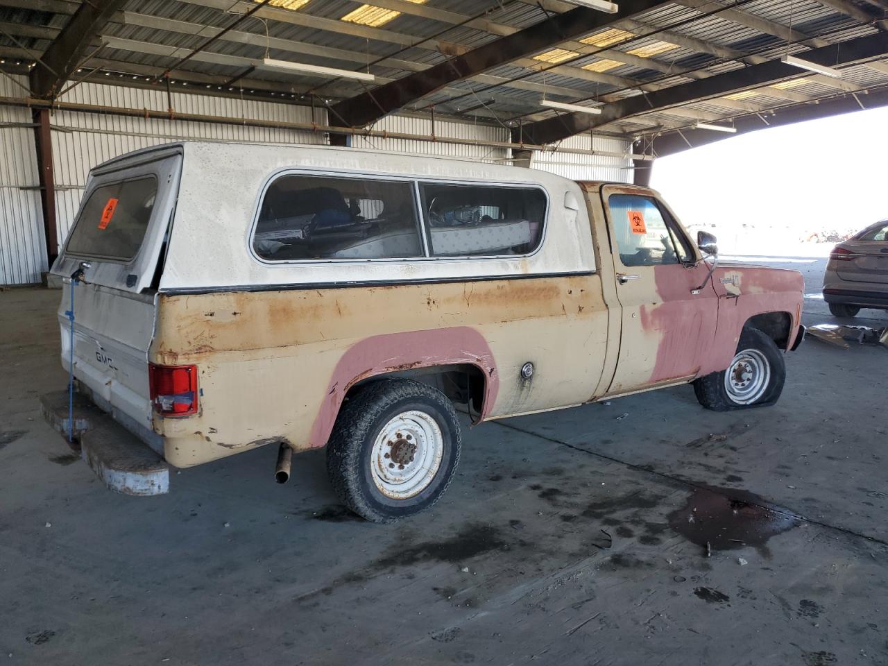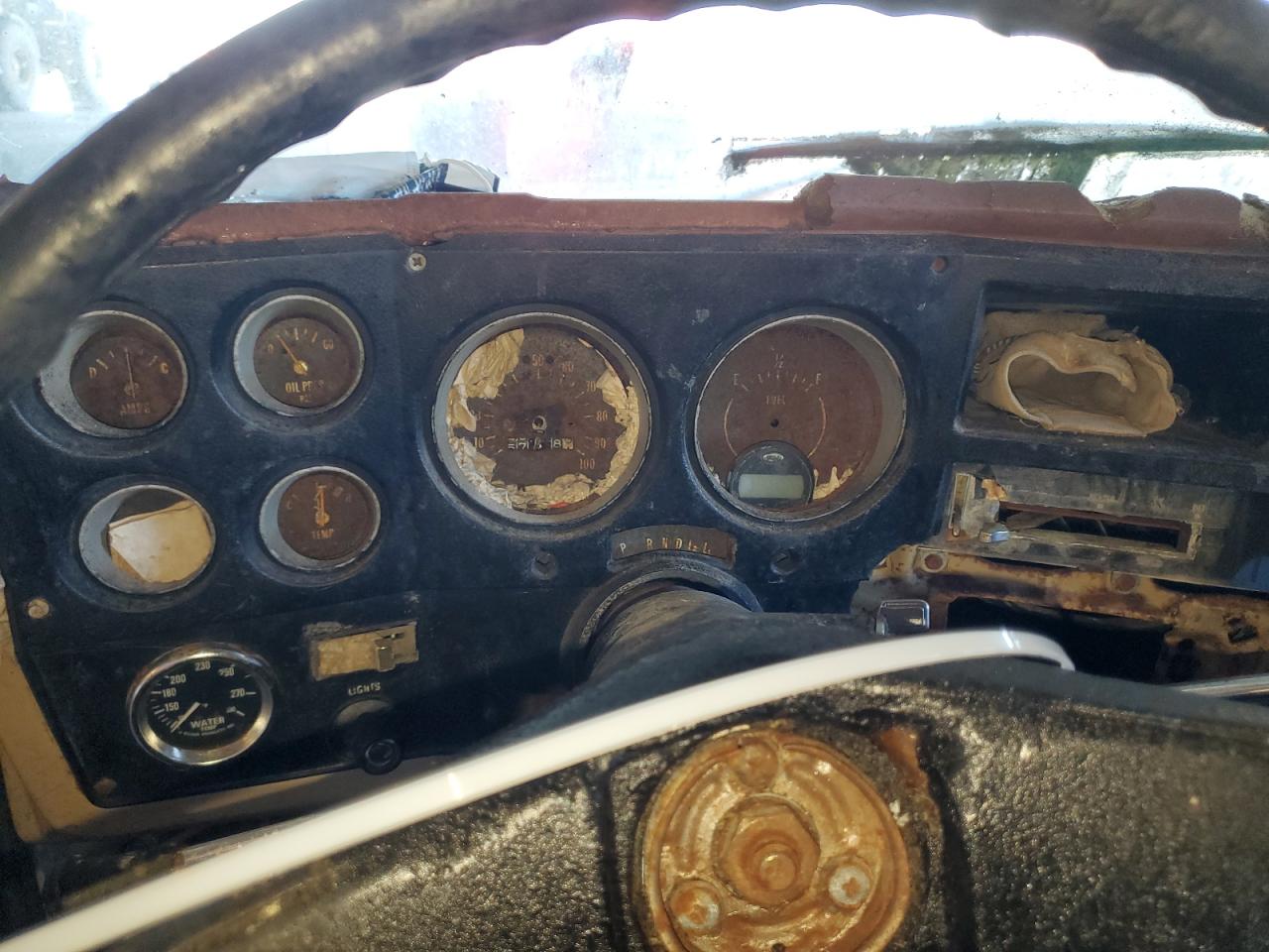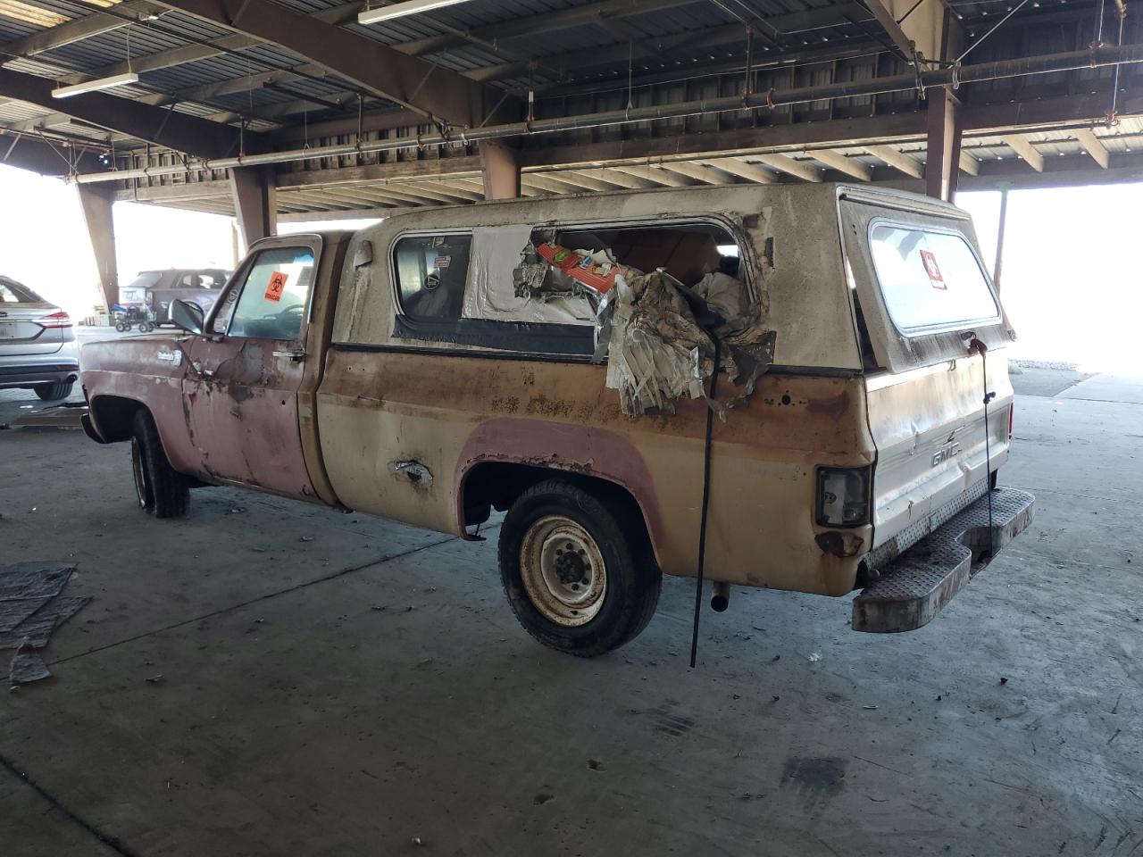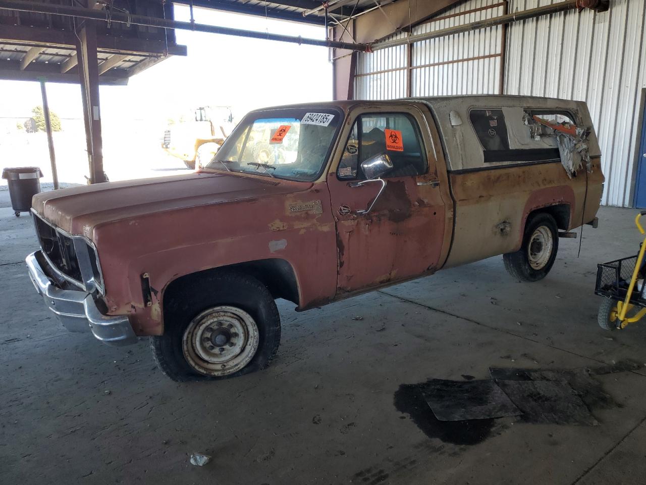 FairThis is a 1974 GMC Sierra, exhibiting significant cosmetic and body damage. The exterior shows signs of rust, dents, and scratches across the panels, and the paint has faded. The interior is in poor condition, with significant damage, and wear. The overall state reflects the need for considerable repairs and restoration.