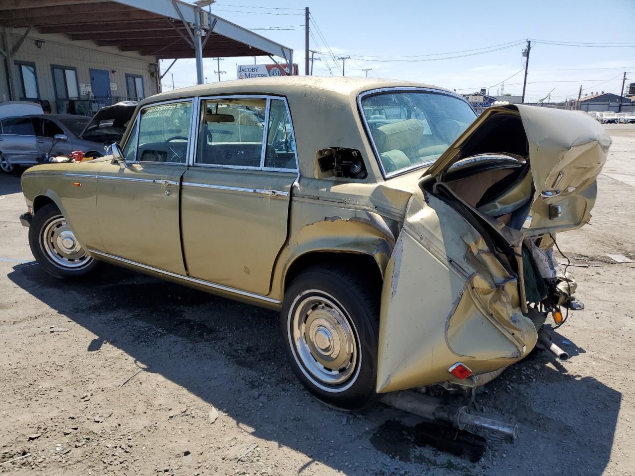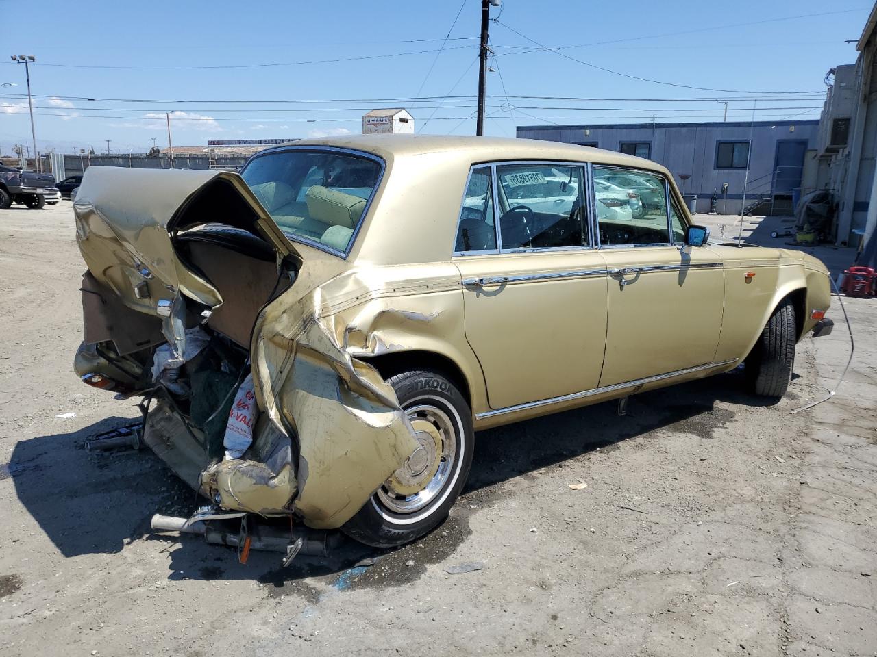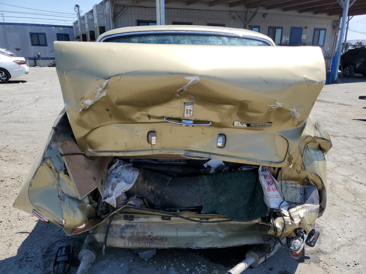 FairThis is a severely damaged 1980 Rolls-Royce Silver Shadow. The primary damage is to the rear end, with significant crushing and deformation of the body panels. Secondary damage is evident at the front, suggesting a collision from both ends. The car is gold. The wheels appear to be intact, but the extent of mechanical damage is unknown. Interior condition appears to be in better shape, showing normal wear and tear. However, the overall condition of the car is poor due to the extensive body damage. This classic luxury vehicle will require substantial repairs to restore it. The airbags' status can't be determined from the provided images.