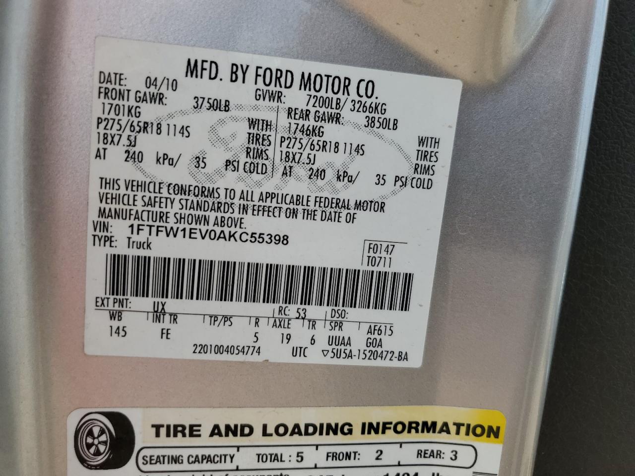 1FTFW1EV0AKC55398Final Bid