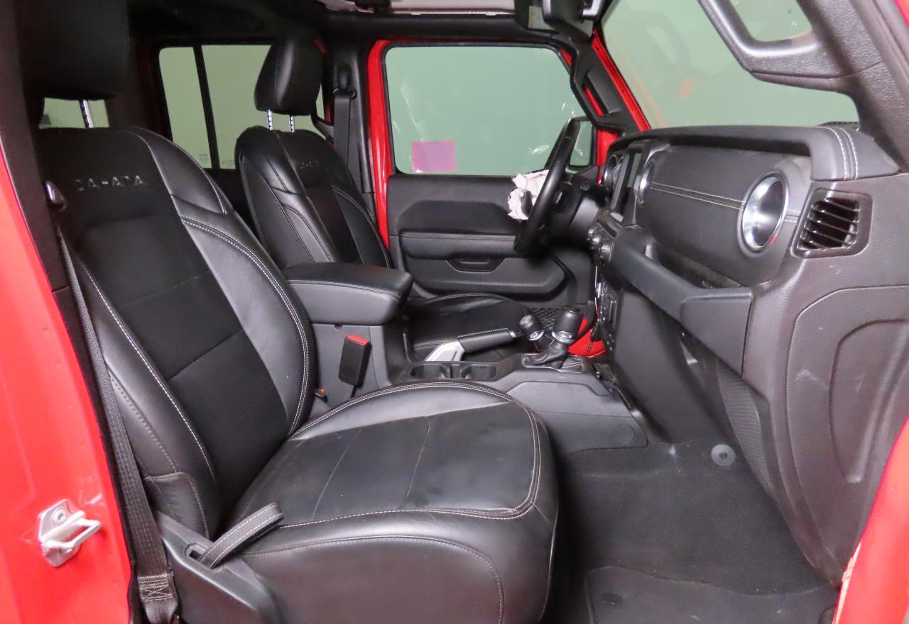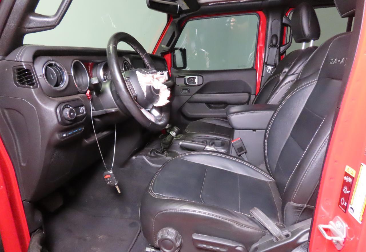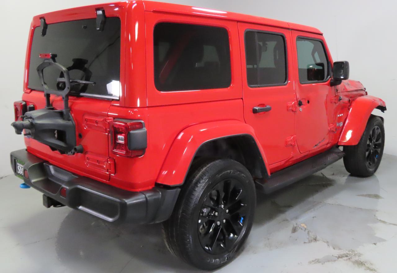 FairThe JEEP WRANGLER SAHARA 4XE 2023 is red. The primary damage is all over the body. Secondary damage is not visible. The car has visible damage to the front, including the front bumper, fender, and hood. The wheels, lights, and glasses appear to be in good condition. The interior shows signs of use but appears to be in decent shape, with no immediate airbag deployment. The car has 33785 miles.