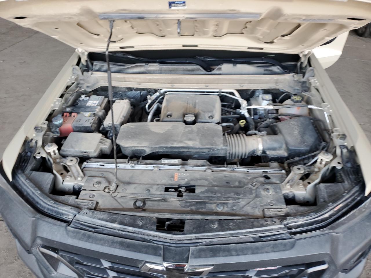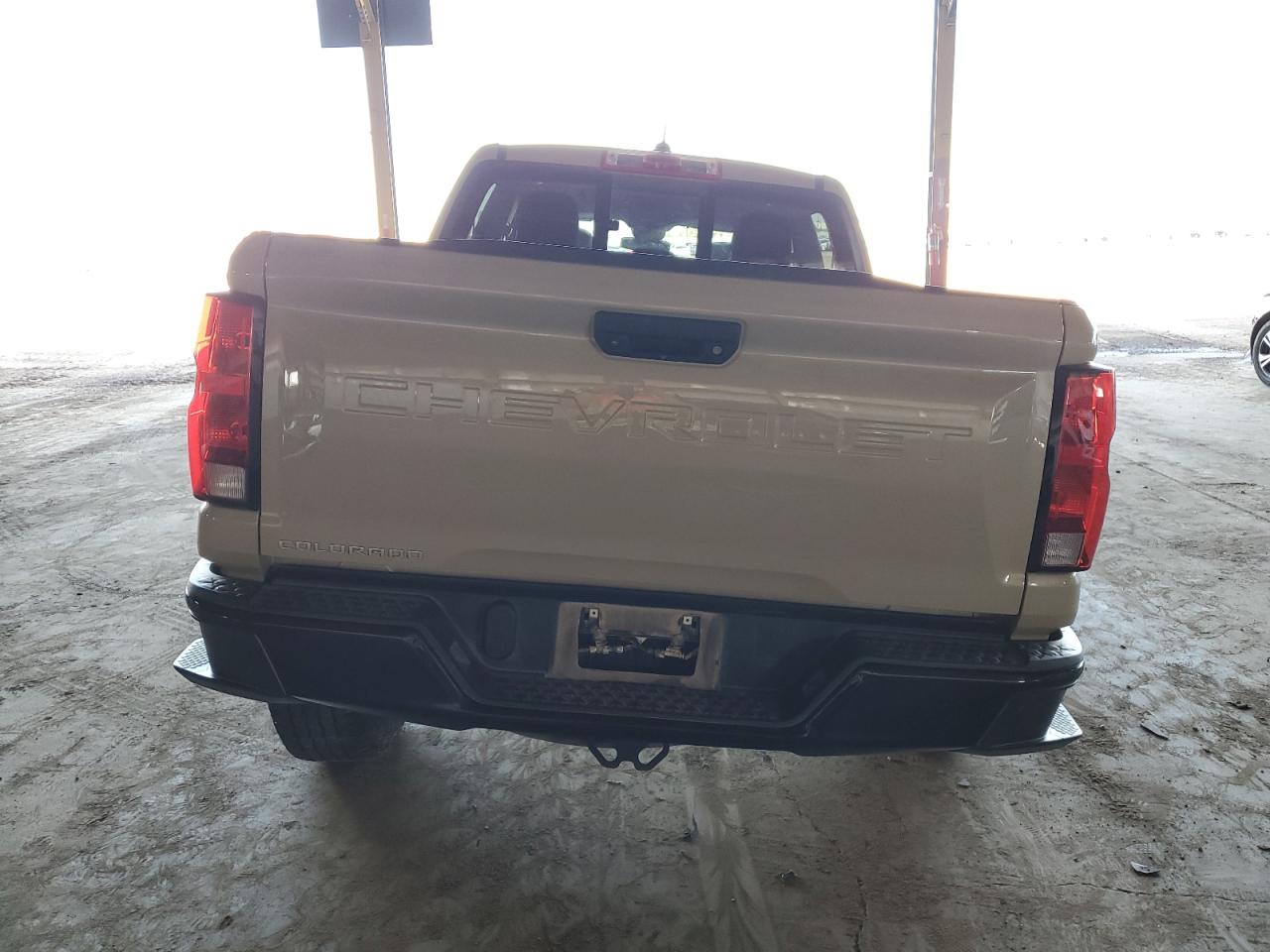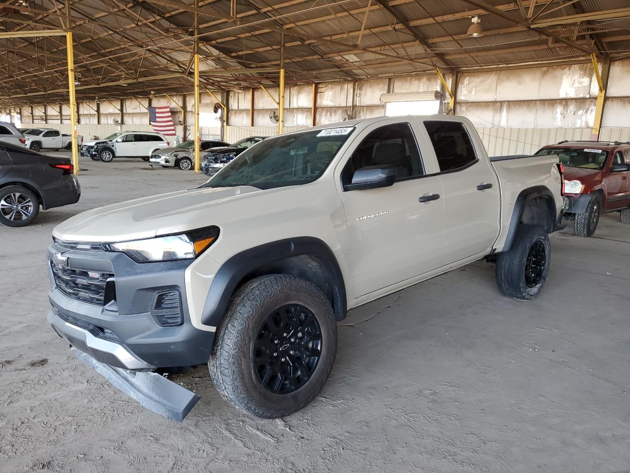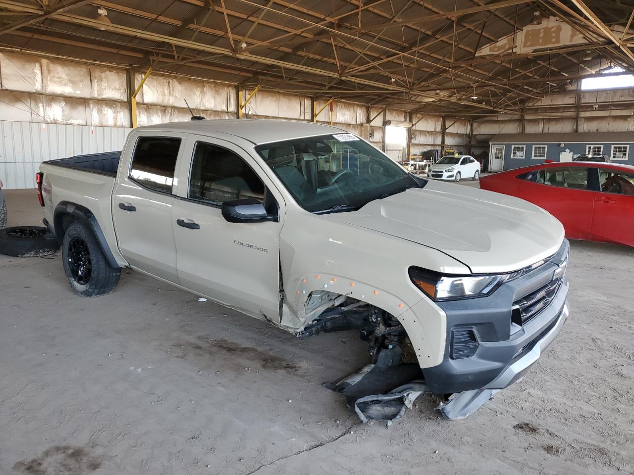 FairThe 2023 CHEVROLET COLORADO TRAIL BOSS, in a tan color, exhibits significant front-end damage, indicating a 'Body' damage category. The undercarriage also shows signs of impact. The vehicle's exterior condition is rated as 'Fair', with visible damage concentrated in the front. The interior condition appears to be 'Good'. The car starts. The damage includes: a destroyed front bumper, front fascia, damaged fender. The wheels appear to be intact, and the lights and glasses do not appear damaged in the images. The interior shows normal wear and tear. Summary: Damaged 2023 CHEVROLET COLORADO TRAIL BOSS, tan, front-end collision, body damage, overall exterior condition 'Fair'.
