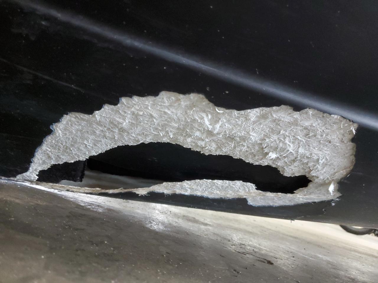 The primary damage is to the undercarriage, and secondary damage is water/flood damage. Interior shows damage to seats and possibly other components. The vehicle also shows general wear and tear.