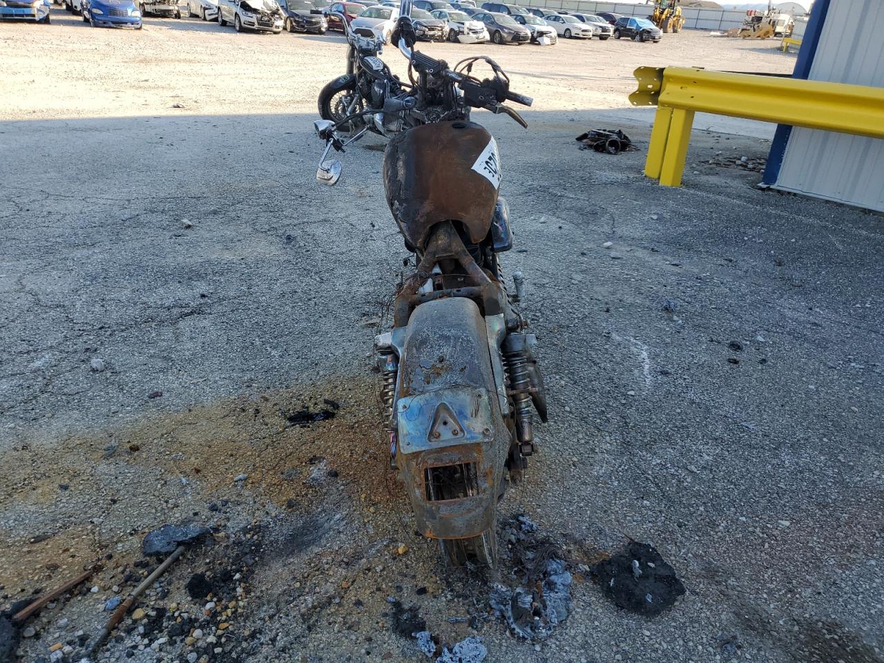 Burn damage throughout the motorcycle, including the body, frame, and components. The extent of the damage suggests significant structural and mechanical issues.