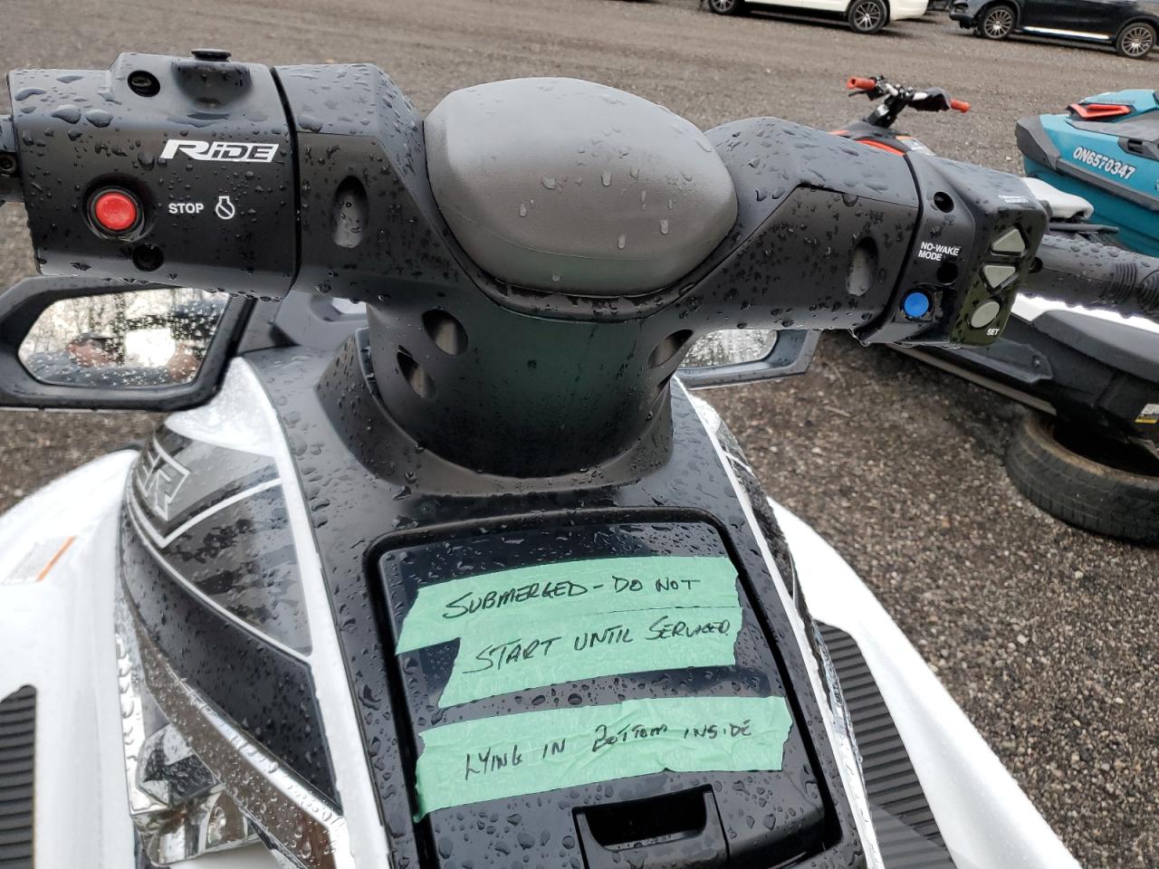 The primary damage is water/flood related, affecting the body panels. There is no other damage visible. The wheels and lights appear to be in good condition. There is no damage to the interior parts, airbag not deployed.