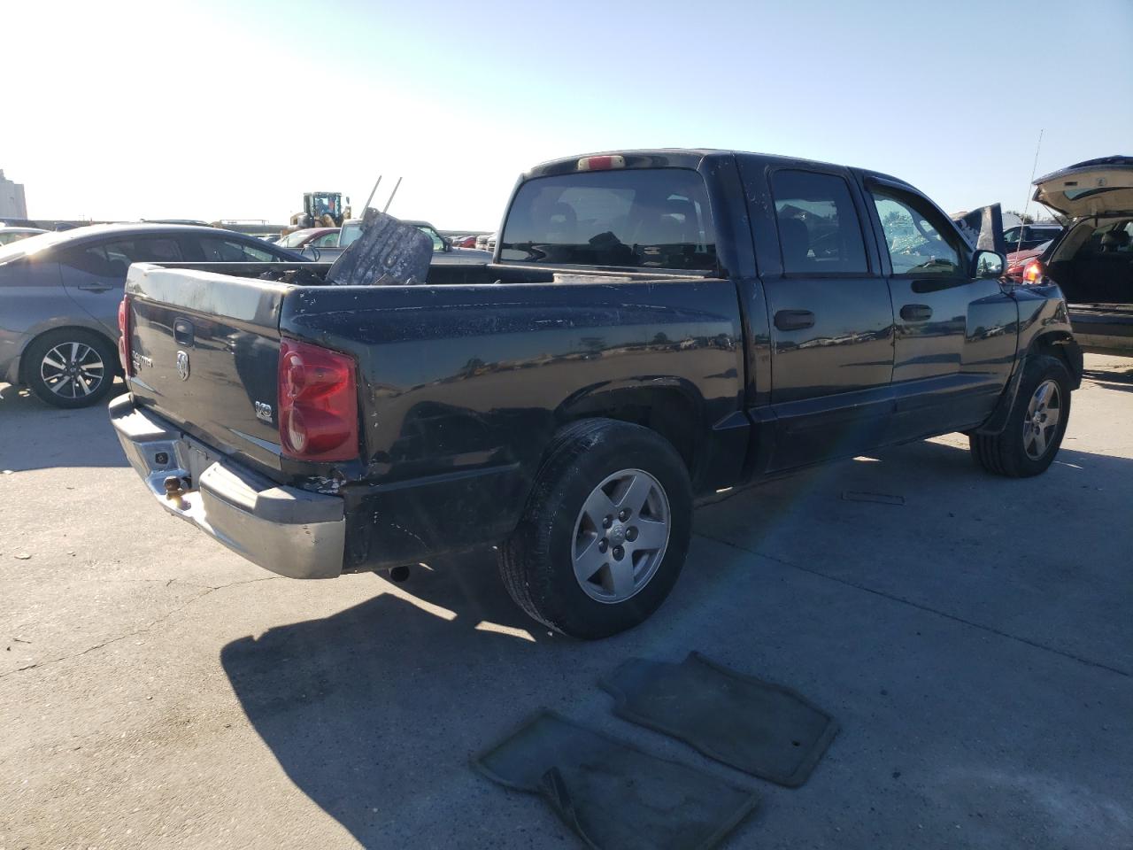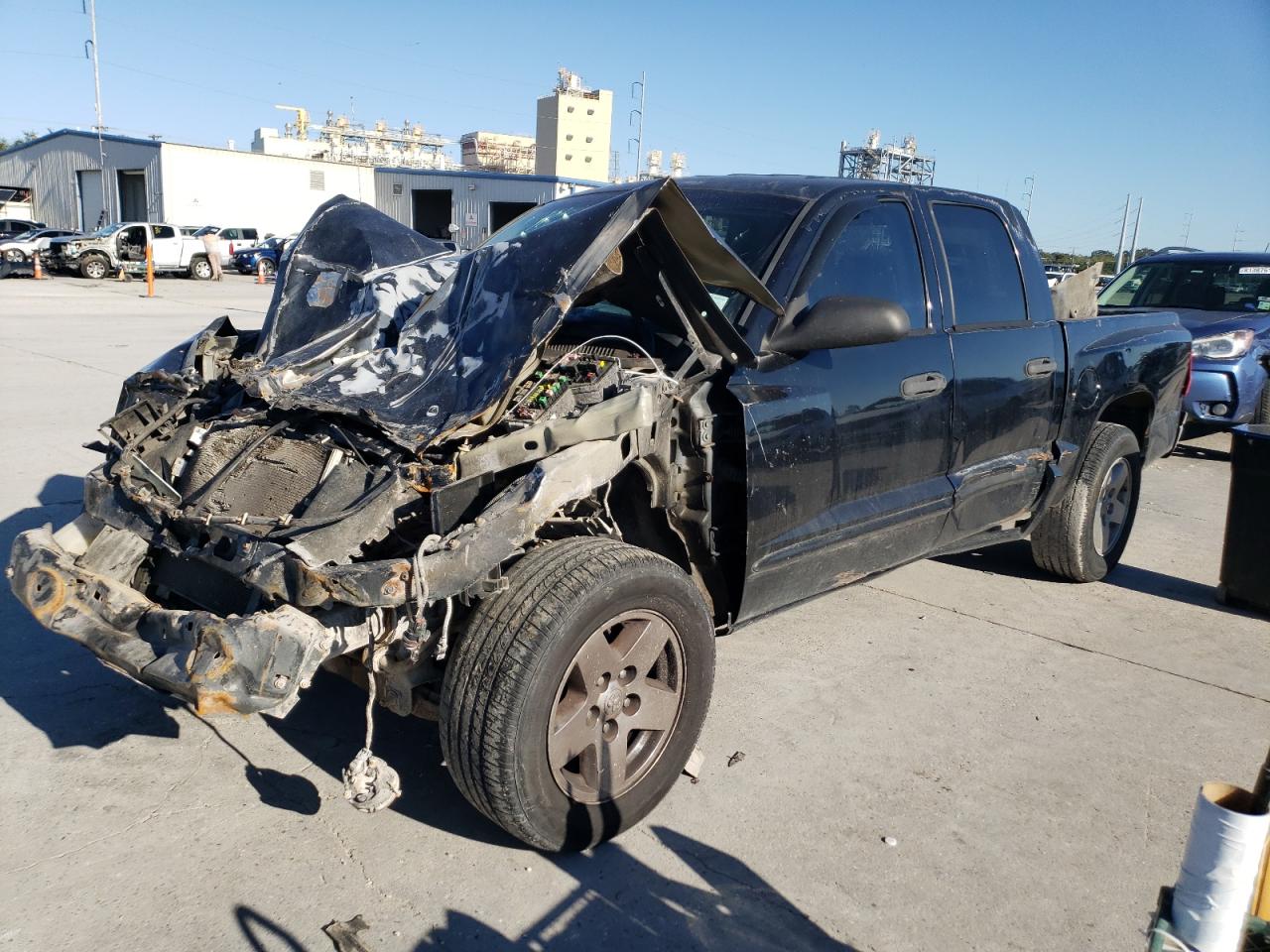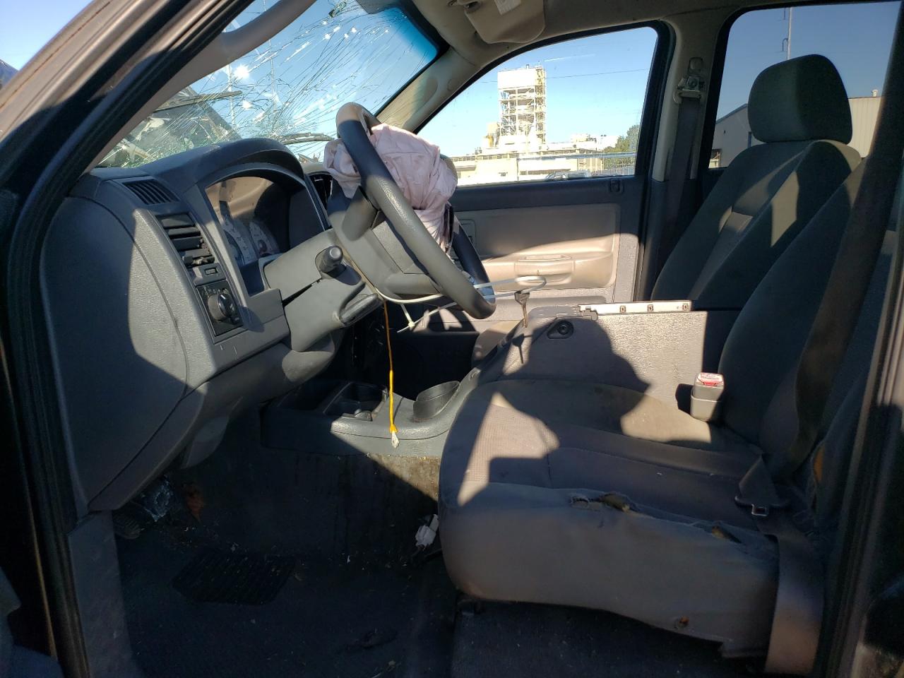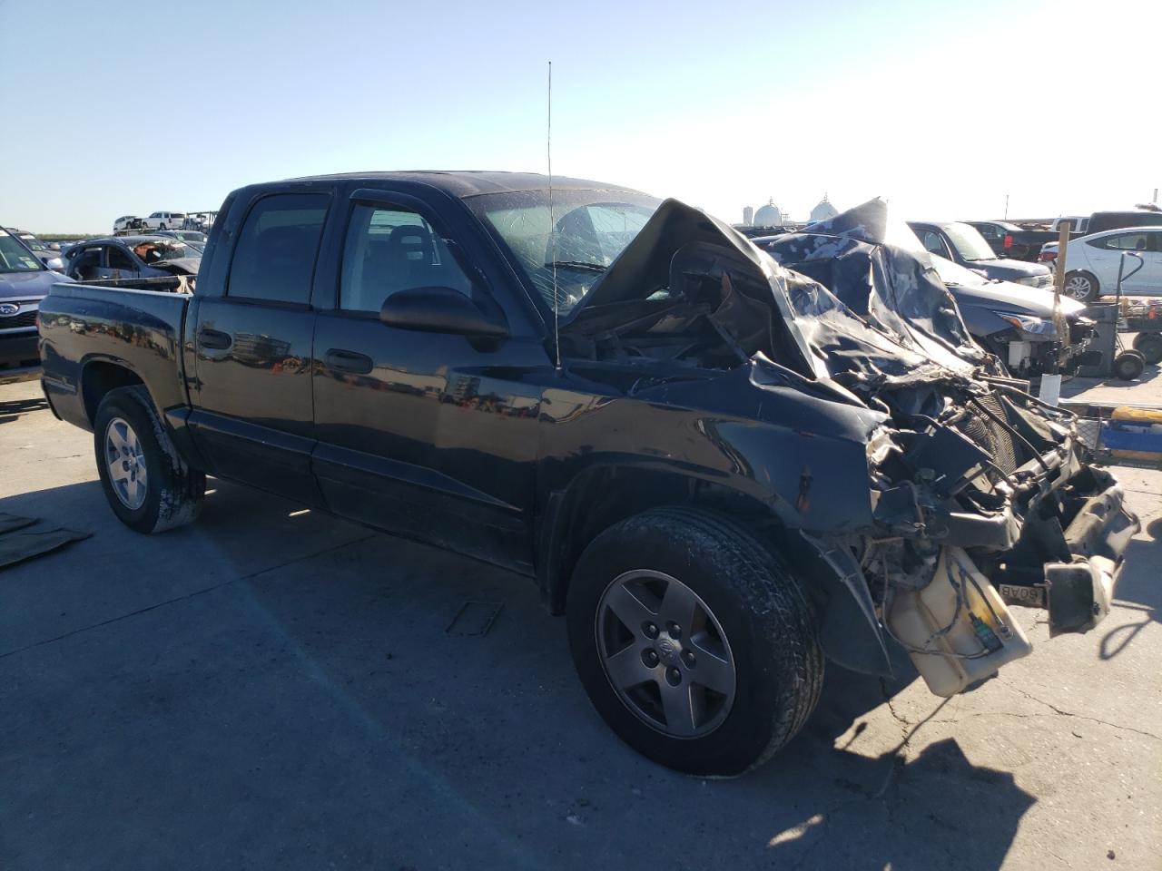 PoorThis is a heavily damaged 2005 Dodge Dakota. The primary damage is to the front end, with significant impact to the body panels and frame. The black exterior shows substantial damage, including a crushed front end and visible damage to the body. The wheels appear to be intact despite the severity of the accident. The interior also sustained damage, with deployed airbags and visible impact damage. This vehicle is in poor condition and requires considerable repair.