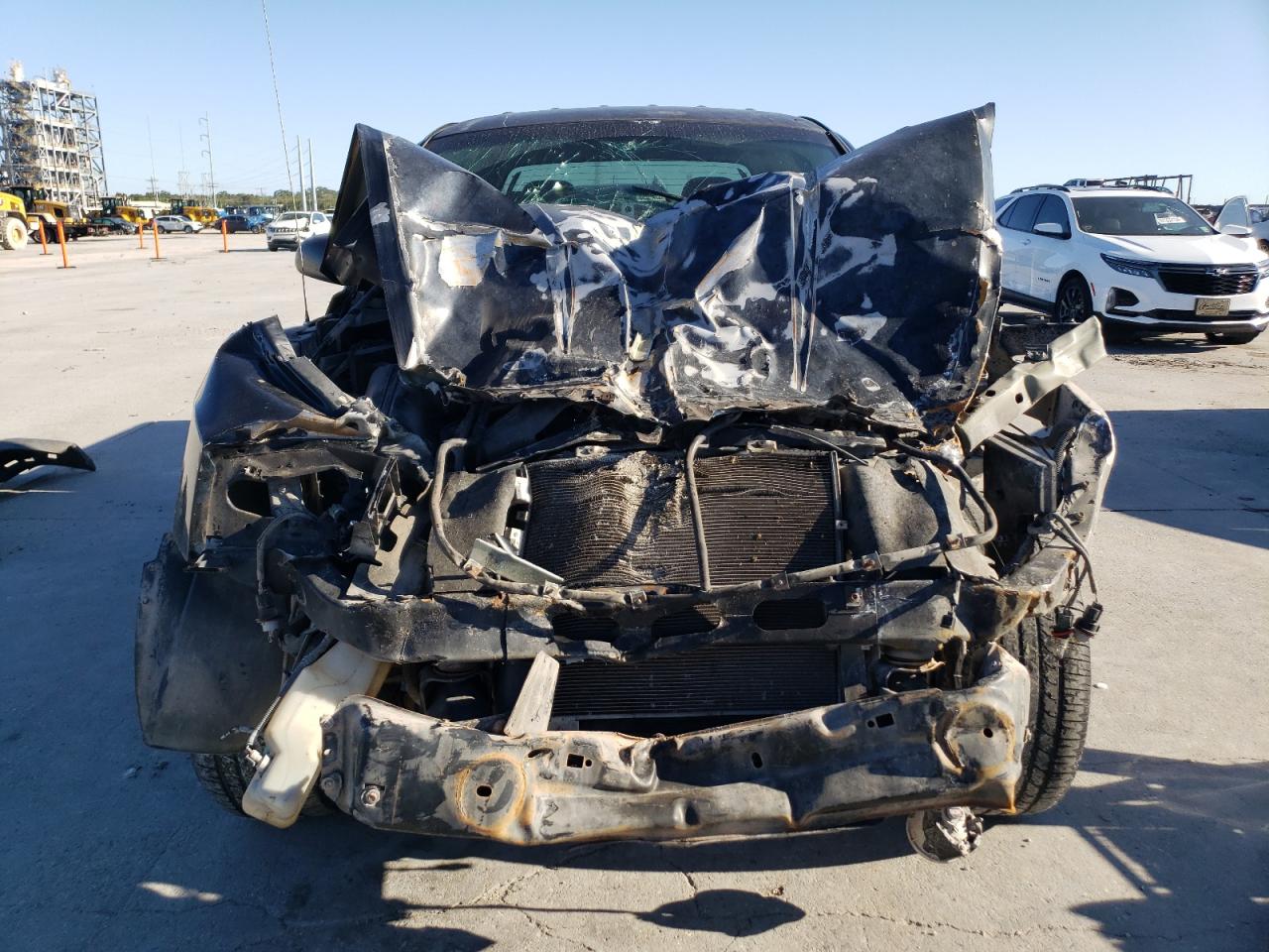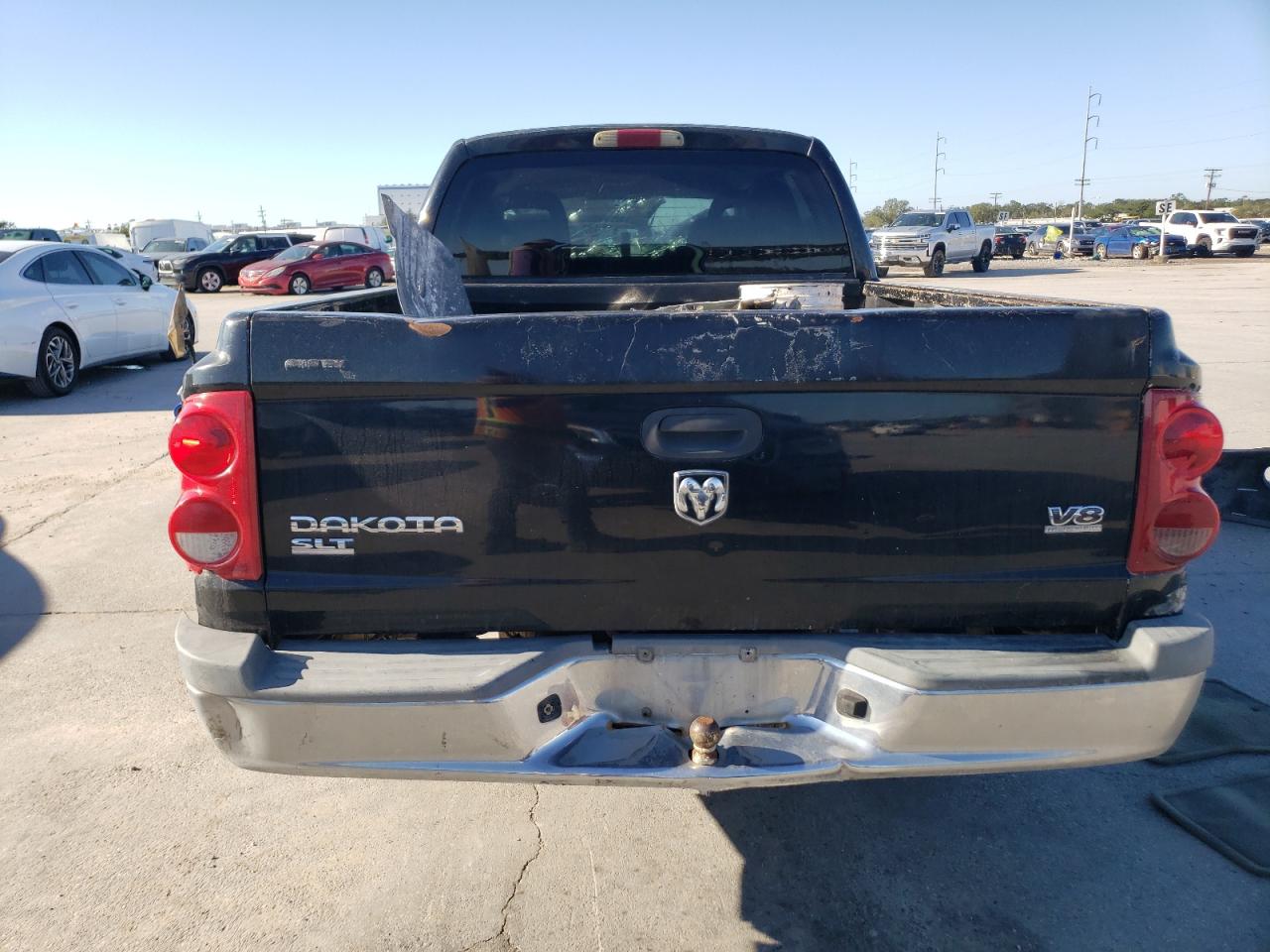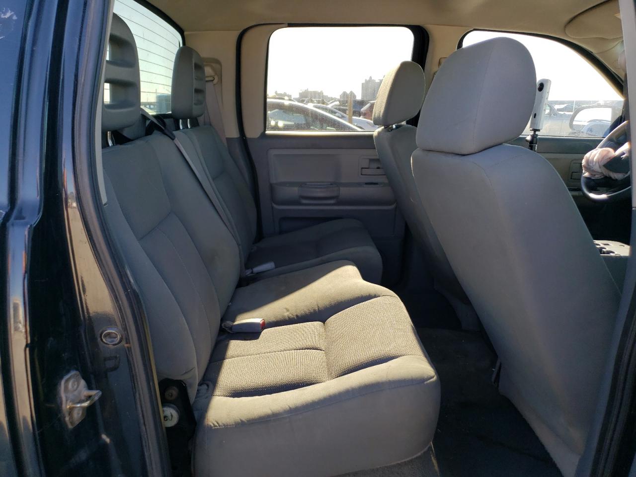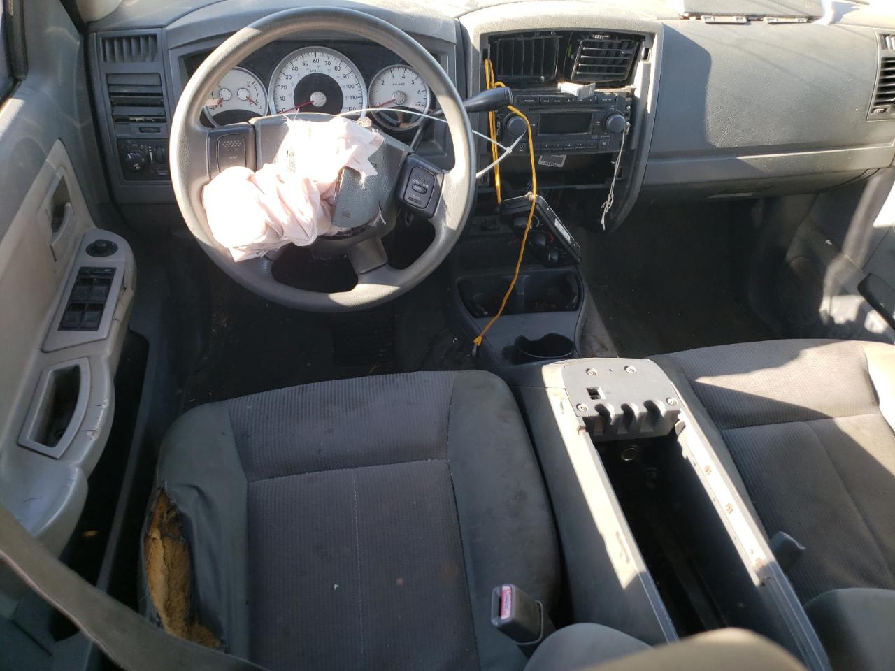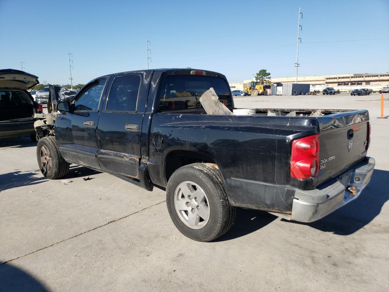 PoorThis is a heavily damaged 2005 Dodge Dakota. The primary damage is to the front end, with significant impact to the body panels and frame. The black exterior shows substantial damage, including a crushed front end and visible damage to the body. The wheels appear to be intact despite the severity of the accident. The interior also sustained damage, with deployed airbags and visible impact damage. This vehicle is in poor condition and requires considerable repair.
