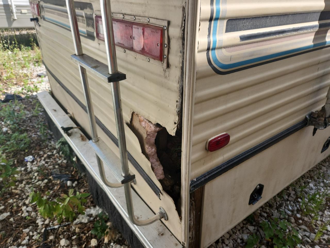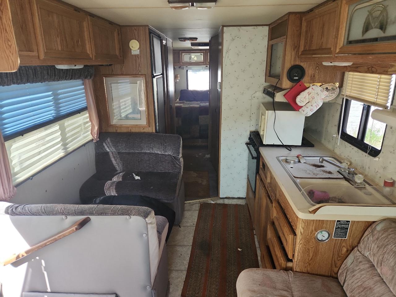 The vehicle's exterior displays moderate damage, including body panel damage, and signs of normal wear and tear. There is visible damage to the rear of the RV. The interior shows wear consistent with age. The wheels appear to be in acceptable condition. The lights and glasses appear to be functional, but the state is not specified.