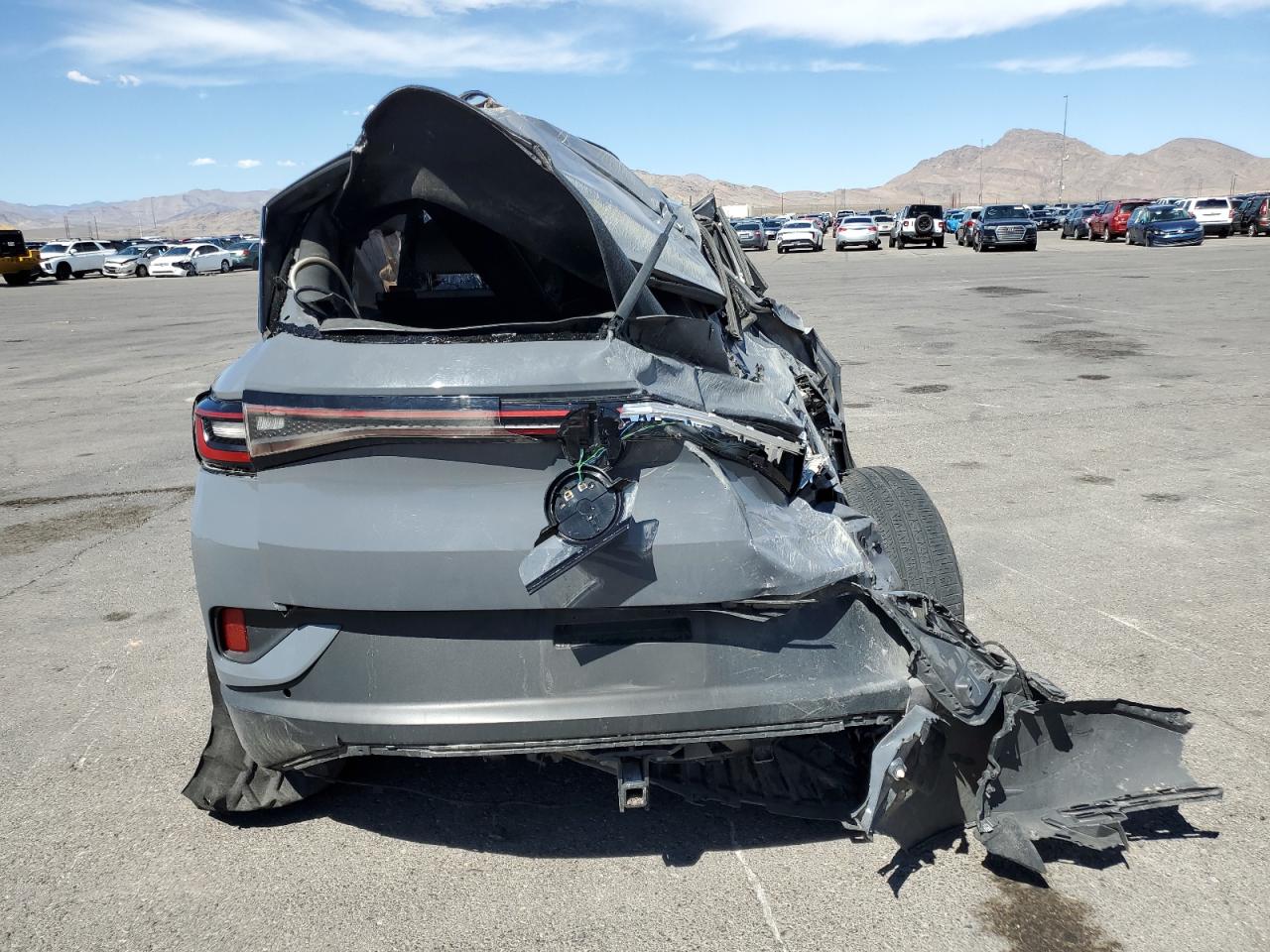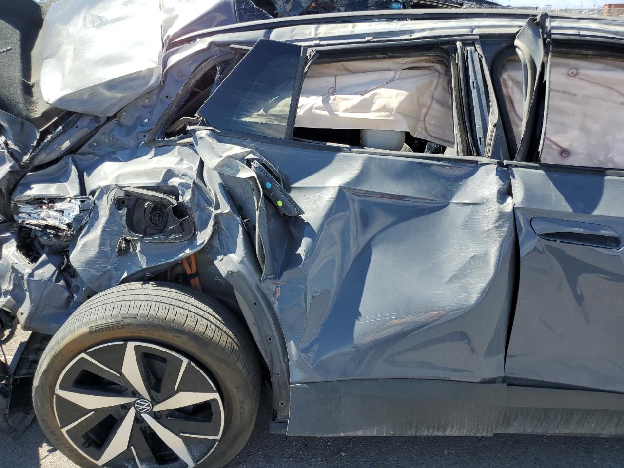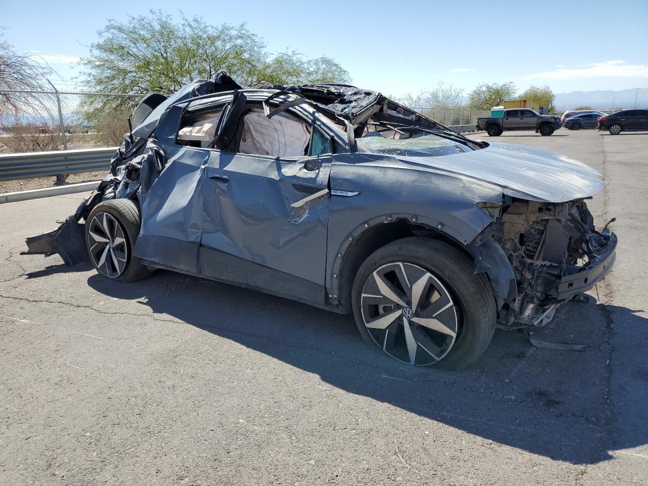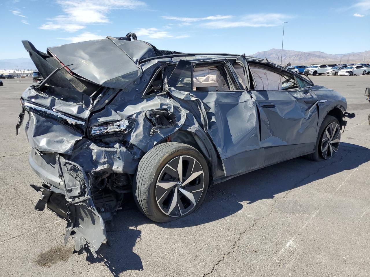 PoorThe 2023 VOLKSWAGEN ID.4 PRO S in gray has sustained extensive damage. The primary damage is all over the body, with no apparent secondary damage. The car's body panels are severely crushed, with significant deformation to the roof, front, and sides. The wheels appear to be damaged or at least impacted. The lights are likely damaged. All the glasses are shattered and missing. The interior has damage and deployed airbags. The car is not drivable.