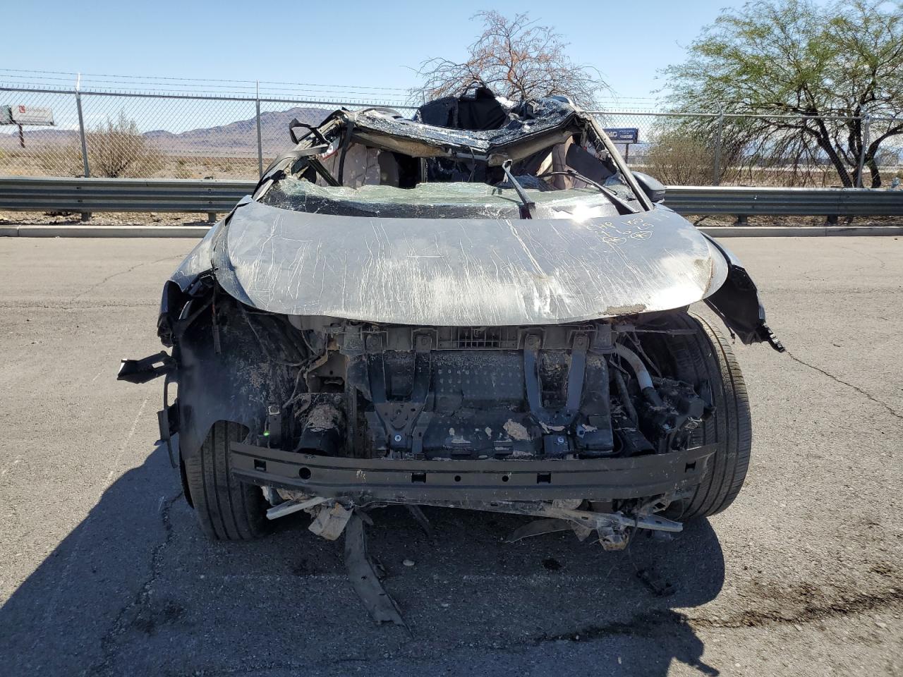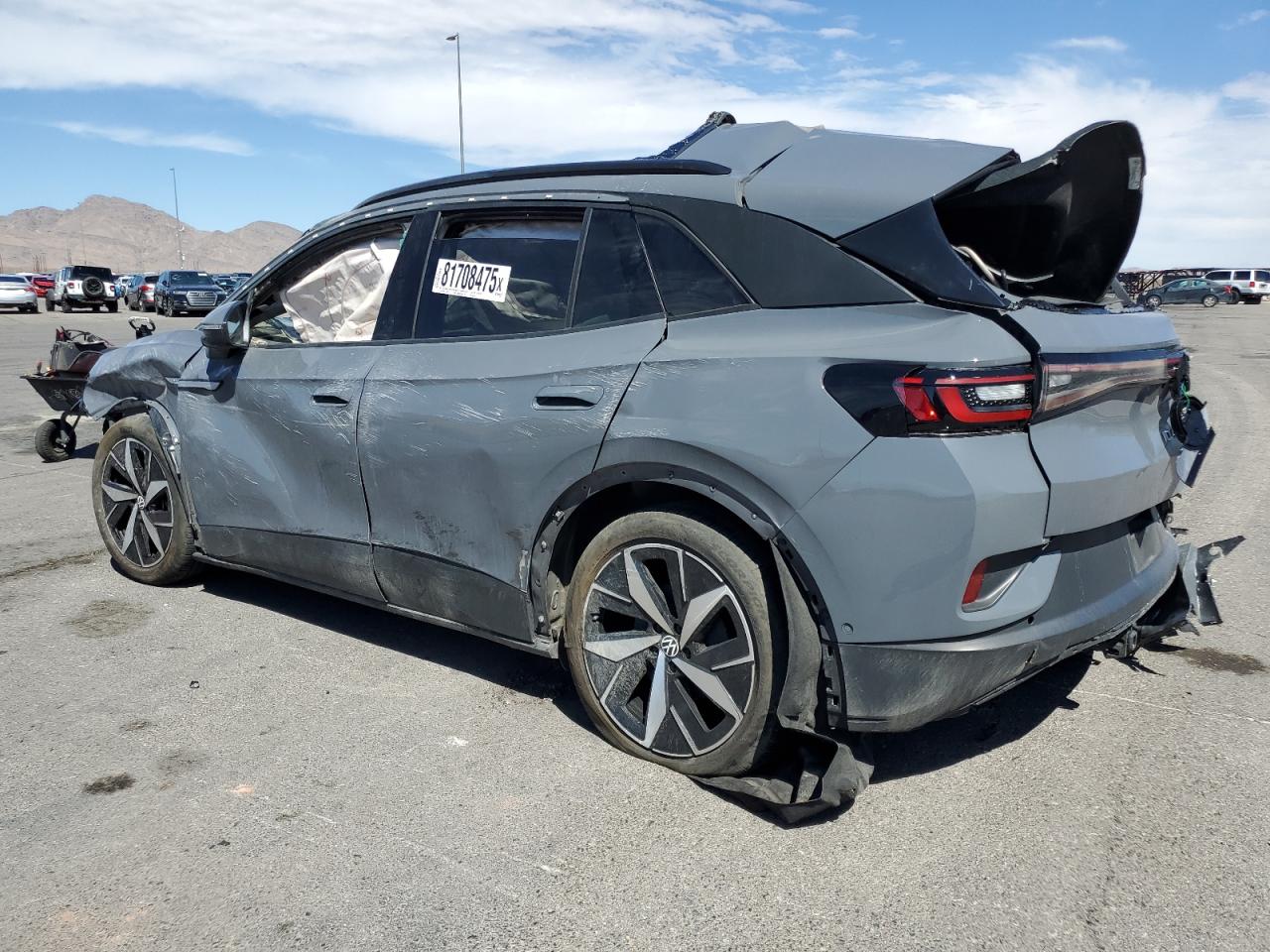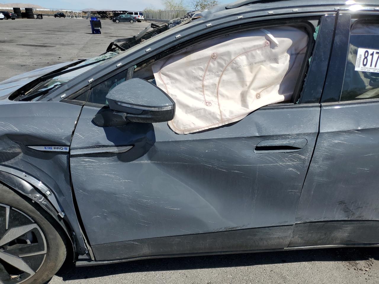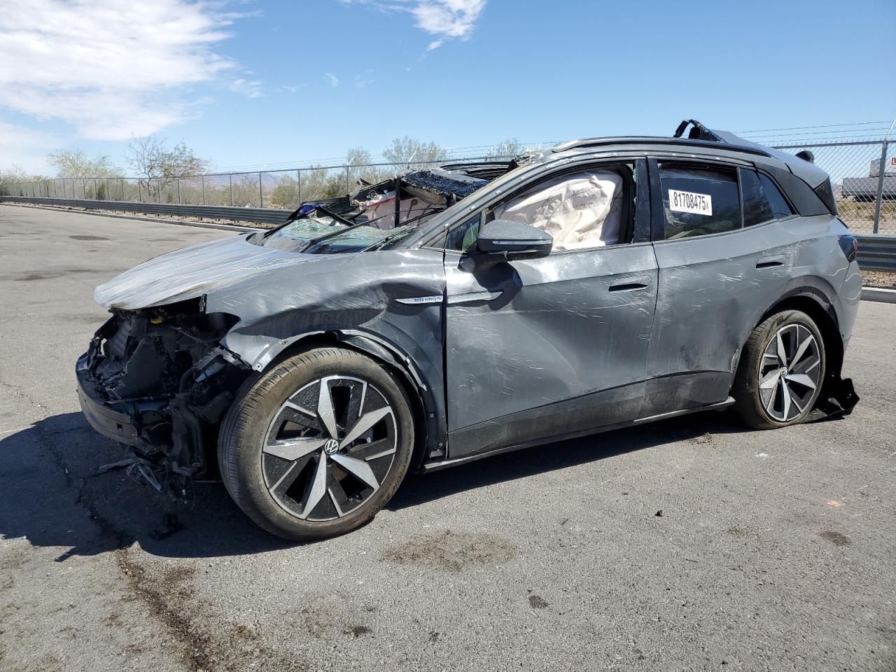 PoorThe 2023 VOLKSWAGEN ID.4 PRO S in gray has sustained extensive damage. The primary damage is all over the body, with no apparent secondary damage. The car's body panels are severely crushed, with significant deformation to the roof, front, and sides. The wheels appear to be damaged or at least impacted. The lights are likely damaged. All the glasses are shattered and missing. The interior has damage and deployed airbags. The car is not drivable.