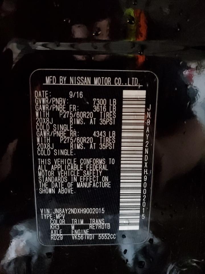 FairThis is a 2017 NISSAN ARMADA SV, black in color. The vehicle has suffered front-end damage, classifying the primary damage as FRONT END. The car's start code indicates it is Run & Drive Verified. The interior appears to be in good condition. The airbag is not deployed. **Damage and Overall State Analysis:** The vehicle's front end has sustained damage, affecting the lights, front bumper, and potentially other components. The paint appears to be in good condition. The interior is in Very Good condition. Wheels seem intact. Overall, the vehicle is drivable but needs repair. **Damage List:** * Front end damage **Parts to Buy:** * Front Bumper * Lights