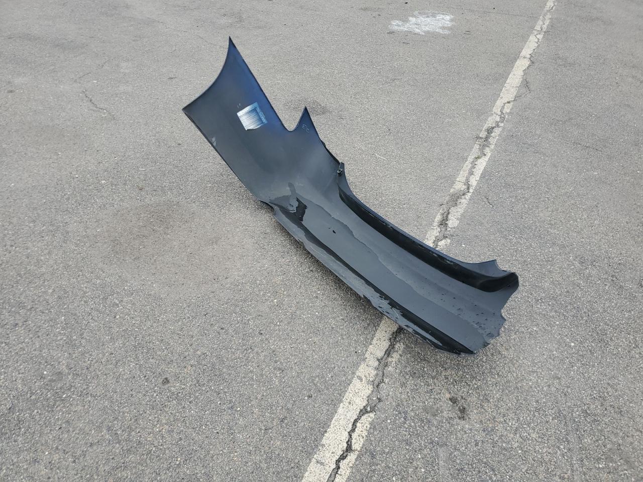 The car has sustained extensive damage from a rear-end collision and side impact. The rear and side body panels are severely damaged. Both rear tires are flat. The car is missing the rear bumper.
