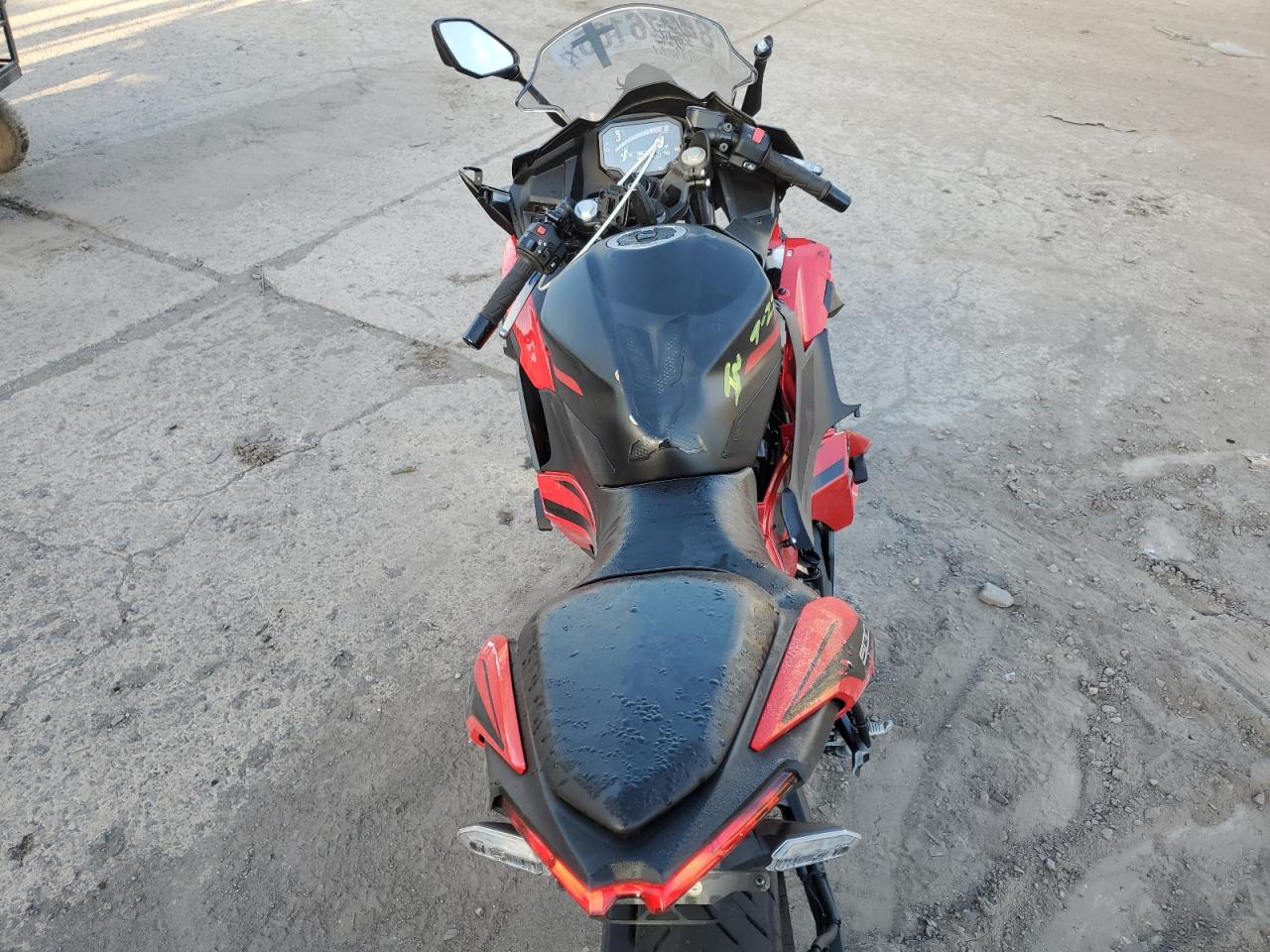 FairThis is a KAWASAKI EX500 A 2025. The primary damage is to the front end and secondary damage to the side. The color of the bike is red. The bike has sustained significant damage, primarily to the front, with visible deformation of body panels and components. The front fairing, headlight assembly, and front forks show considerable damage. The side panels also exhibit damage. The wheels appear to be intact, but the overall structural integrity is compromised. The interior shows minimal damage and the airbag is not deployed.