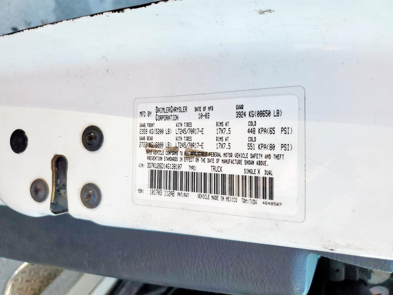 FairThe 2004 Dodge Ram 2500 ST is a white pickup truck. Primary damage is to the rear end. The truck's overall condition suggests moderate wear and tear, with noticeable damage. The interior shows signs of use. This vehicle is Run & Drive Verified.