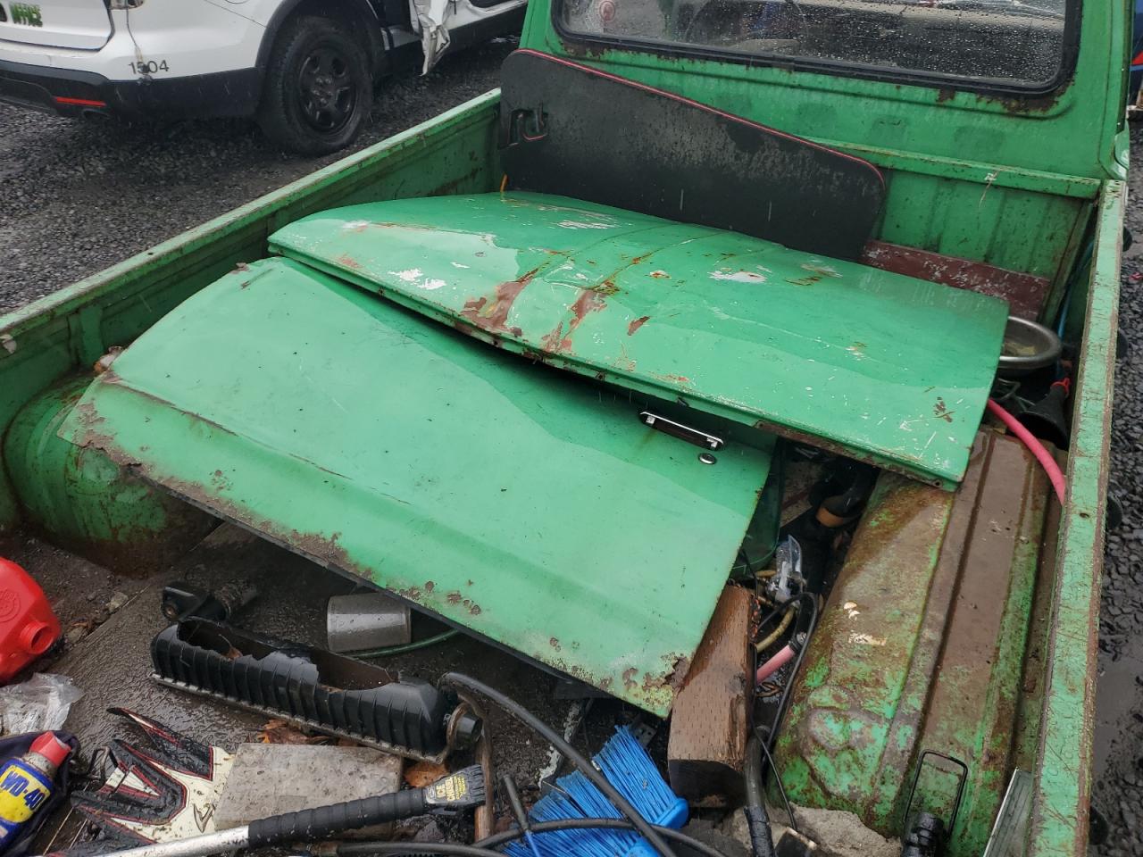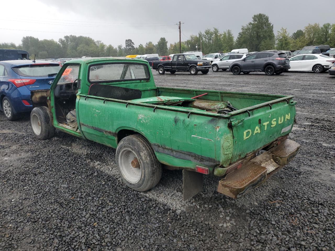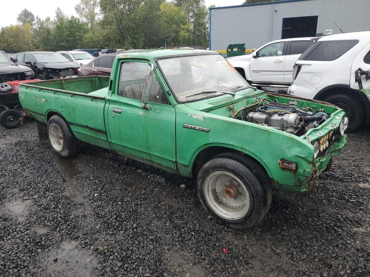 Poor1975 Datsun Pickup: Severe vandalism and stripping have left this green truck in a state of disrepair. The body panels show significant damage, and the interior is heavily stripped. The wheels are present but the overall condition suggests a need for extensive restoration. The truck is not drivable.