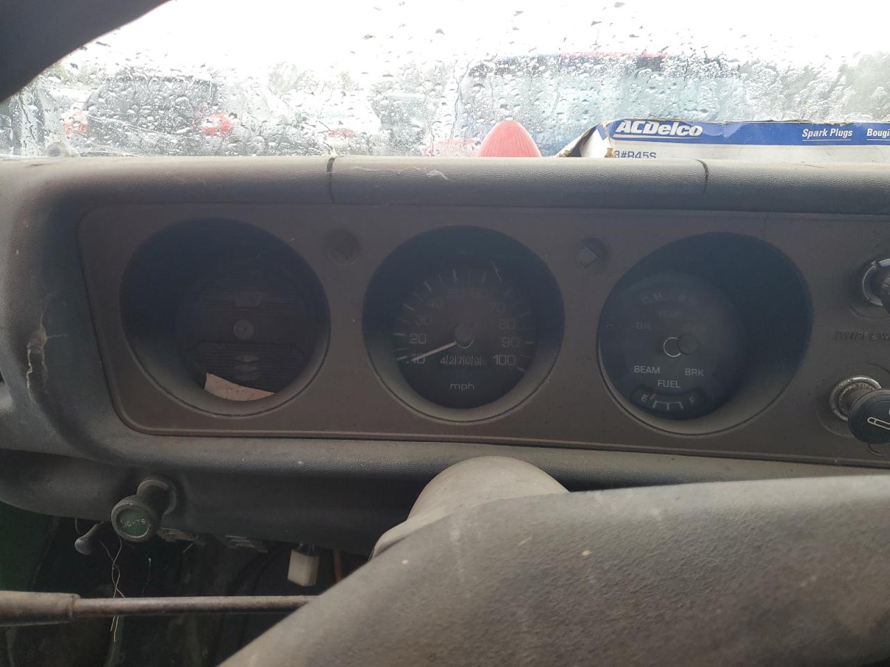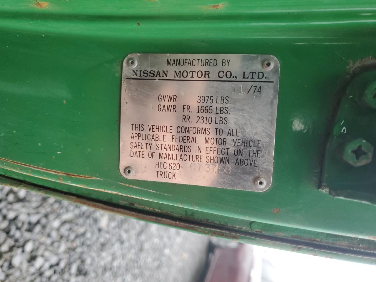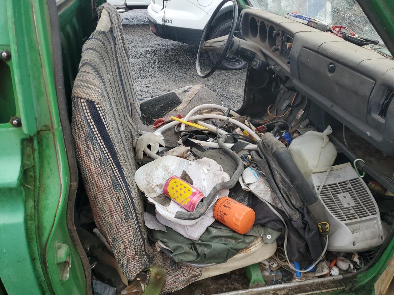 Poor1975 Datsun Pickup: Severe vandalism and stripping have left this green truck in a state of disrepair. The body panels show significant damage, and the interior is heavily stripped. The wheels are present but the overall condition suggests a need for extensive restoration. The truck is not drivable.