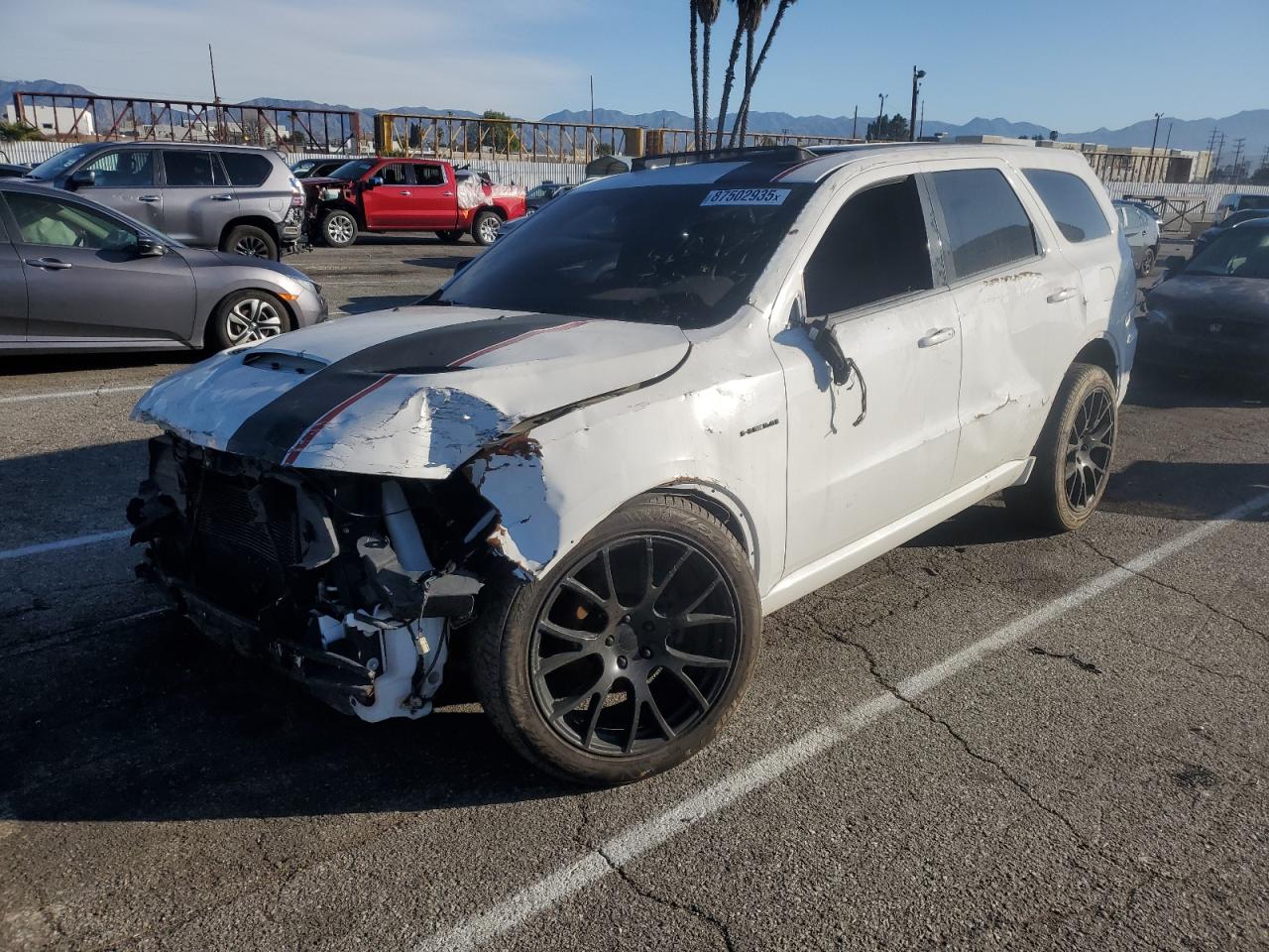PoorDODGE DURANGO R/T 2021 - Salvage Vehicle. This white SUV exhibits extensive damage. The body panels are severely compromised across multiple areas, indicating a major impact. The undercarriage also shows signs of damage. Interior is heavily soiled and possibly damaged and the airbags may have deployed. This car is suitable for parts or restoration.