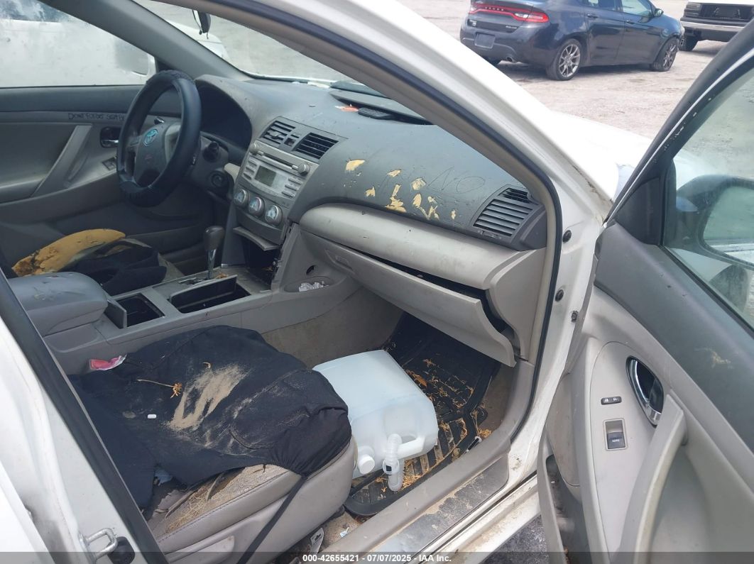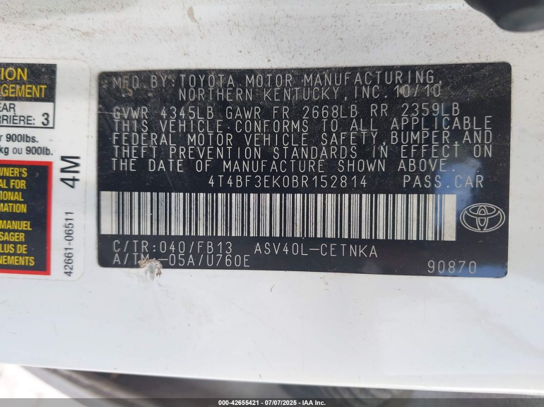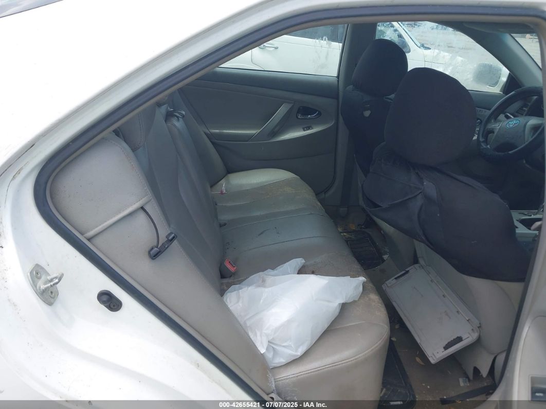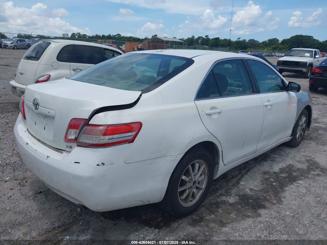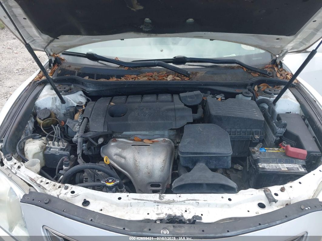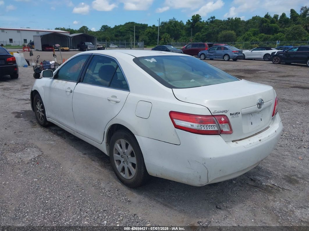 FairThis 2011 Toyota Camry LE is white and shows signs of front and rear body damage. The front bumper and quarter panel have visible damage, while the rear has a dent. The car is drivable and starts, indicating a functional engine and transmission. The interior shows wear and tear, with no immediate airbag deployment visible. The wheels appear intact. The lights and glasses seem to be fine. This vehicle is a suitable candidate for repair.