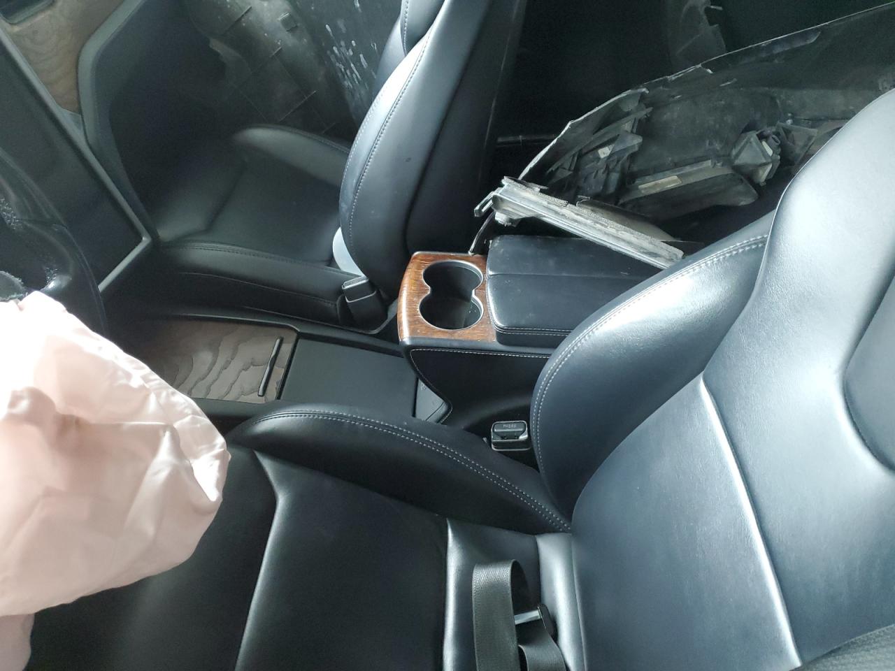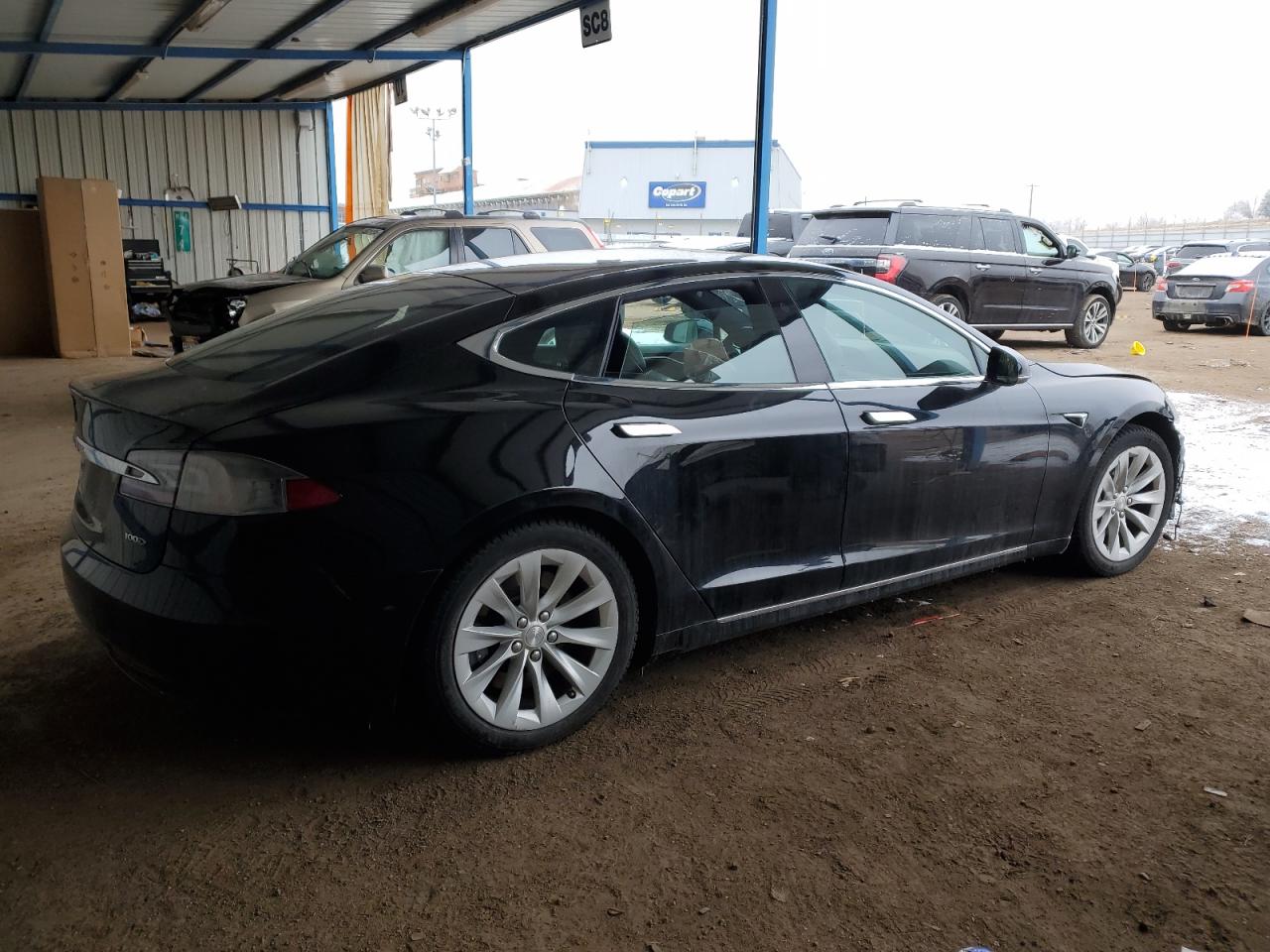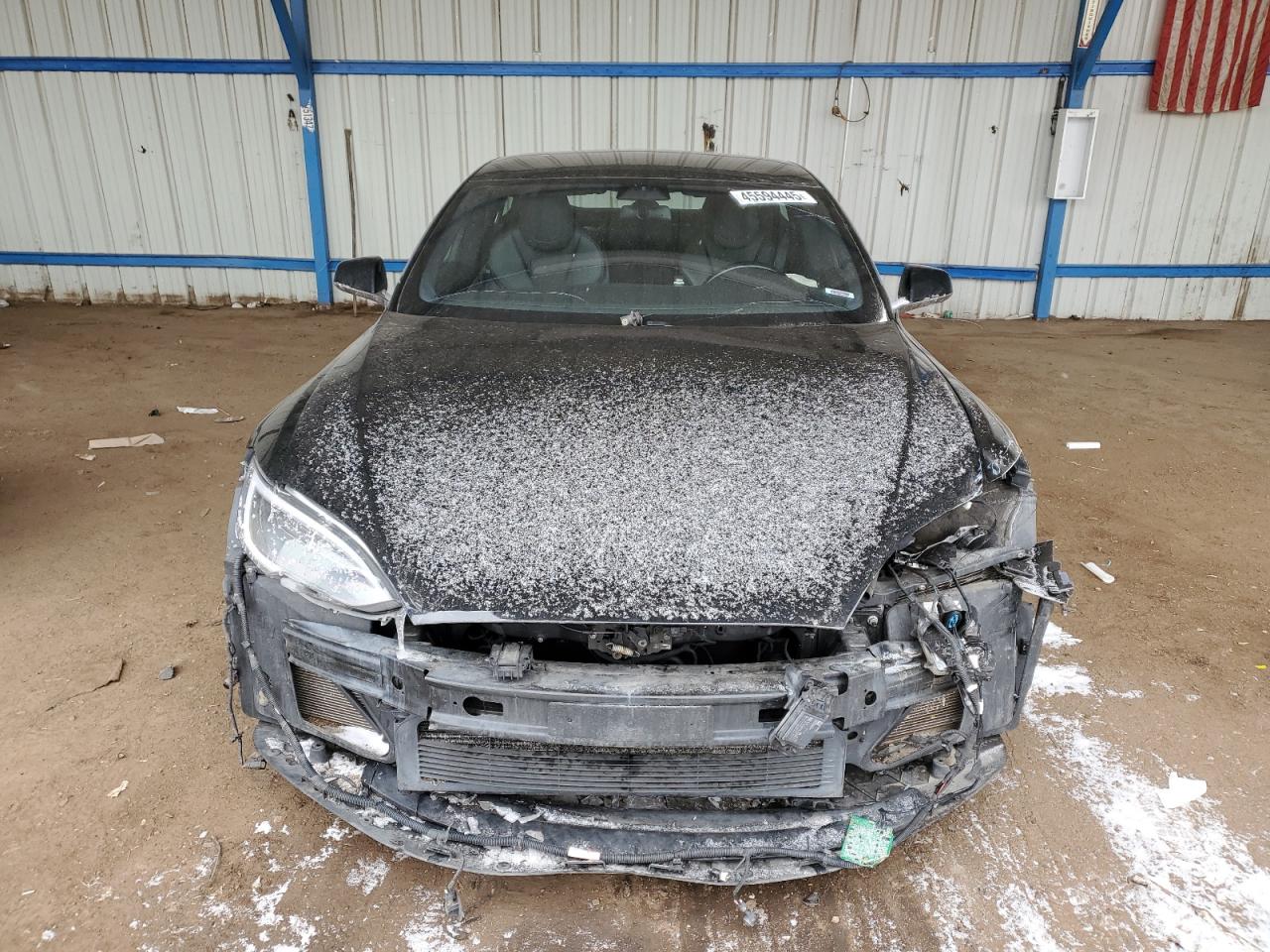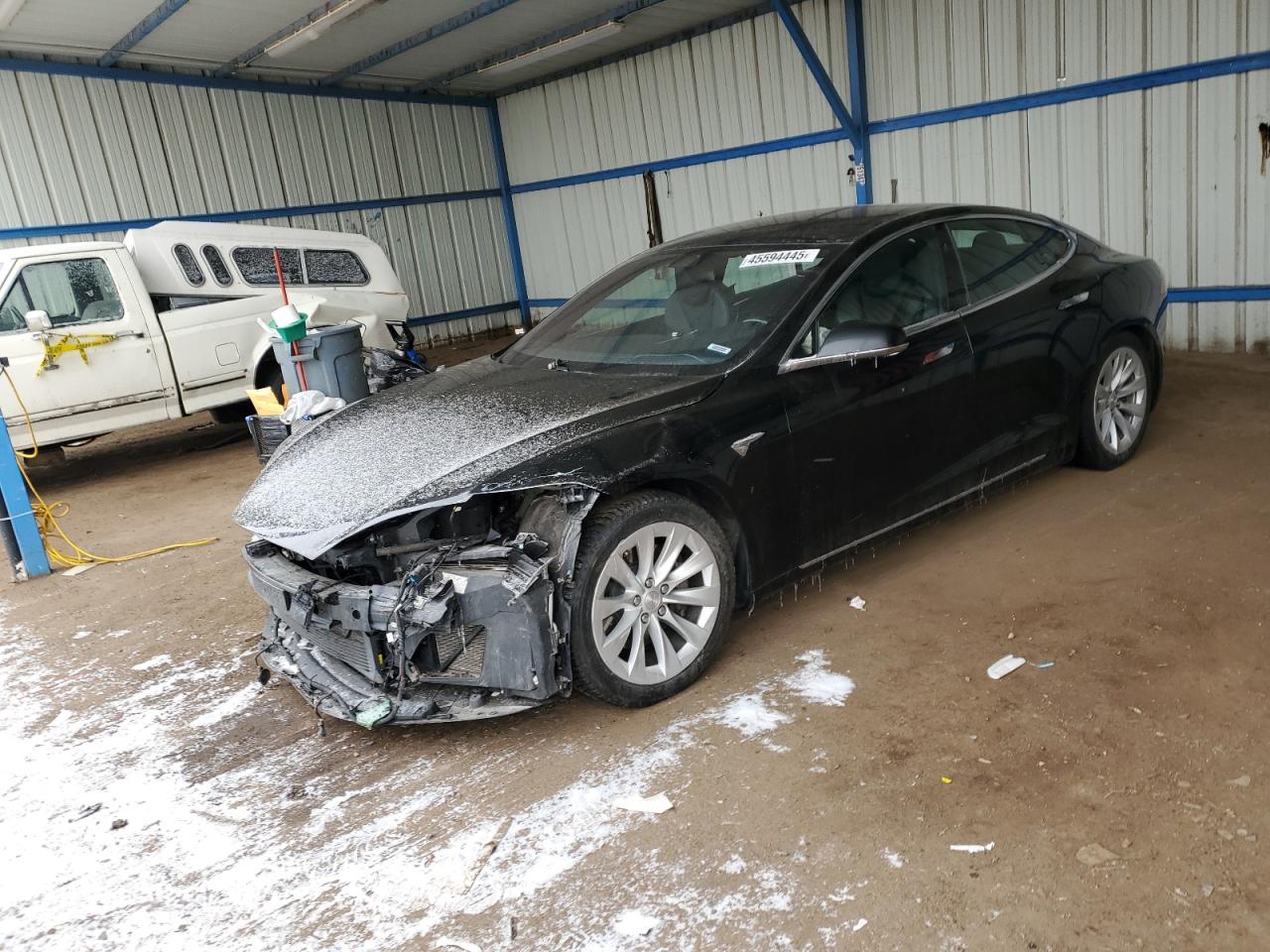 Fair2018 Tesla Model S in black with significant front-end damage. The vehicle appears to have sustained impact damage to the front end, including the bumper, hood, and potentially structural components. The airbags have deployed, indicating a significant collision. The interior shows signs of wear. The vehicle is likely in need of considerable repair.