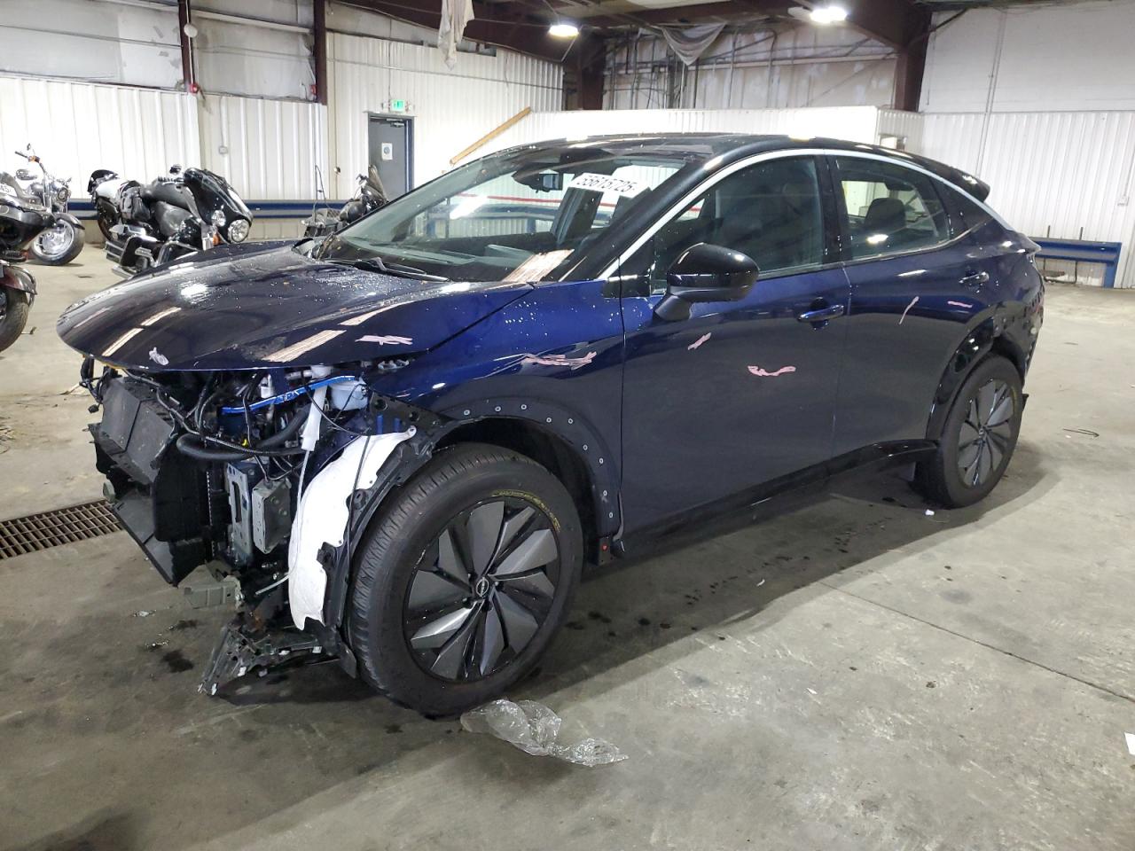 FairThe 2024 Nissan Ariya EVOL is a blue electric SUV with front and rear-end damage. The front end has significant damage, including the bumper and front panels. The rear end shows damage to the bumper and potentially the body panels. Interior appears to be in good condition with some wear and tear. This vehicle starts and runs.