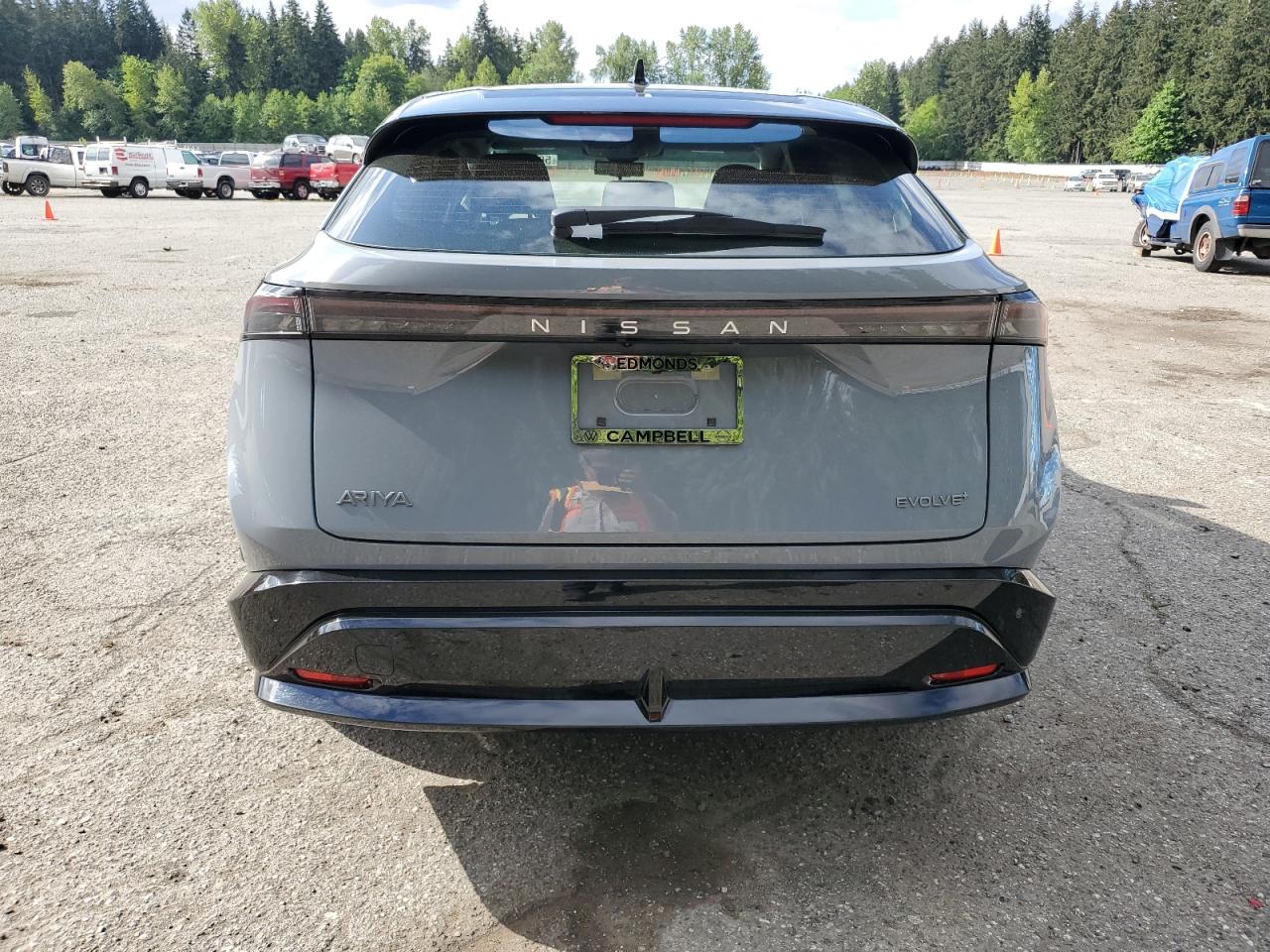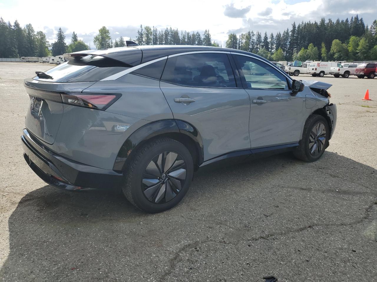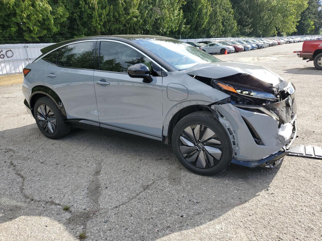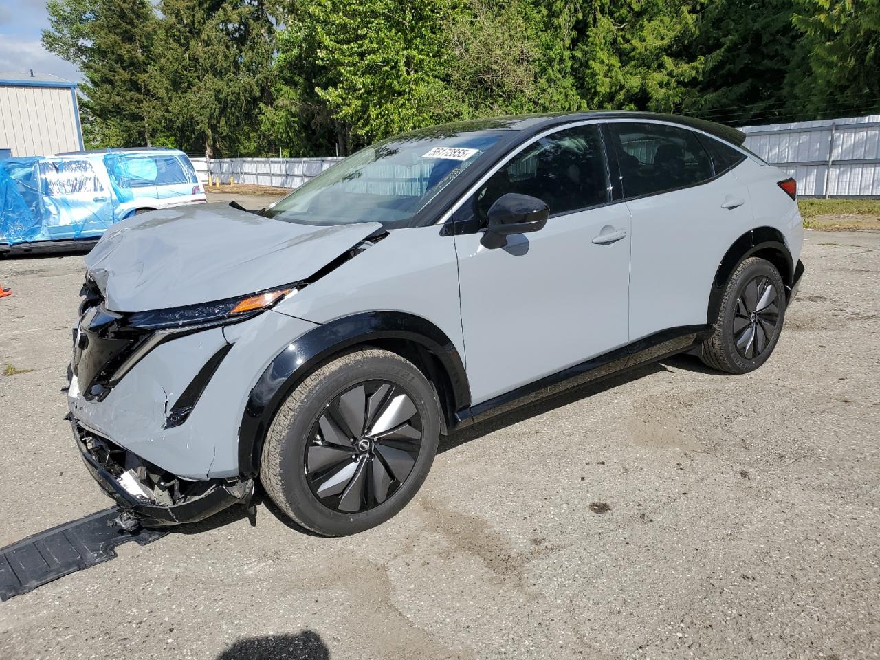 FairThe 2024 NISSAN ARIYA EVOL, a gray electric vehicle, has sustained significant front-end damage. The front bumper, hood, and surrounding body panels exhibit considerable damage, indicative of a collision. The wheels appear intact. The interior shows deployed airbags and other damage. The car is drivable. The car has headlight system error and the overall condition is poor.