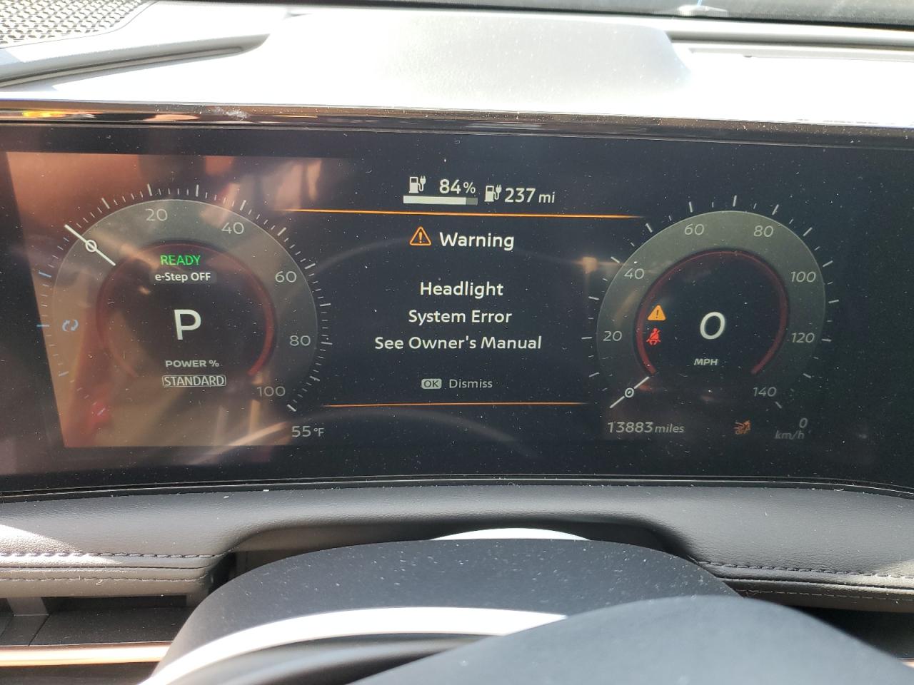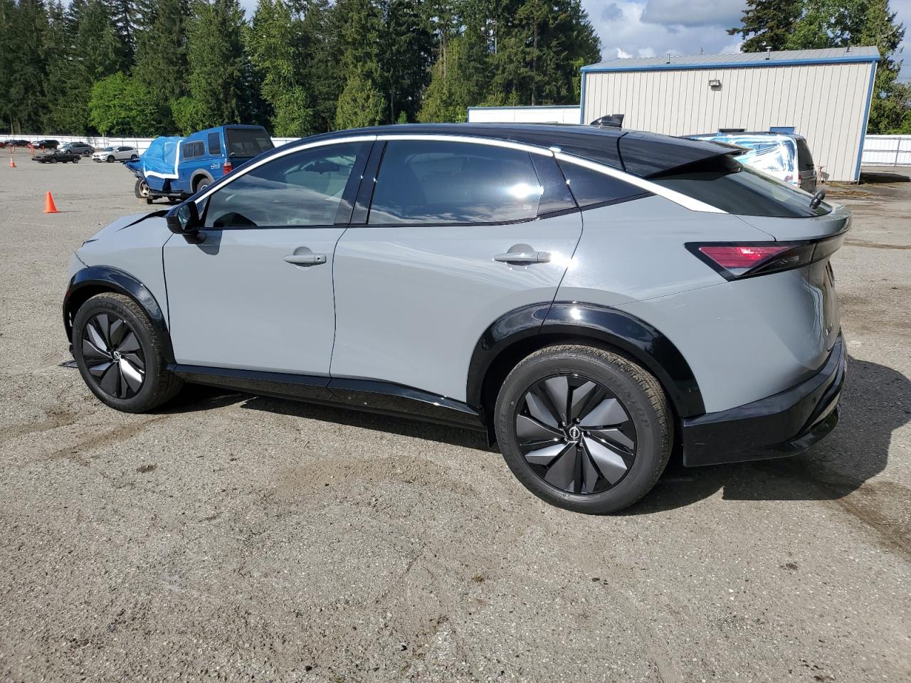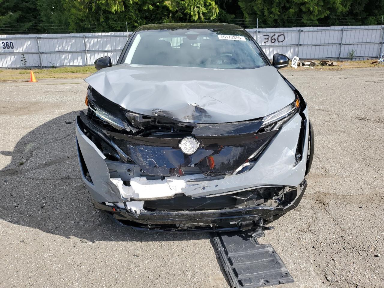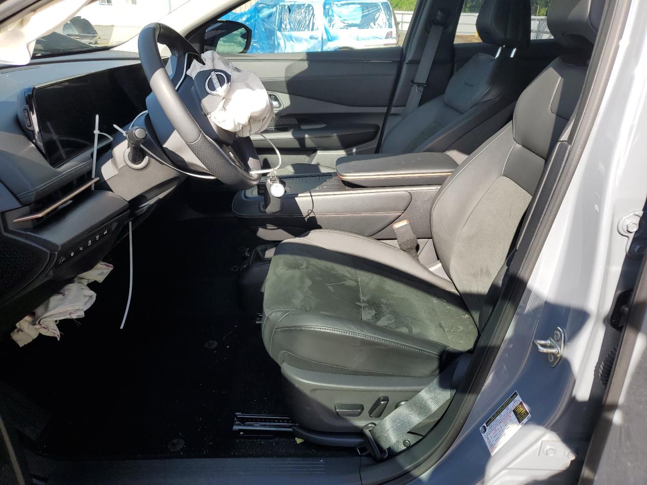 FairThe 2024 NISSAN ARIYA EVOL, a gray electric vehicle, has sustained significant front-end damage. The front bumper, hood, and surrounding body panels exhibit considerable damage, indicative of a collision. The wheels appear intact. The interior shows deployed airbags and other damage. The car is drivable. The car has headlight system error and the overall condition is poor.