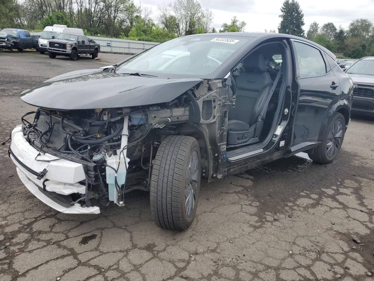 FairThis is a 2023 NISSAN ARIYA EVOL, black in color, with Run & Drive Verified status. The primary damage is to the side, with no secondary damage reported. The car's exterior condition is assessed as Fair, with visible body damage. Interior condition is Very Good. The car has significant visible damage, particularly to the front, with the front bumper and some body panels missing. The wheels appear to be intact. The lights and glasses look mostly intact. The interior seems to have minimal damage, airbag are not deployed.