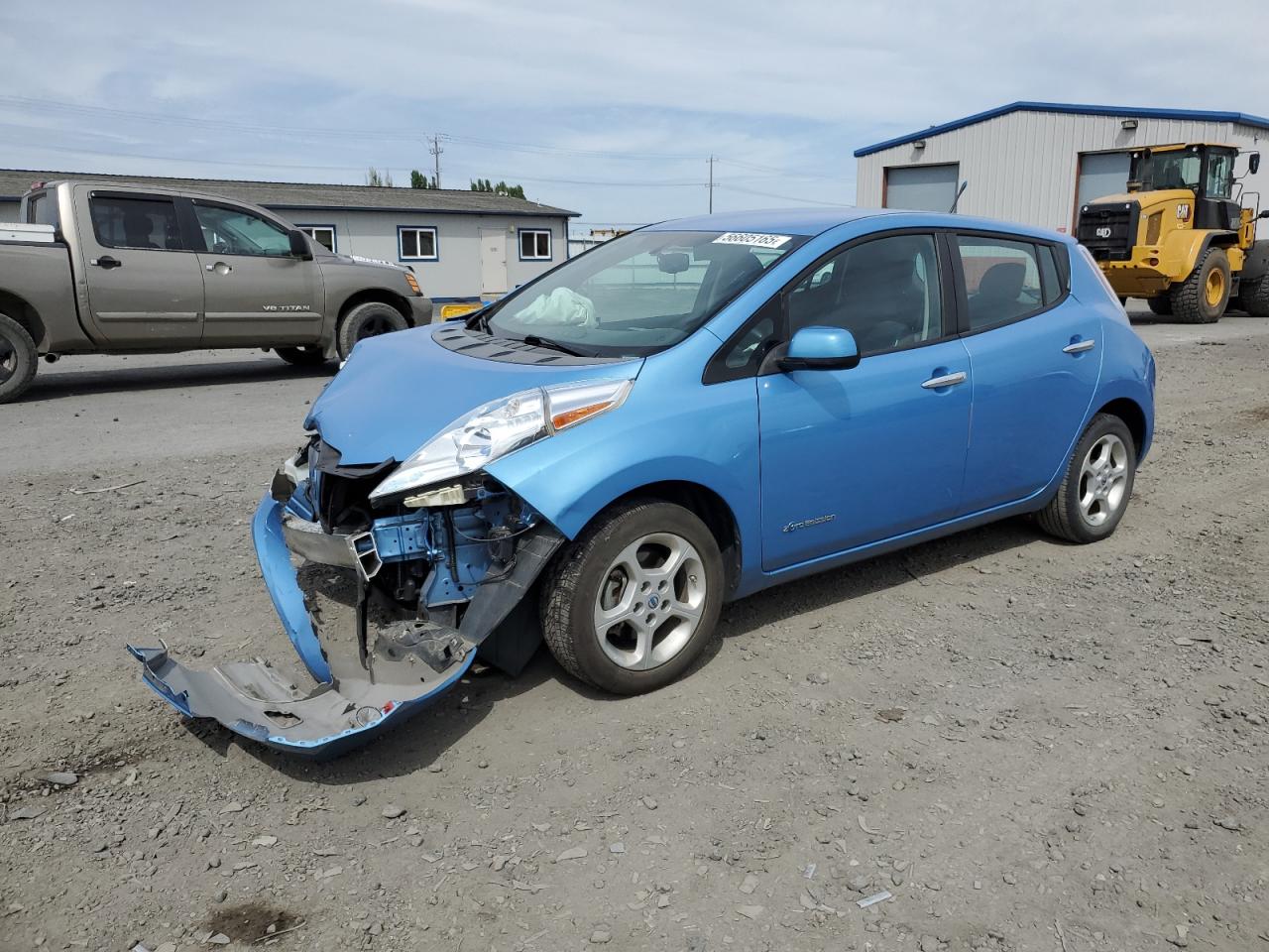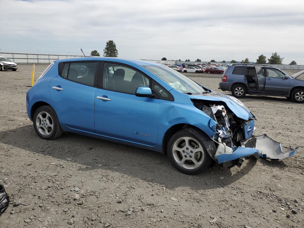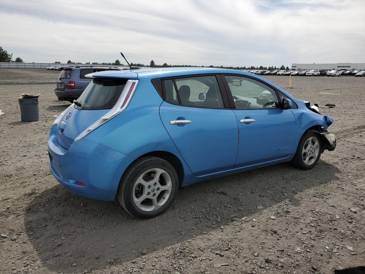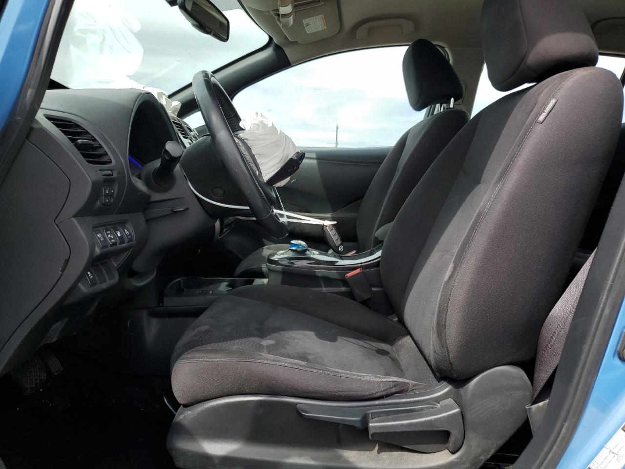 FairThis is a 2013 NISSAN LEAF S. The car is blue and has sustained front-end damage in a collision. The airbags deployed during the accident. The vehicle starts and runs, as indicated by the 'Run & Drive Verified' status. The interior shows some wear and tear, consistent with the age and mileage. The glass appears to be intact, and the wheels are in good condition. The car itself is an all-electric compact hatchback, known for its efficiency and eco-friendly nature.