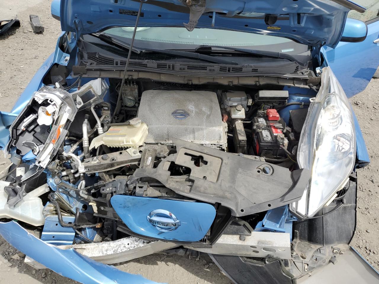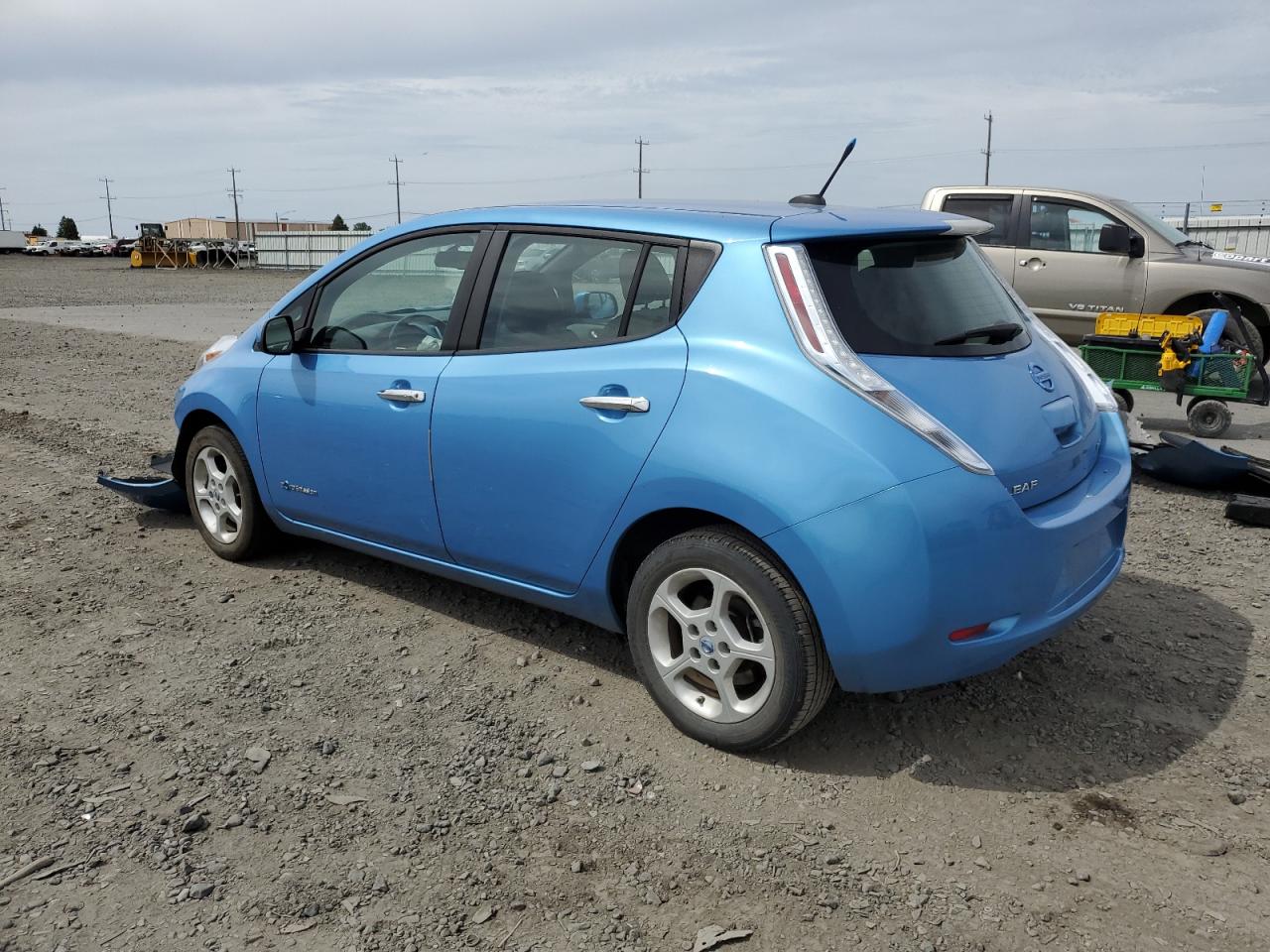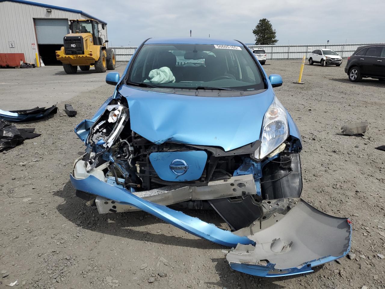 FairThis is a 2013 NISSAN LEAF S. The car is blue and has sustained front-end damage in a collision. The airbags deployed during the accident. The vehicle starts and runs, as indicated by the 'Run & Drive Verified' status. The interior shows some wear and tear, consistent with the age and mileage. The glass appears to be intact, and the wheels are in good condition. The car itself is an all-electric compact hatchback, known for its efficiency and eco-friendly nature.