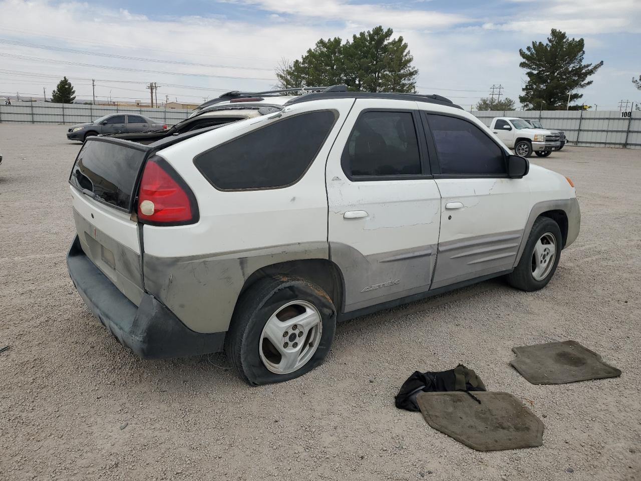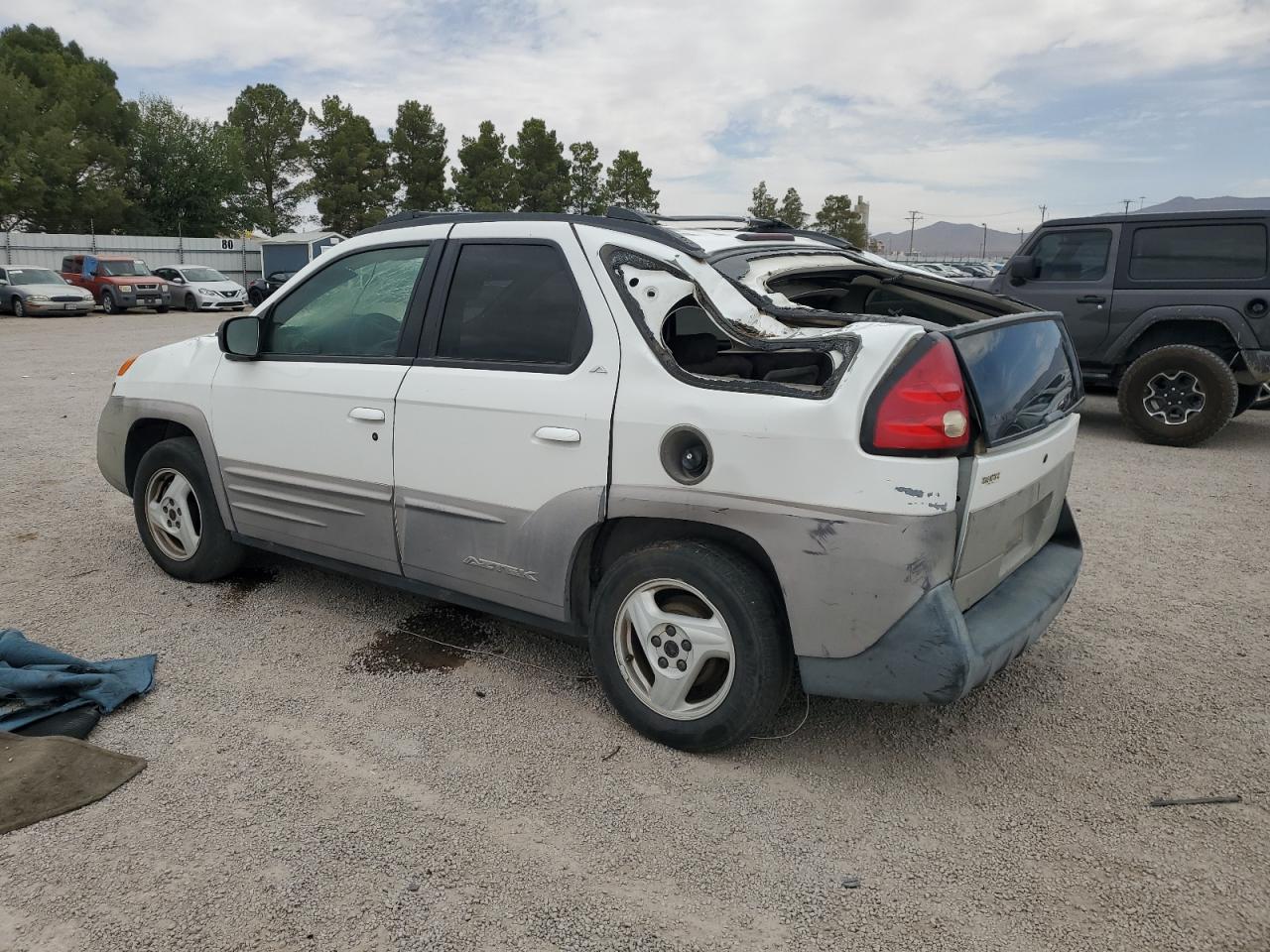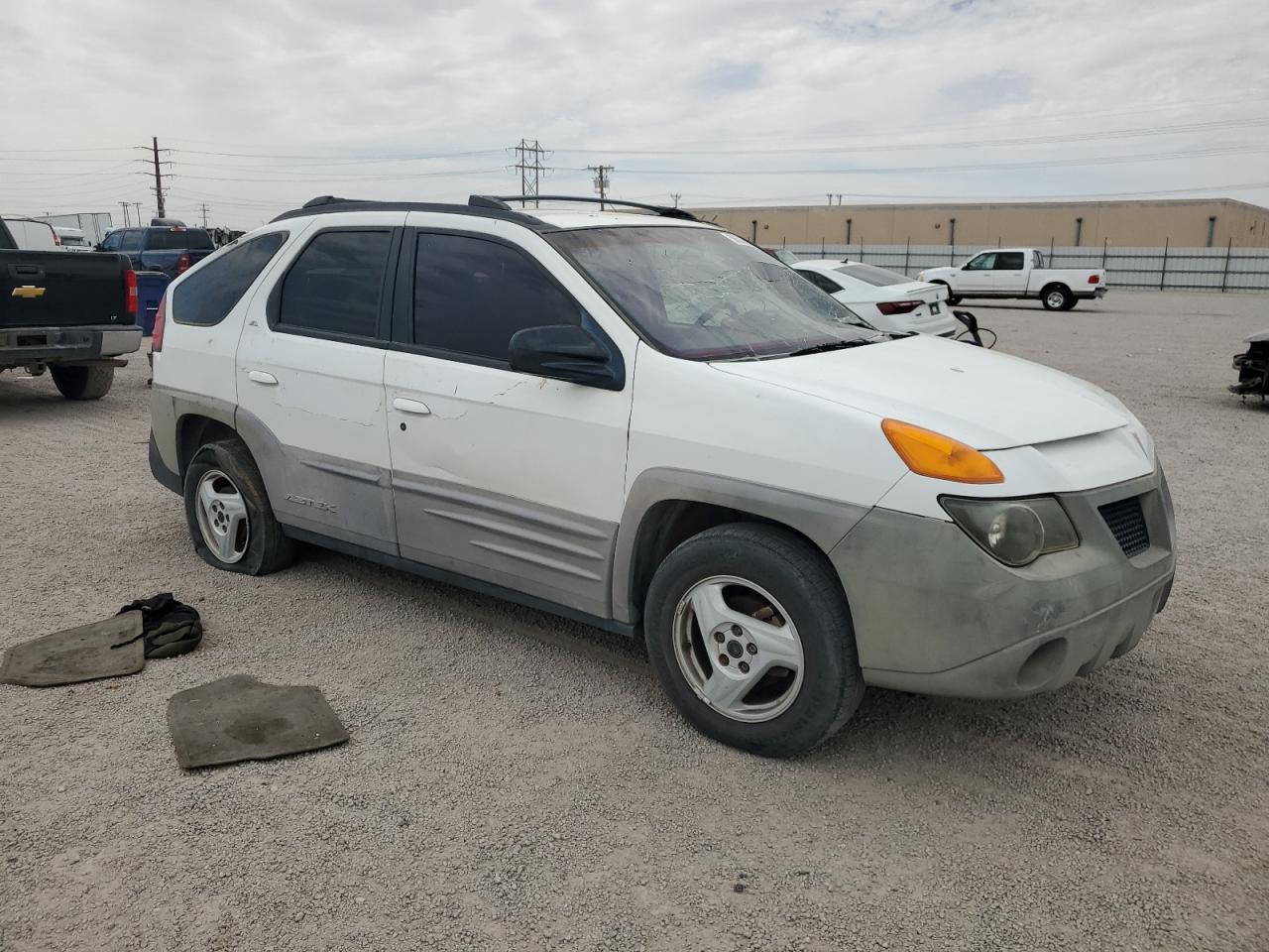 PoorThe 2001 Pontiac Aztek, a white SUV, shows significant damage. The primary damage is all over the body, and the secondary damage is mechanical. The vehicle starts. The car has visible damage to the body and the roof is open. The interior shows damage to the seats and dashboard. The wheels appear to be in good condition but the car has a lot of issues and requires considerable repair, it is not drivable. Pontiac Aztek is known for its distinctive and unconventional design.