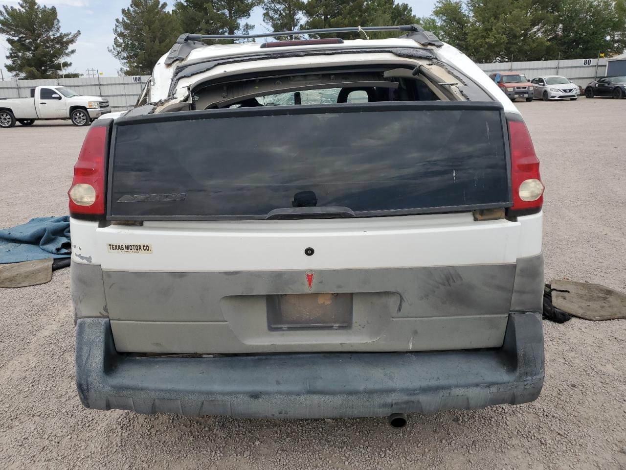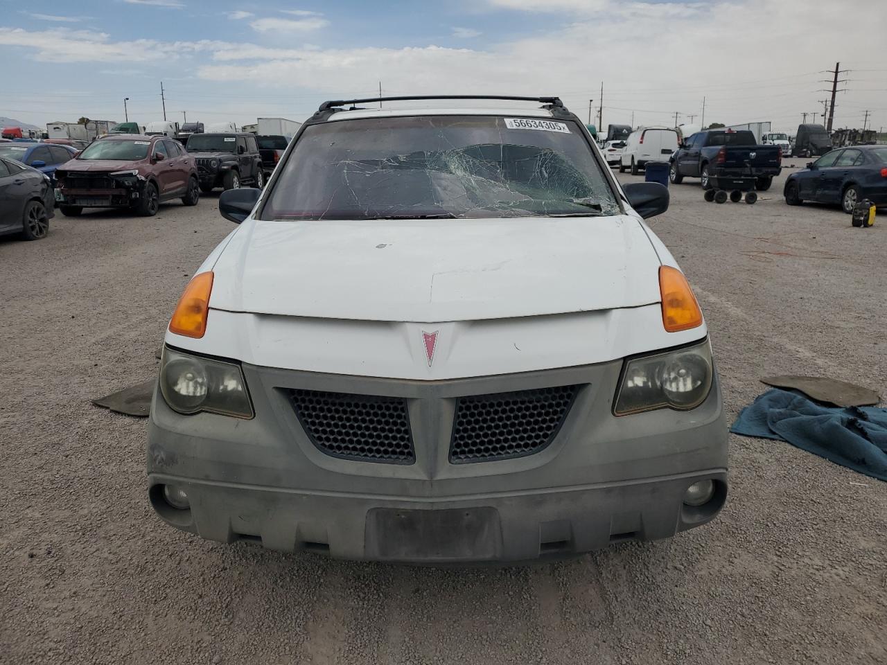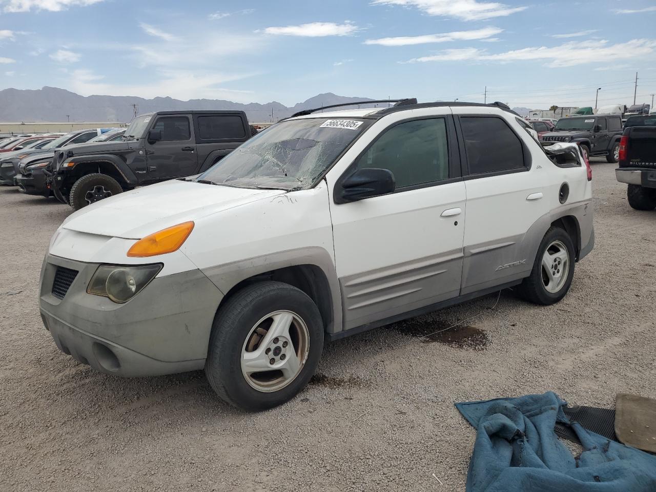 PoorThe 2001 Pontiac Aztek, a white SUV, shows significant damage. The primary damage is all over the body, and the secondary damage is mechanical. The vehicle starts. The car has visible damage to the body and the roof is open. The interior shows damage to the seats and dashboard. The wheels appear to be in good condition but the car has a lot of issues and requires considerable repair, it is not drivable. Pontiac Aztek is known for its distinctive and unconventional design.